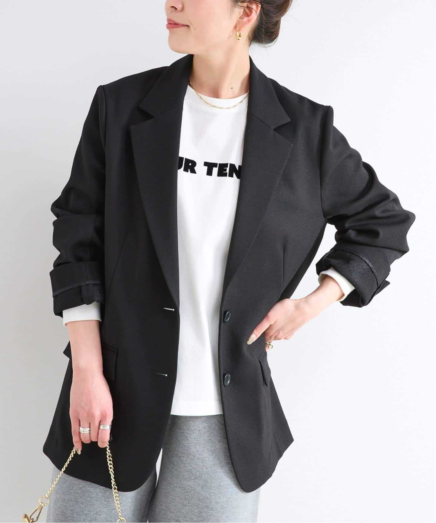 シンプルな装いにさっと重ねるだけで、今っぽいバランスが完成します。