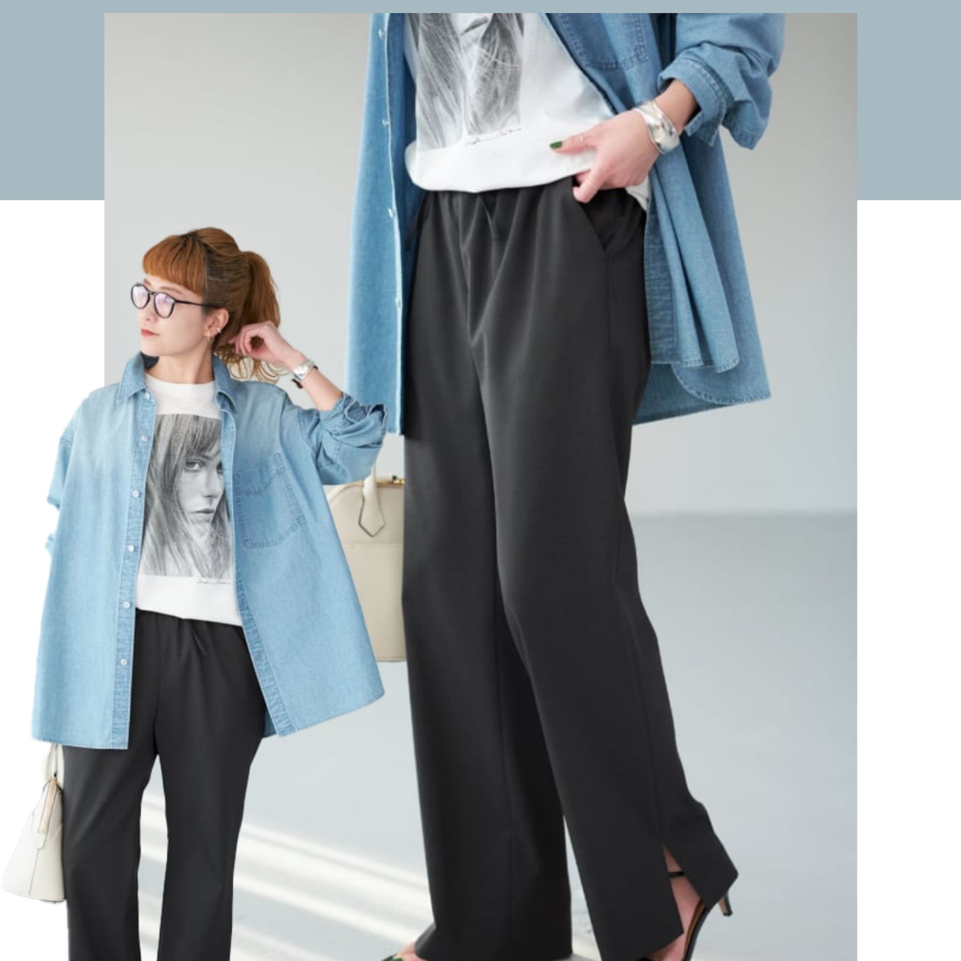 裾スリットが抜け感を演出する、きれい見えイージーパンツ。