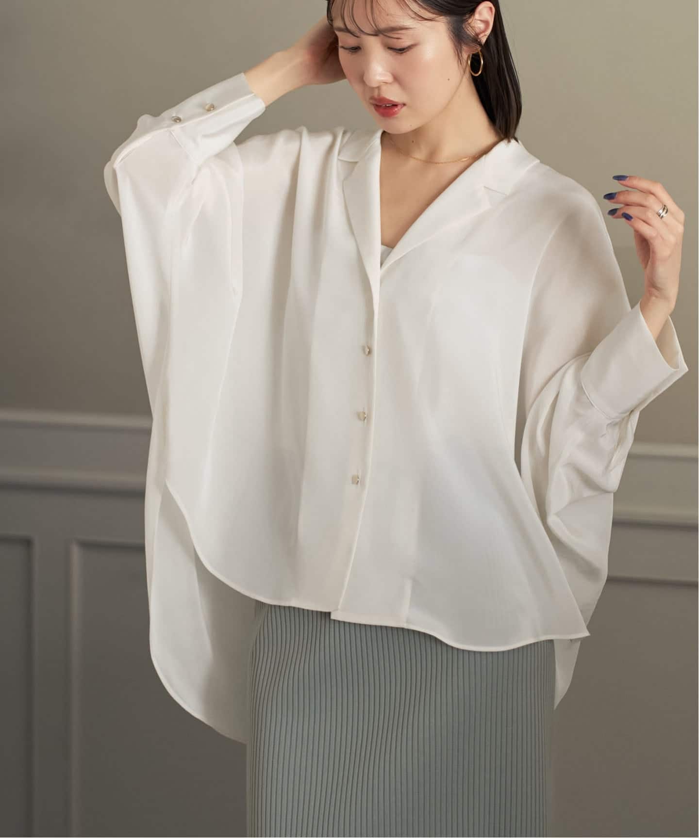 身頃と袖が繋がるようなニュアンスたっぷりのシルエットは、こなれた印象を与えてくれるうえに羽織りとしてのバランスを取りやすいのが◎