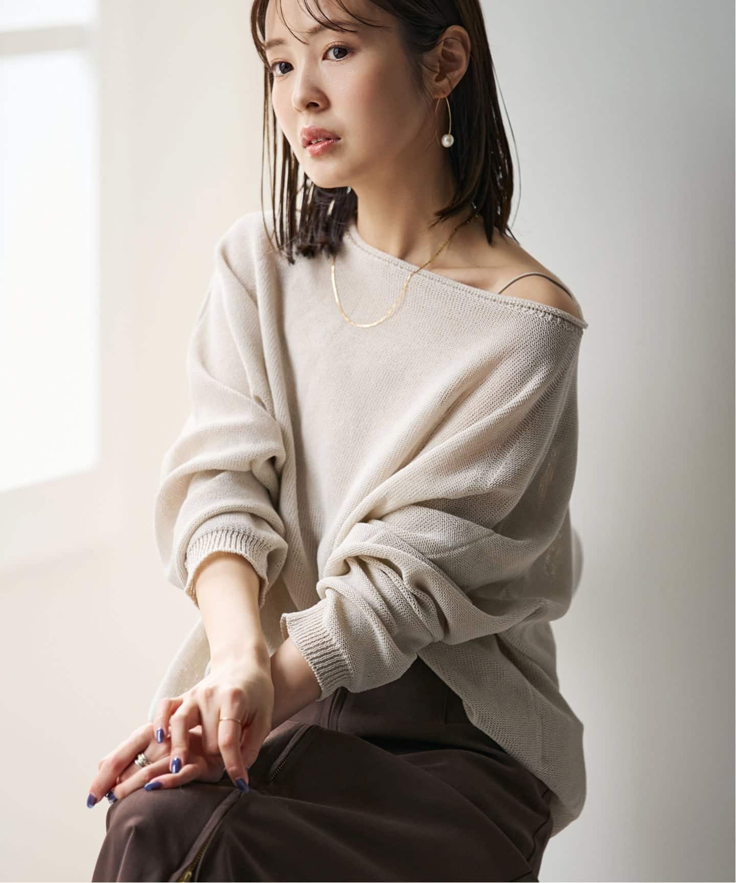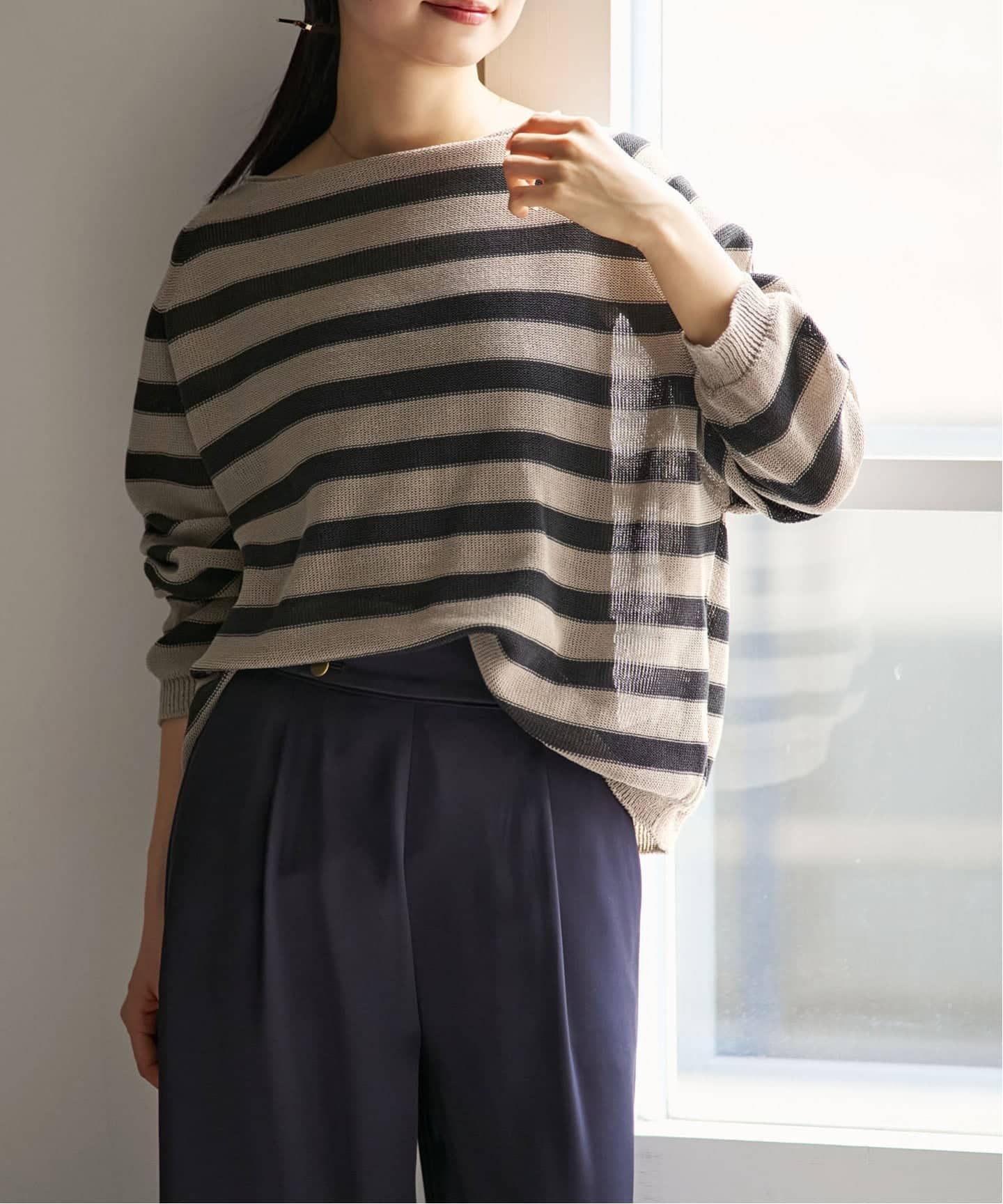 女性らしさを引き立ててくれる広めのネックラインは肩を落としてワンショルダー風にも着られ、その日の気分に合わせてアレンジも楽しめます。