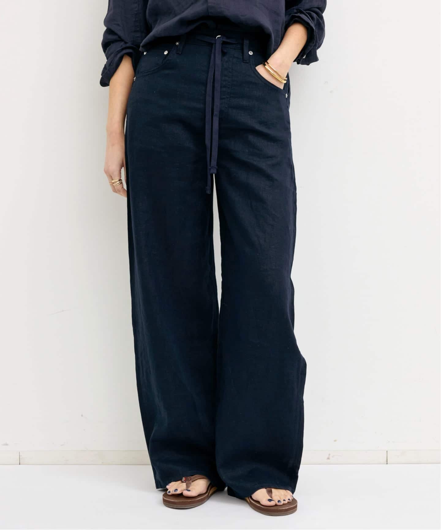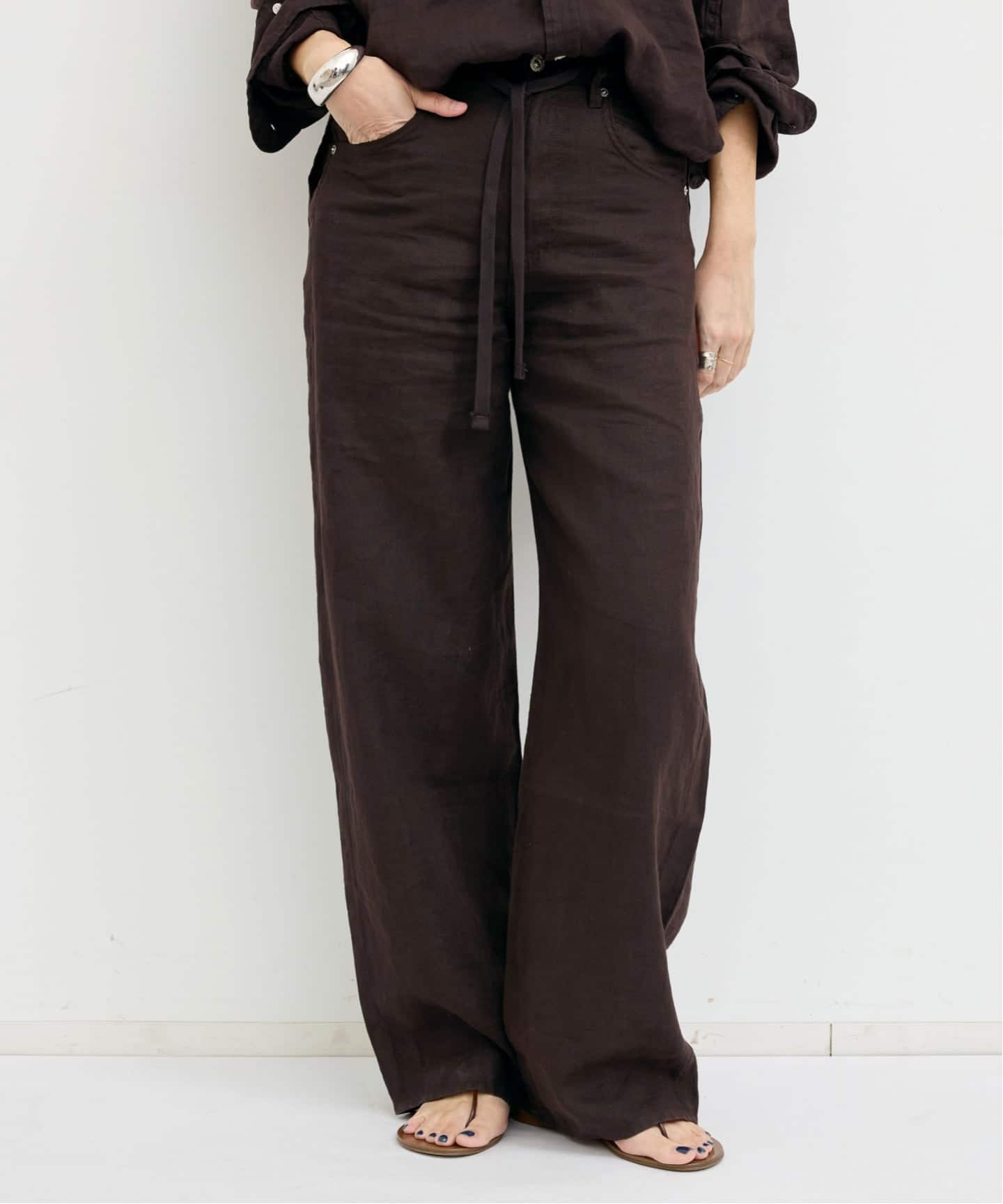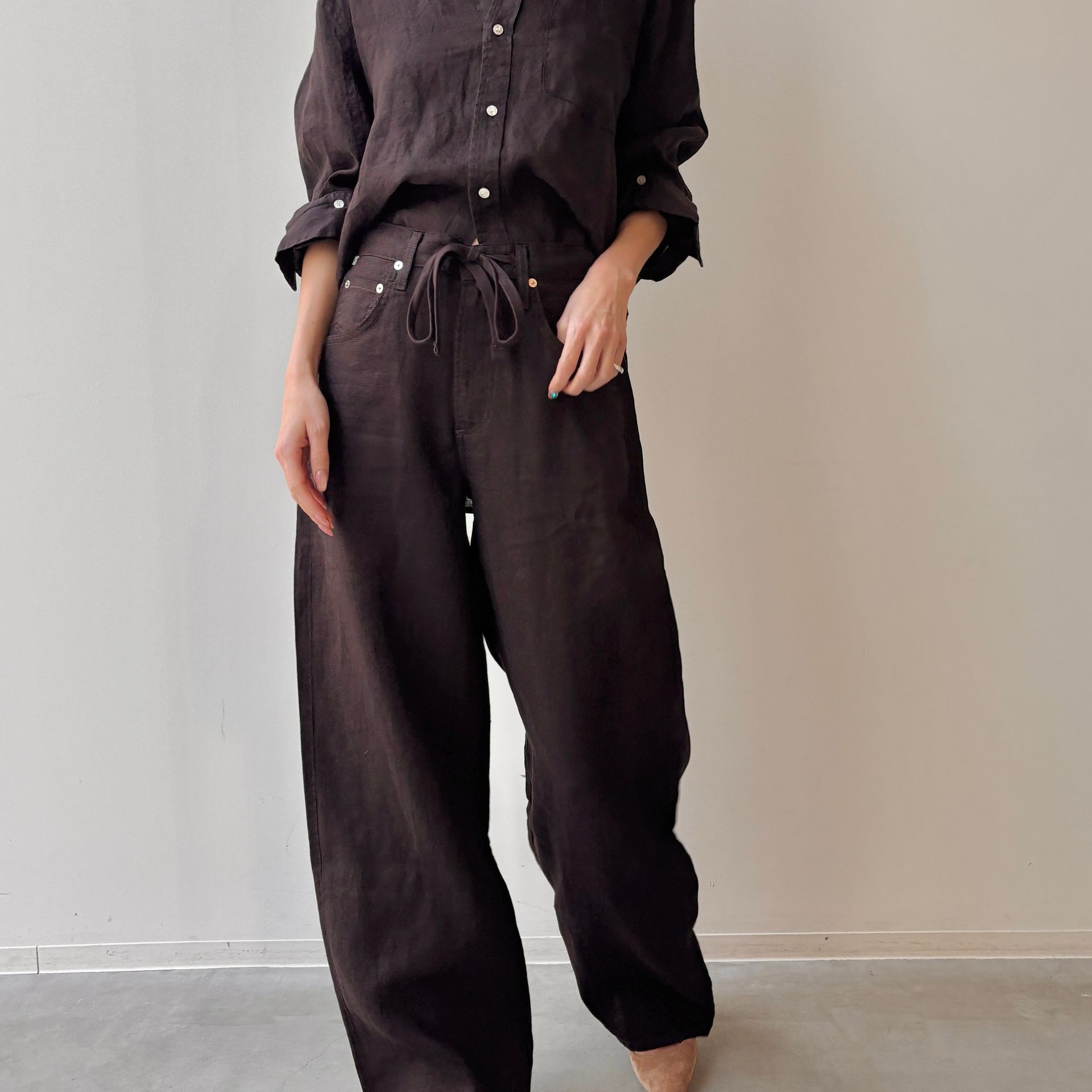 ゆったりとしたフィット感とドローストリングデザインで、ストレスフリーな穿き心地のリネンパンツ。デニムブランドらしいさりげないディテールが、気取りすぎないヘルシーな雰囲気を演出してくれます。