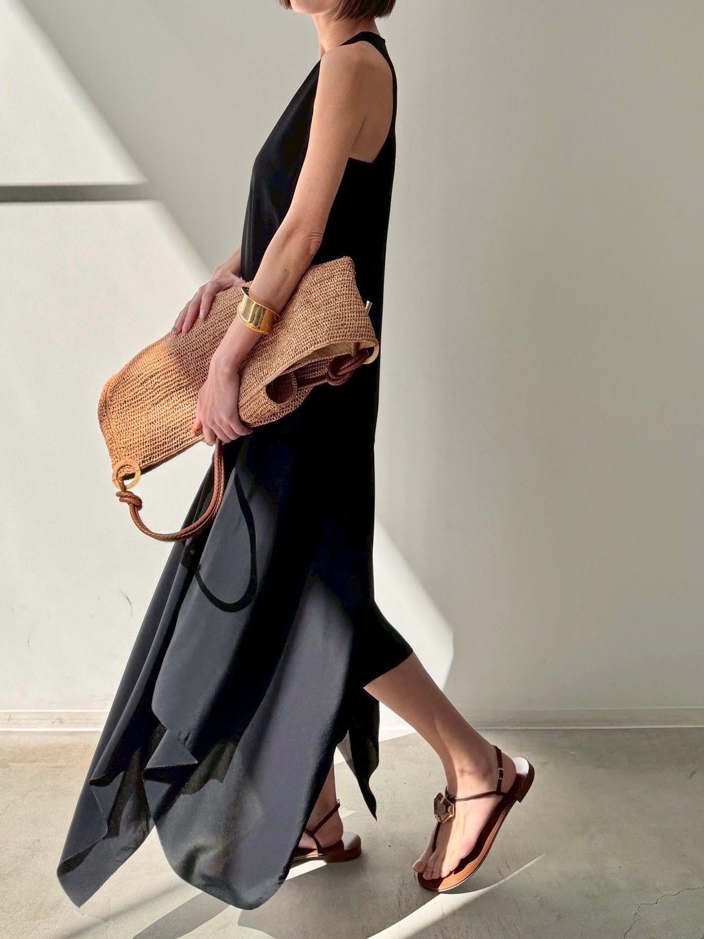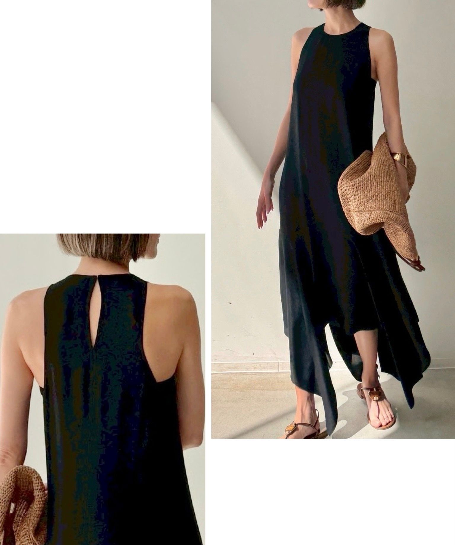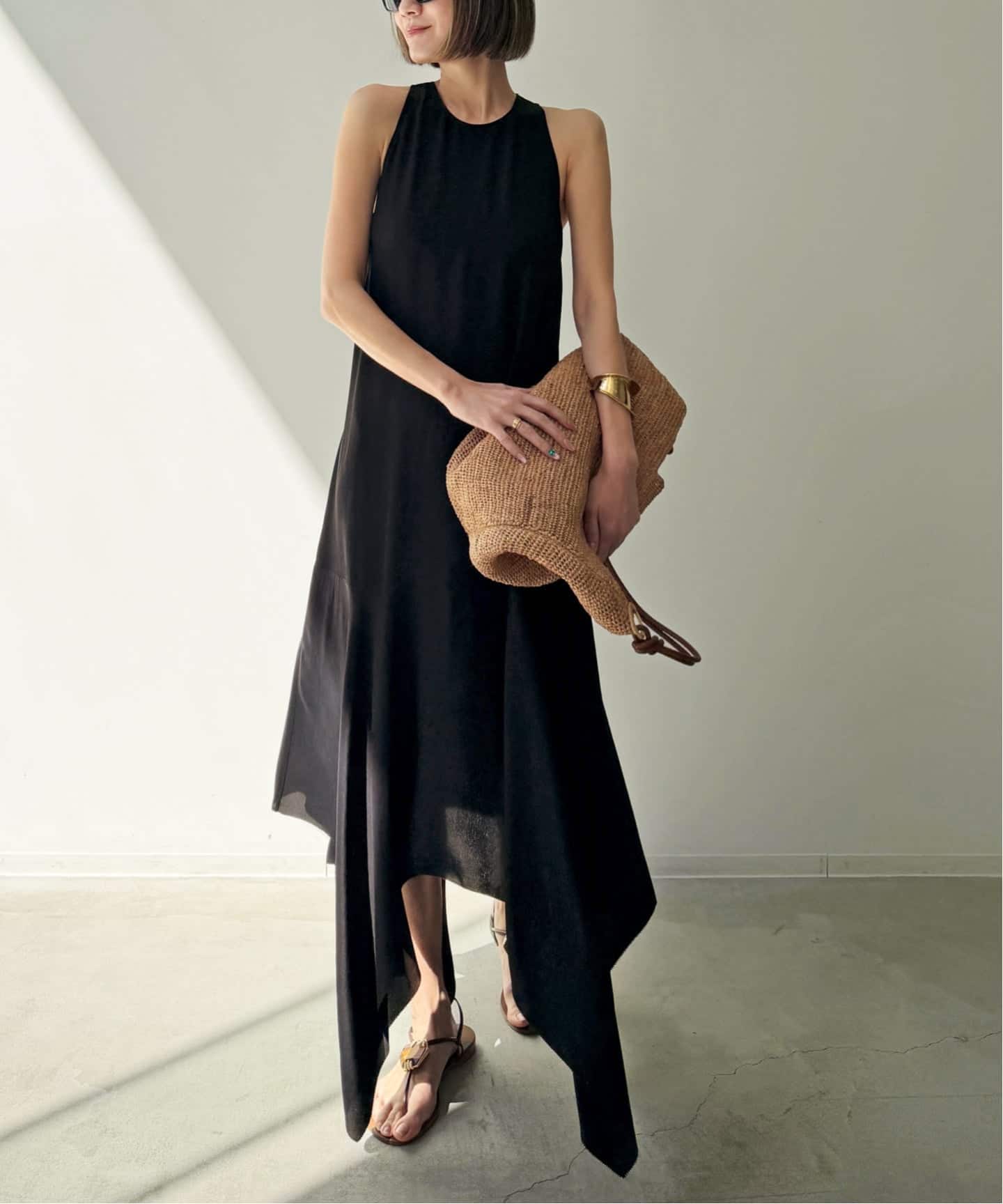 すっきりとしたホルターネックと、動きに合わせて揺れるアシンメトリーの裾が印象的な一枚。背中のスリットがさりげない抜け感をプラスし、シンプルながら女性らしいバランスに。