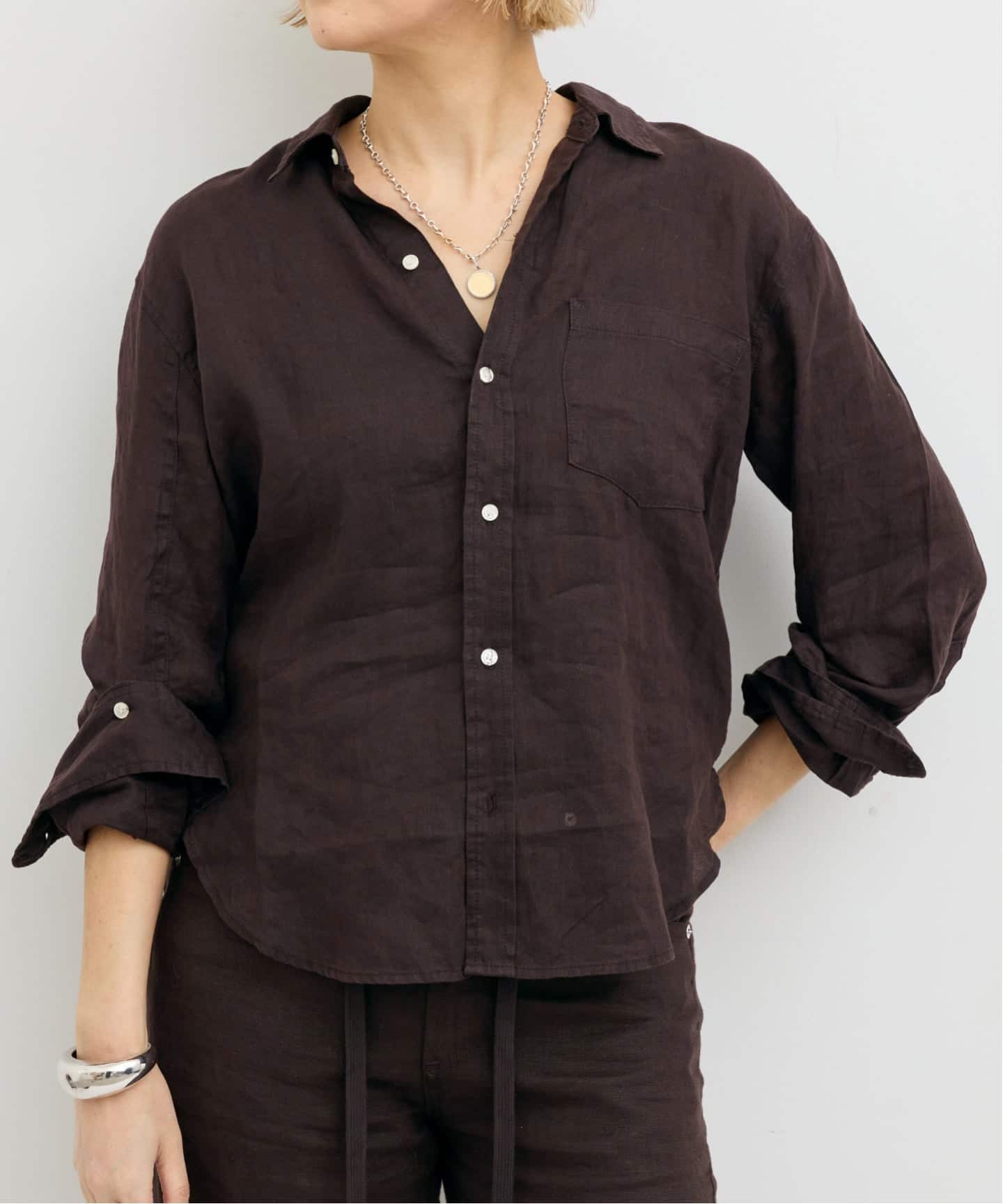 “Citizens Of Humanity” の定番KAYLA LINEN SHIRTは、身体から程よく離れるゆとりのあるシルエットとバランスのとりやすい丈感で、どんなスタイルにも馴染みやすい。