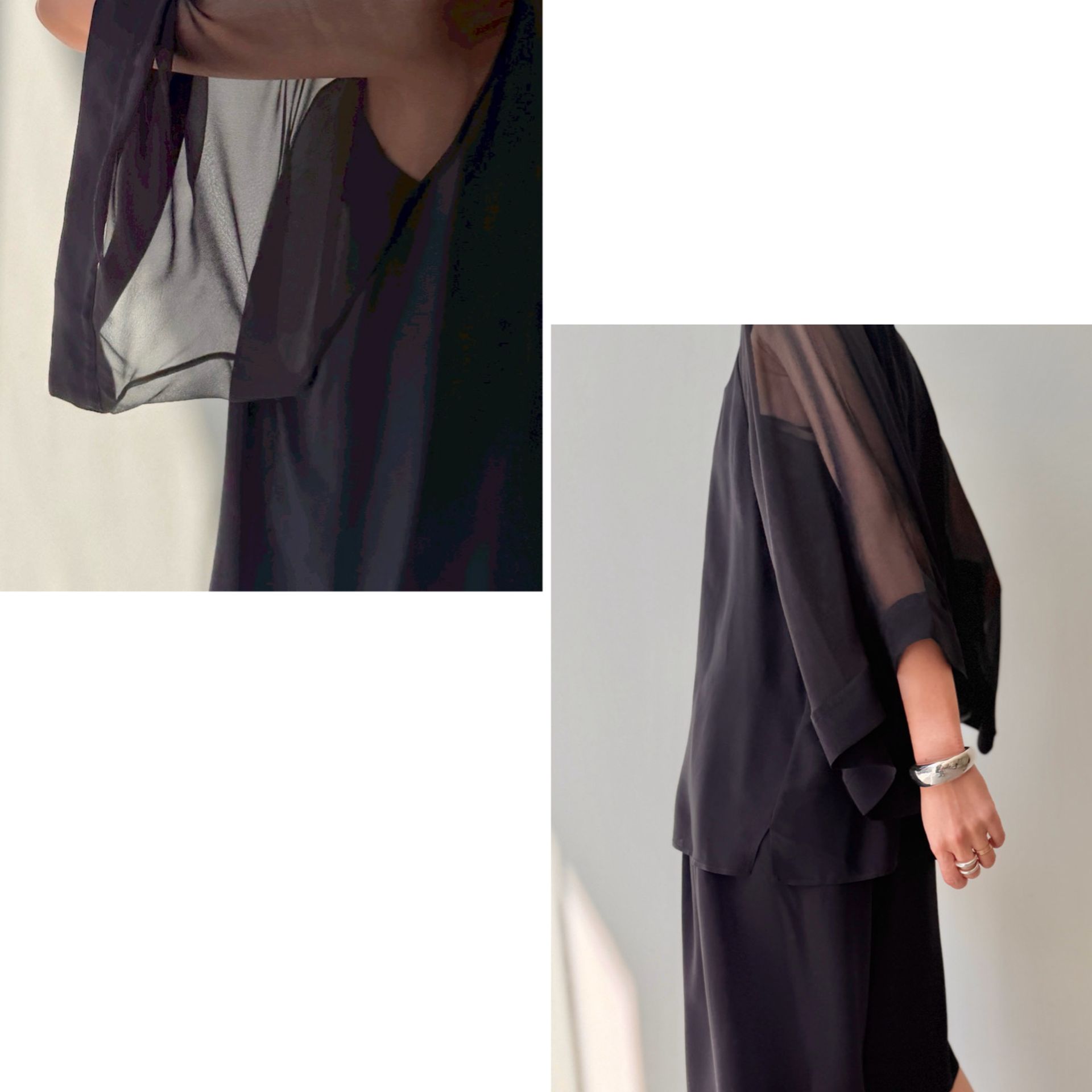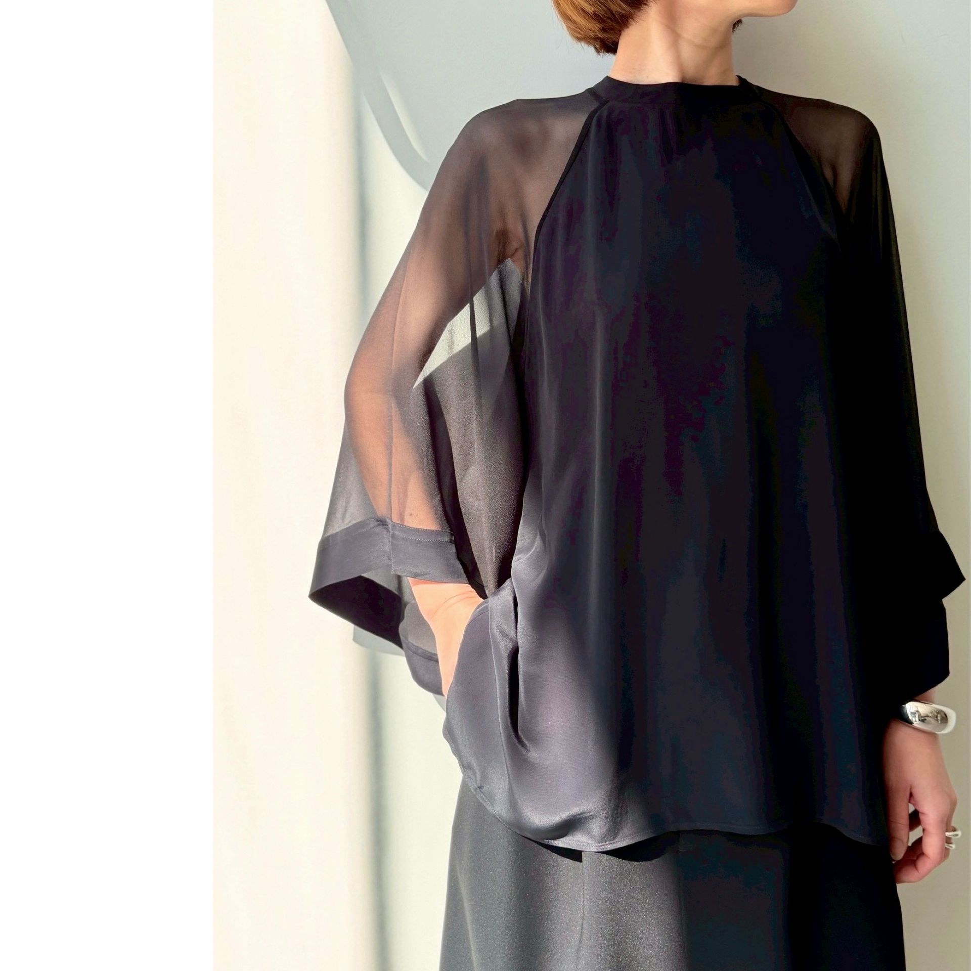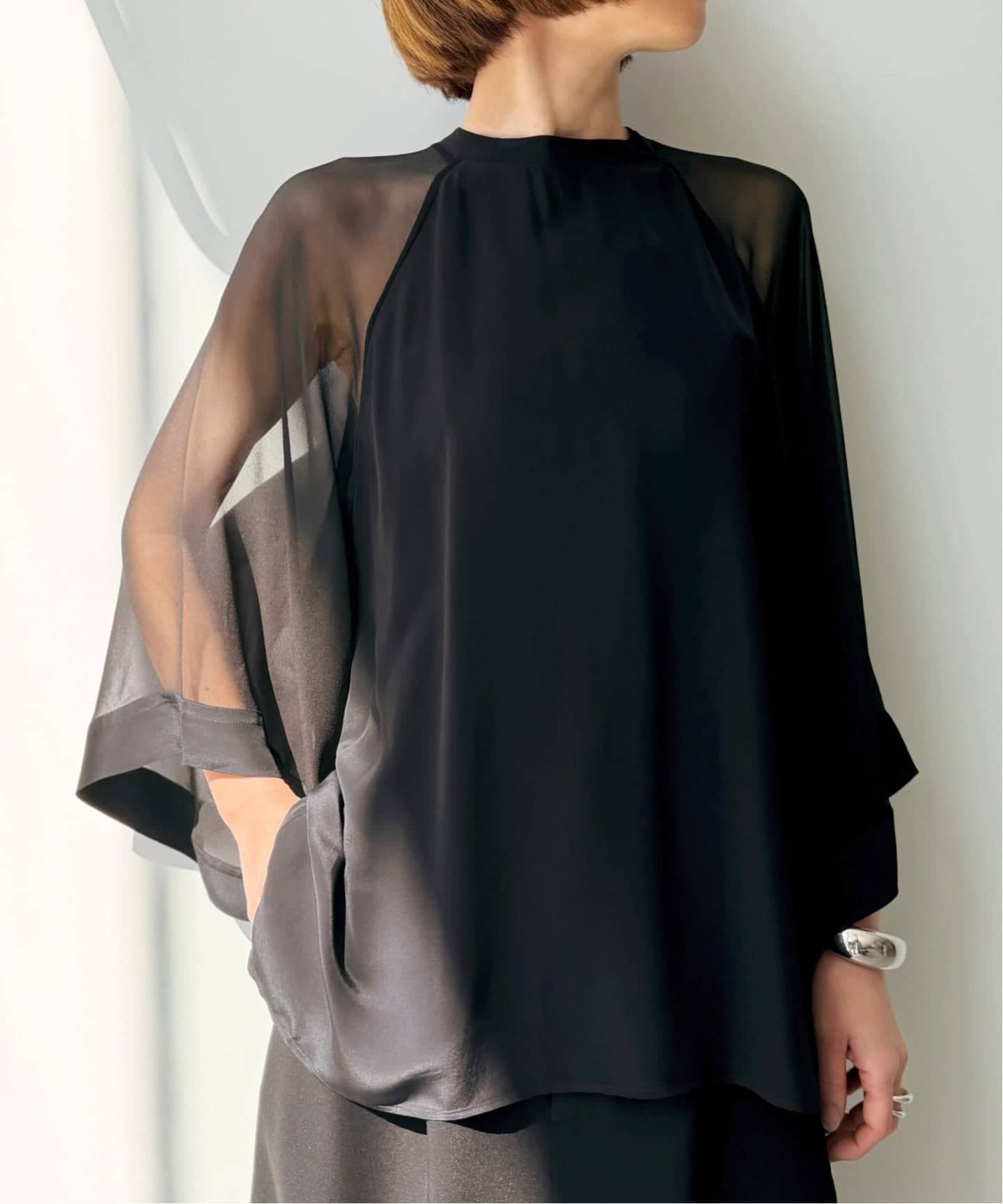 シアーなスリーブと落ち感のある身頃のコントラストが美しいブラウス。動くたびに揺れるスリーブがブラックでも重く見えず軽やかな印象に。