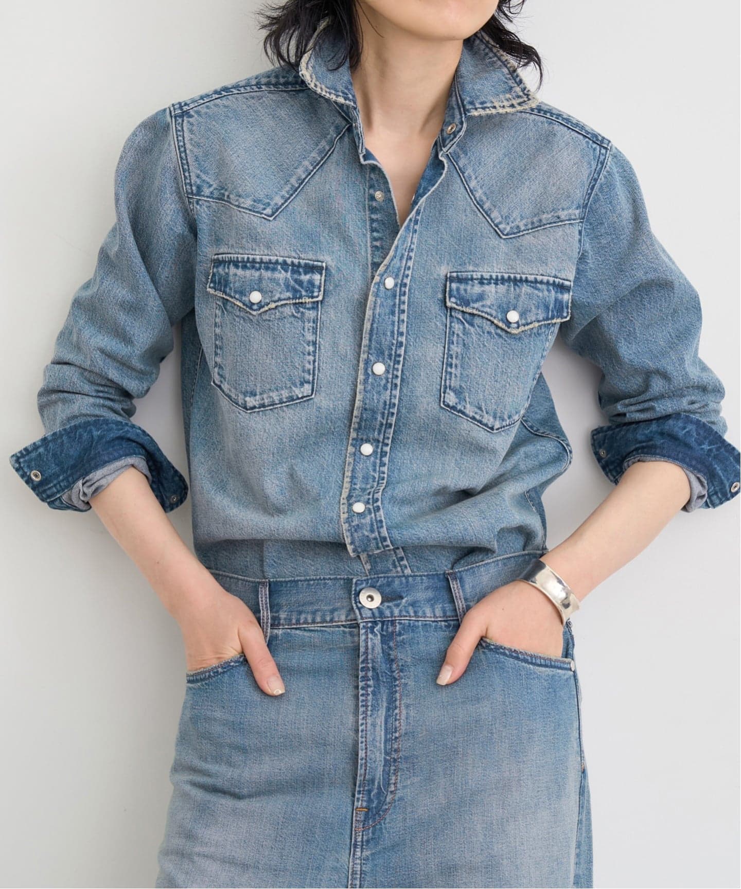 本格的な加工感とウエスタンなディテールにこだわり、ヴィンテージをベースに一からつくったデニムシャツ。タフな風合いながらコンパクトなサイズ感で女性らしく着られます。
