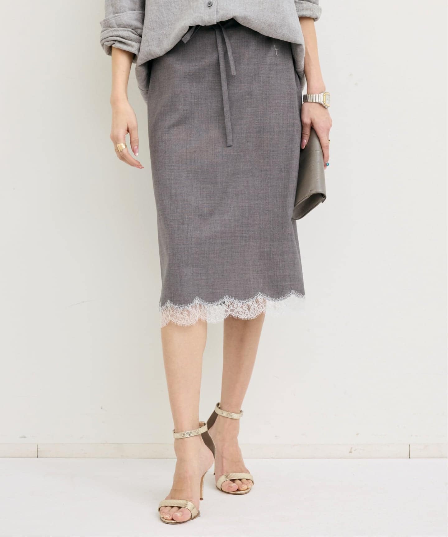 グレーにレースの組み合わせで甘くなりすぎないのもポイント。思いっきりレディに合わせたり、カジュアルアイテムとMIXしても素敵です。