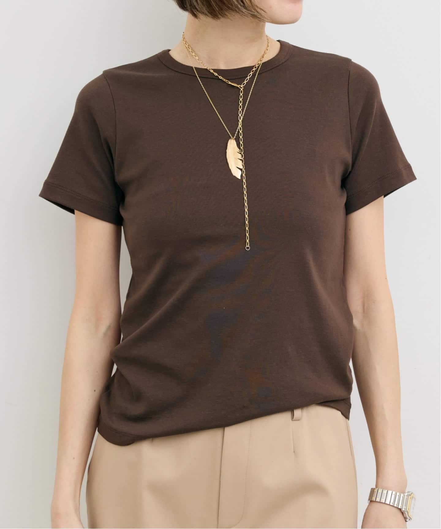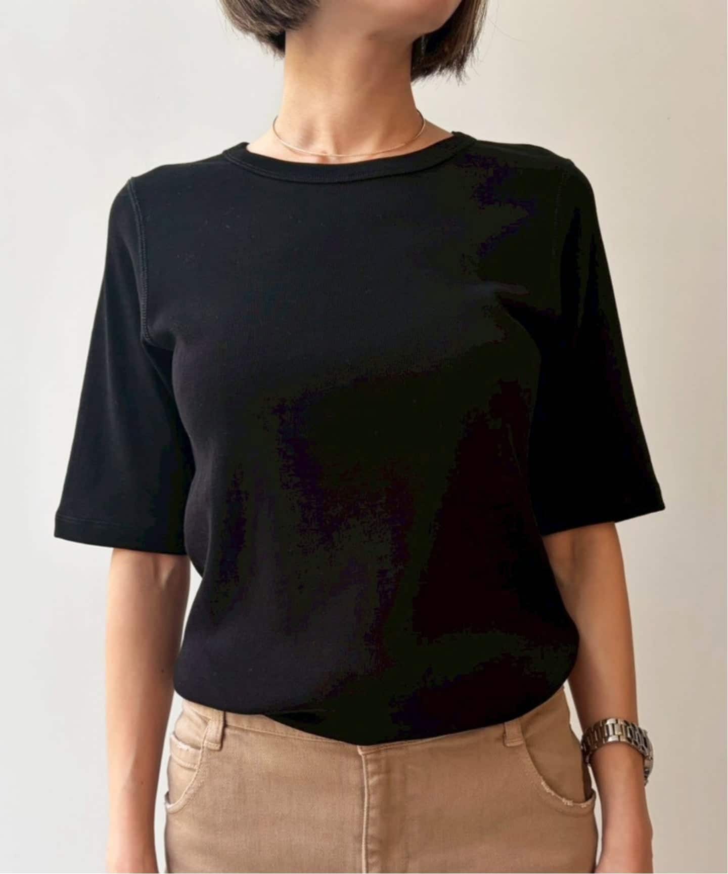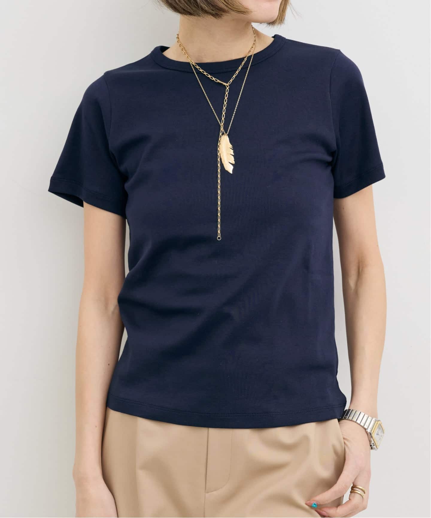 ラインを拾わない絶妙なサイズ感で、ジャケットのインナーにもちょうどいいデイリー使いしやすいベーシックTシャツです。