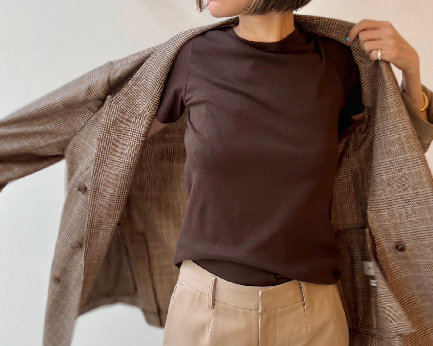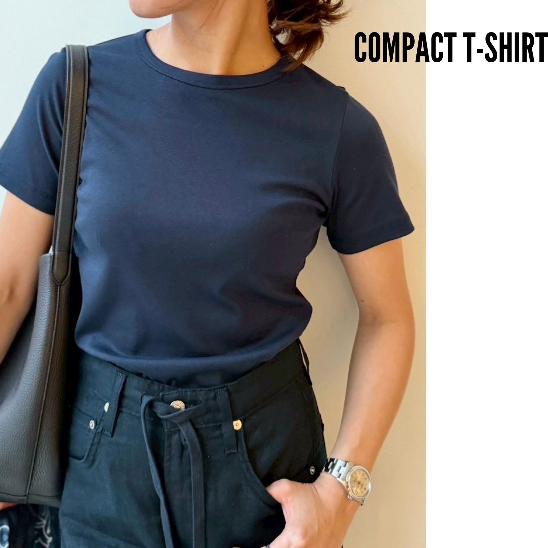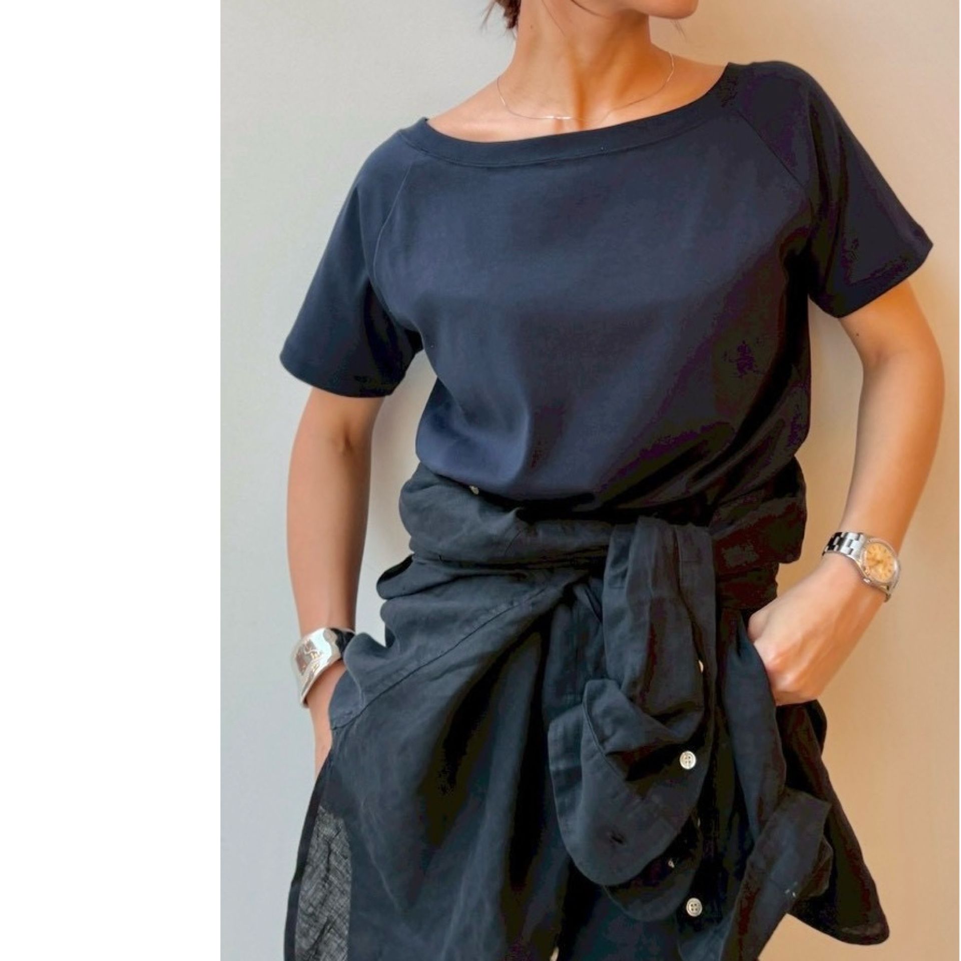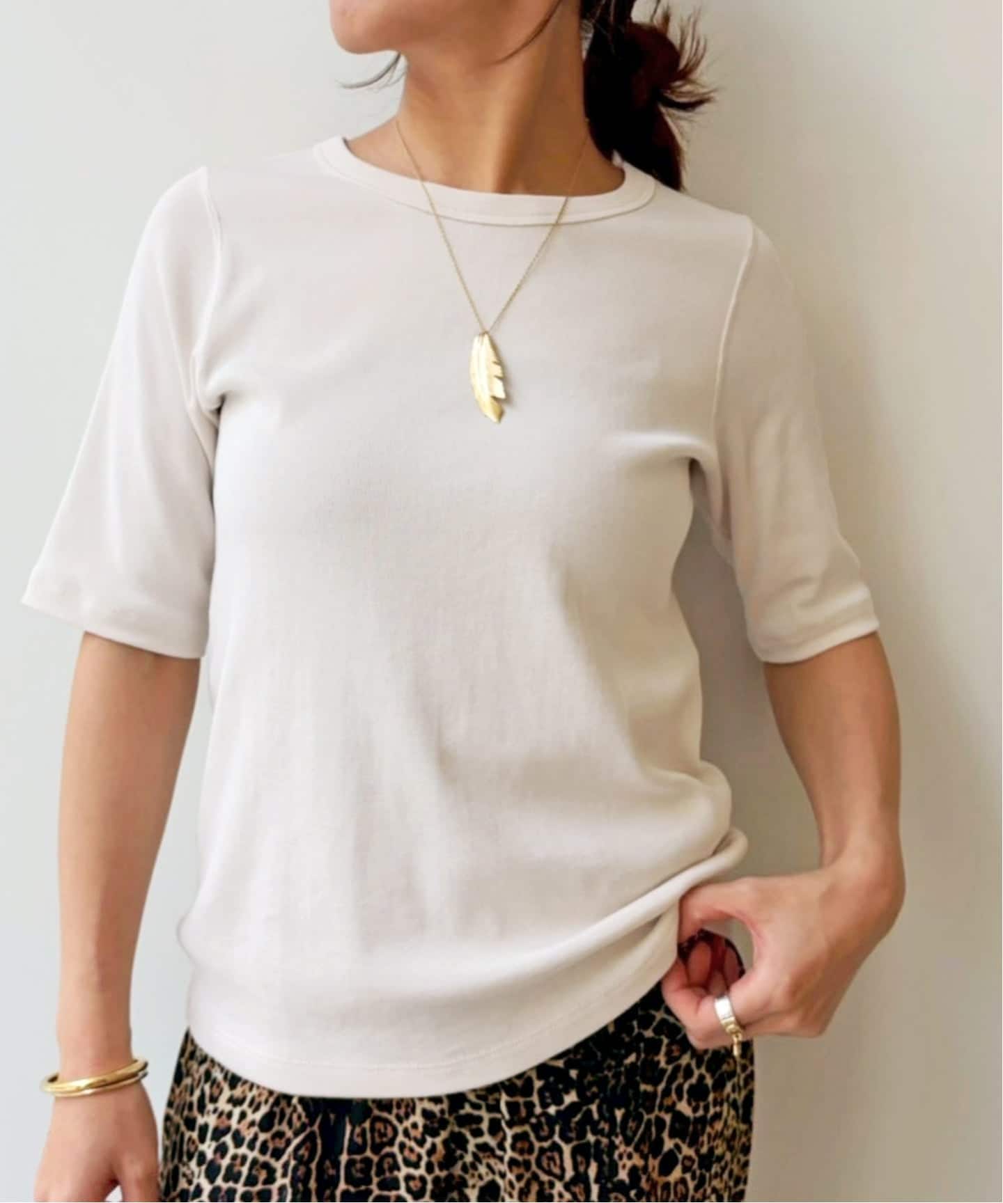 ラインを拾わない絶妙なサイズ感で、ジャケットのインナーにもちょうどいいデイリー使いしやすいベーシックTシャツです。