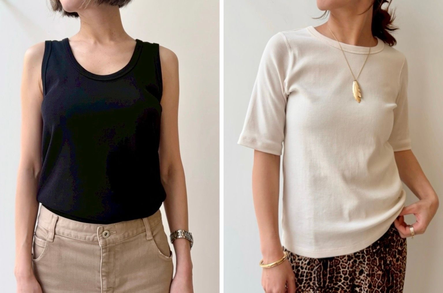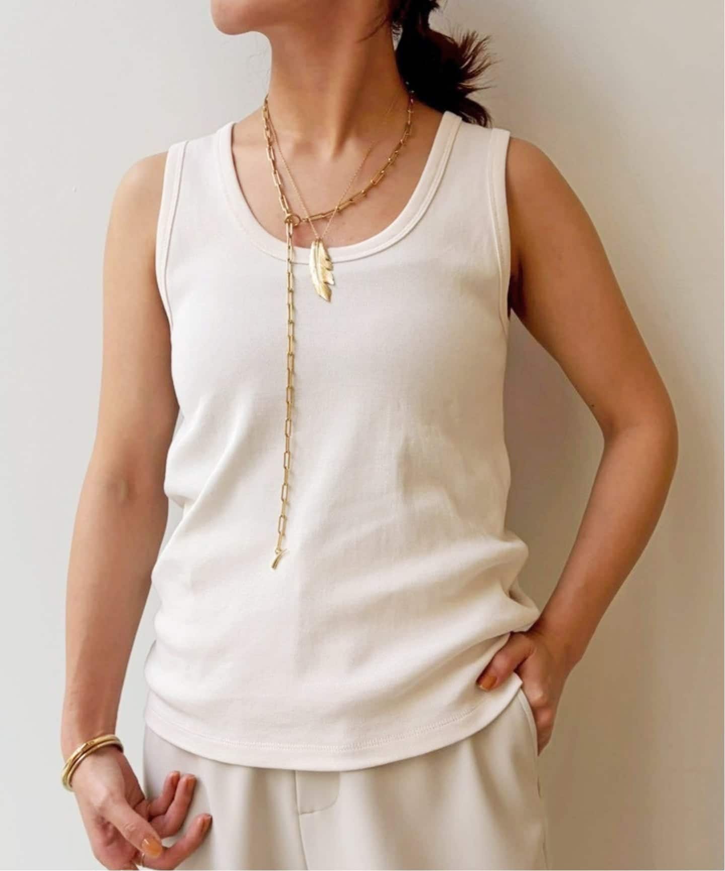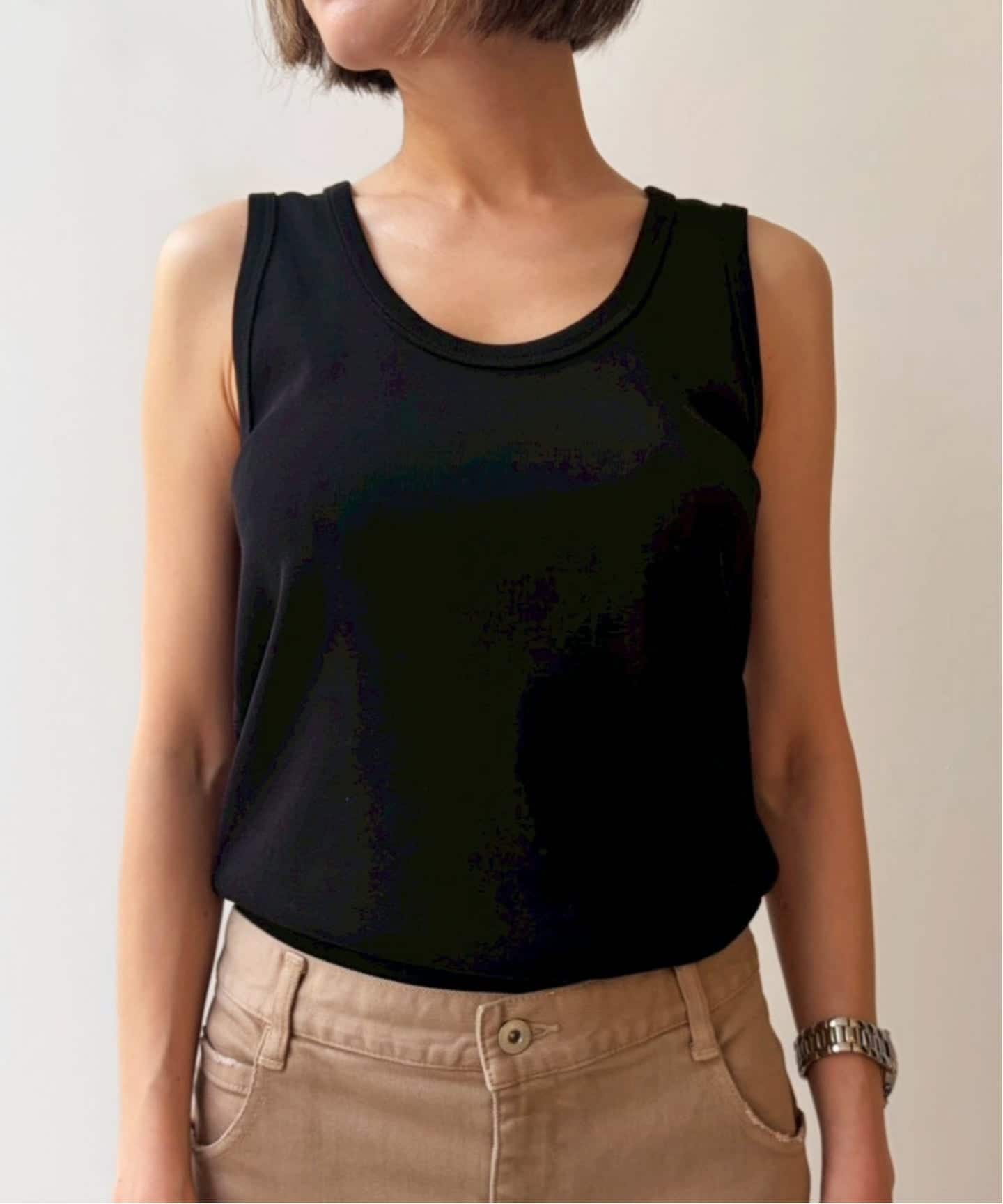 5分袖丈のTシャツはタイトすぎない程よいフィット感で、細身が苦手な方にもおすすめです。タンクトップは深めのネックライン。顔周りをすっきりと見せてくれるデザインに仕上げました。