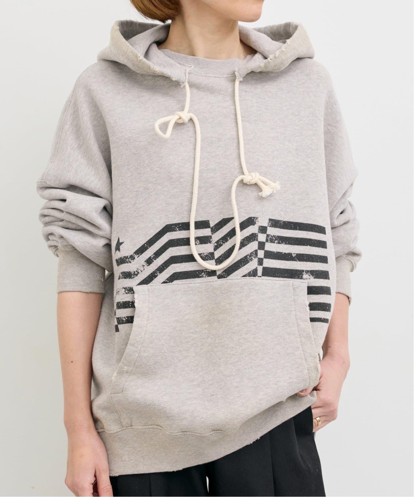 ロープ仕様のドローストリングは途中で結んで、抜け感のあるアクセントを加えるアレンジもおすすめです。