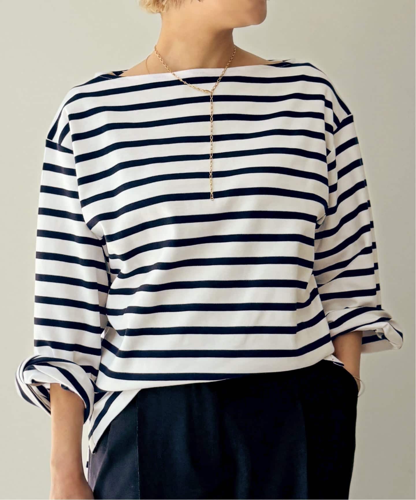 太すぎないピッチが大人も着やすいボーダートップス。無地もいいけれどスタイリングのアクセントにもなるボーダーはクローゼットに揃えておきたいアイテムの1つです。