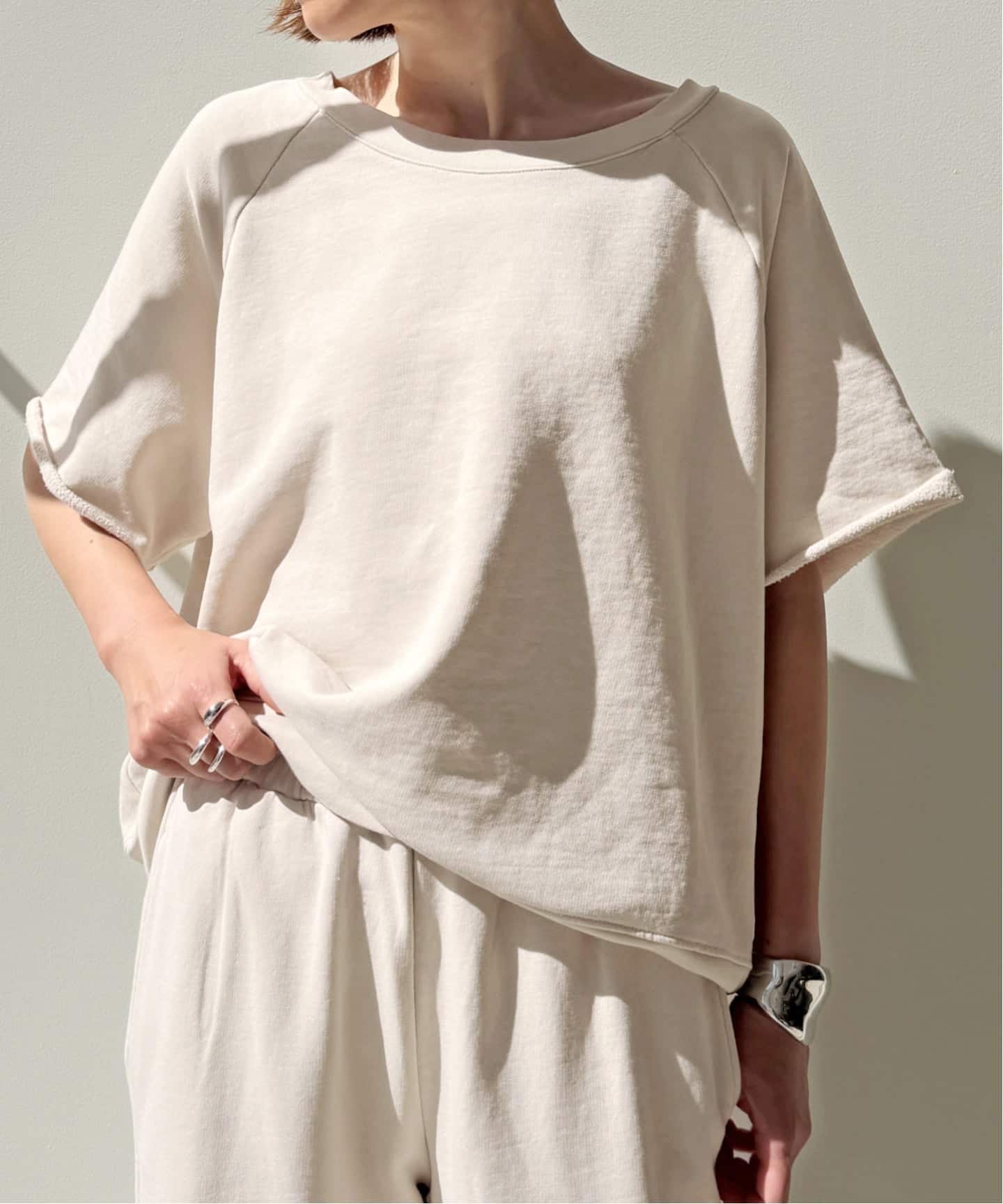 ゆったりとしたシルエットと柔らかな素材感ながら、絶妙なニュアンスのある色味がラフになりすぎず大人の抜け感を演出してくれます。