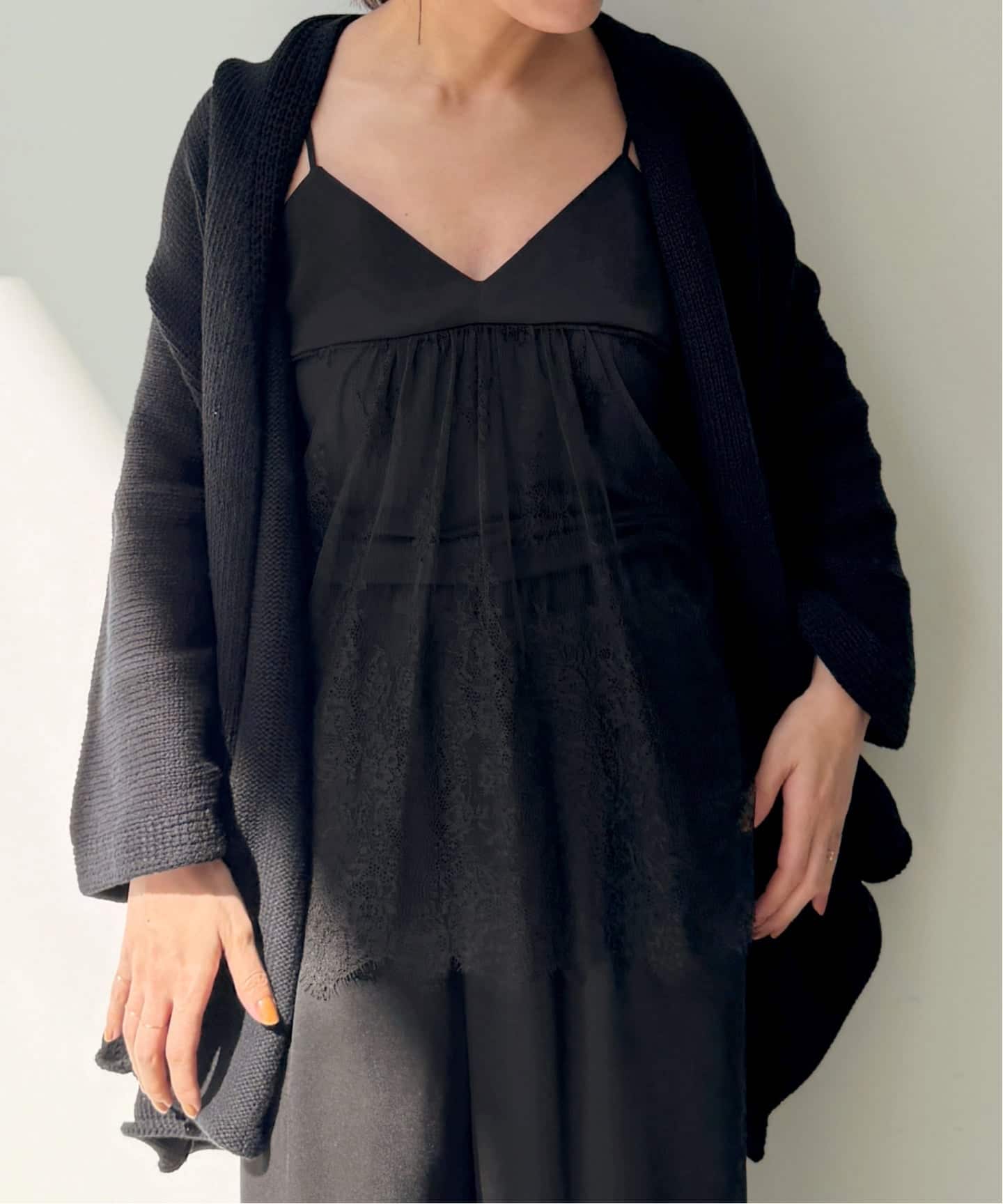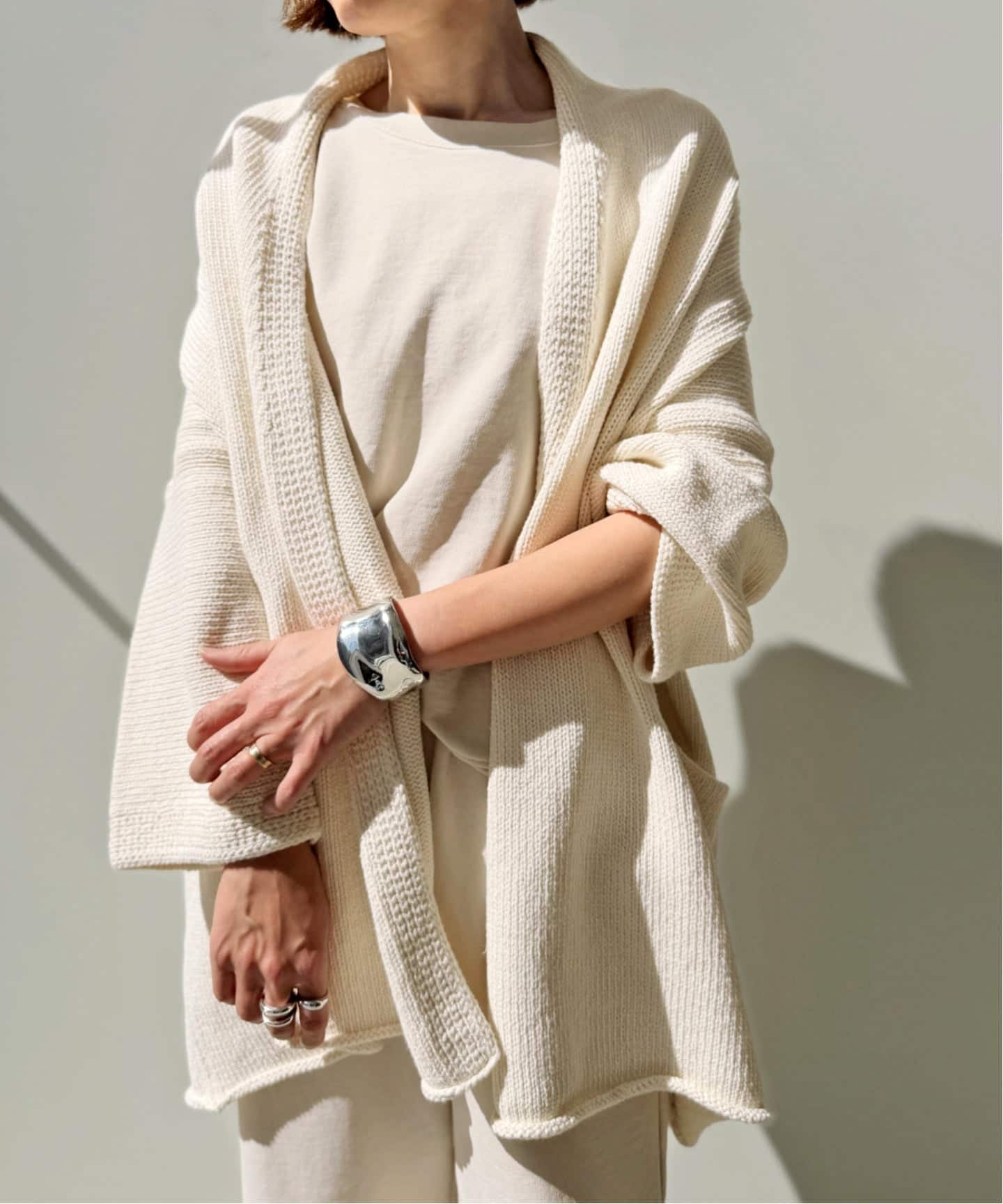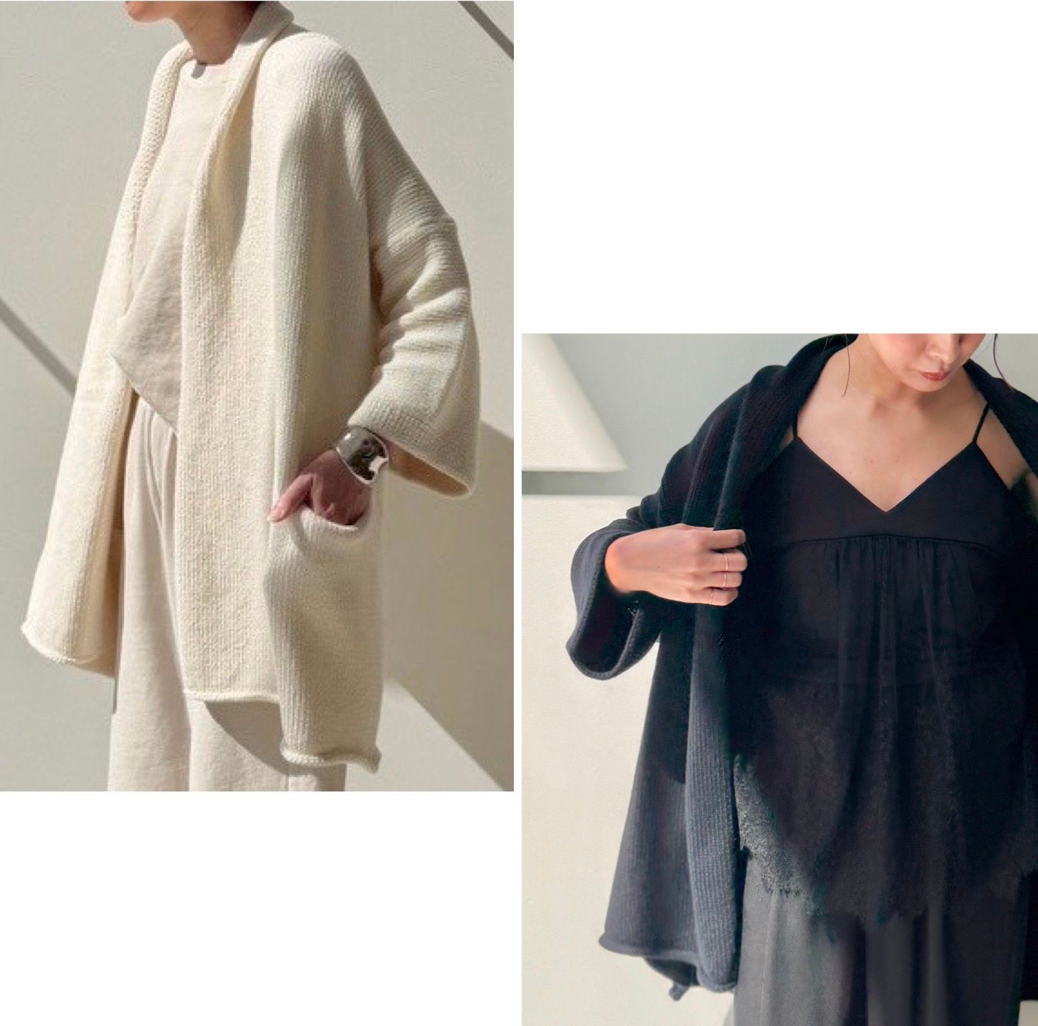 まさに“纏う”という言葉がぴったりなカーディガンは春先に着たいオフホワイトと、スミクロの様な柔らかさのあるブラックの2色展開。