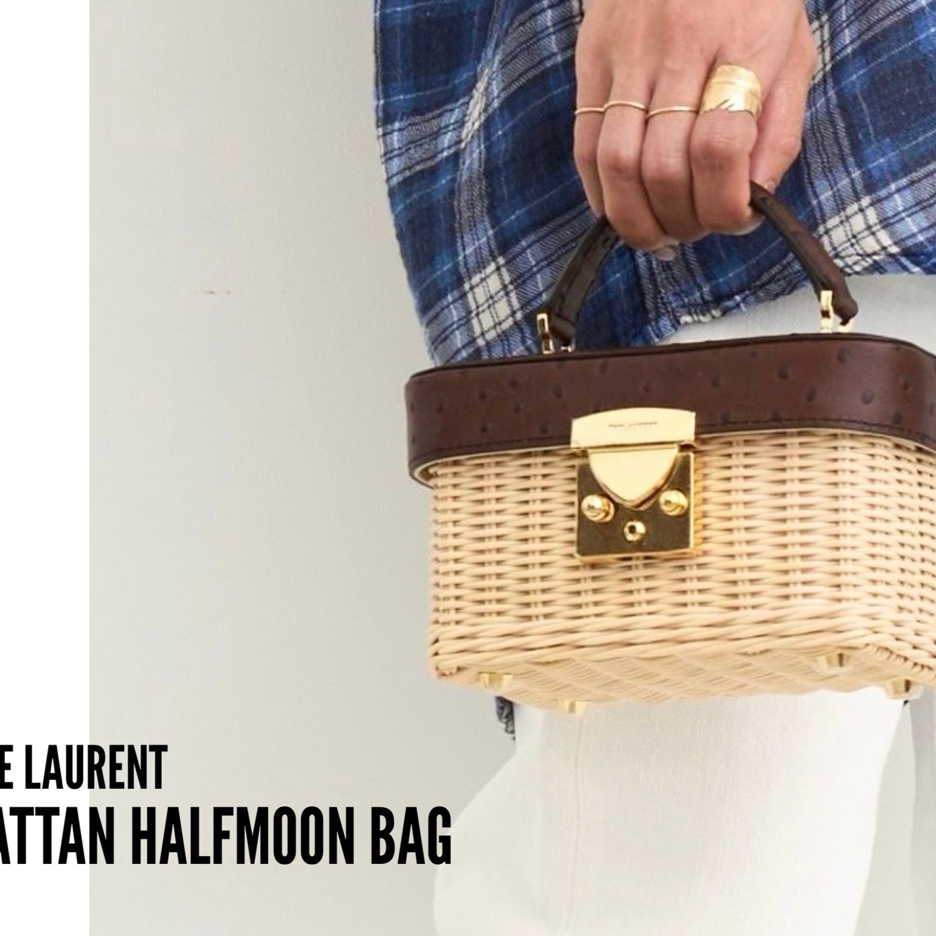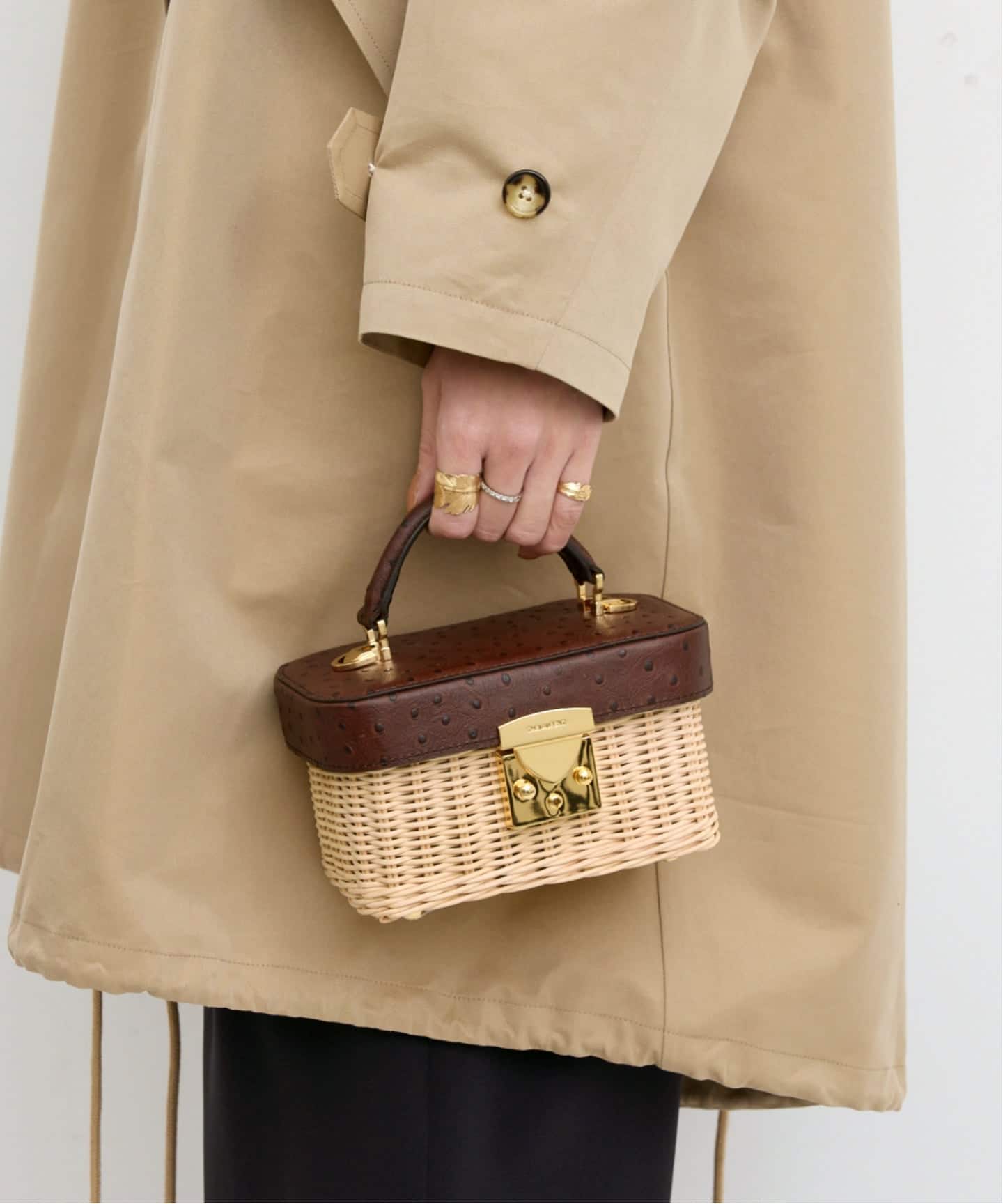 ラタンのナチュラルな風合いに、ブラウンレザーとゴールドパーツを組み合わせたボックスバッグ。