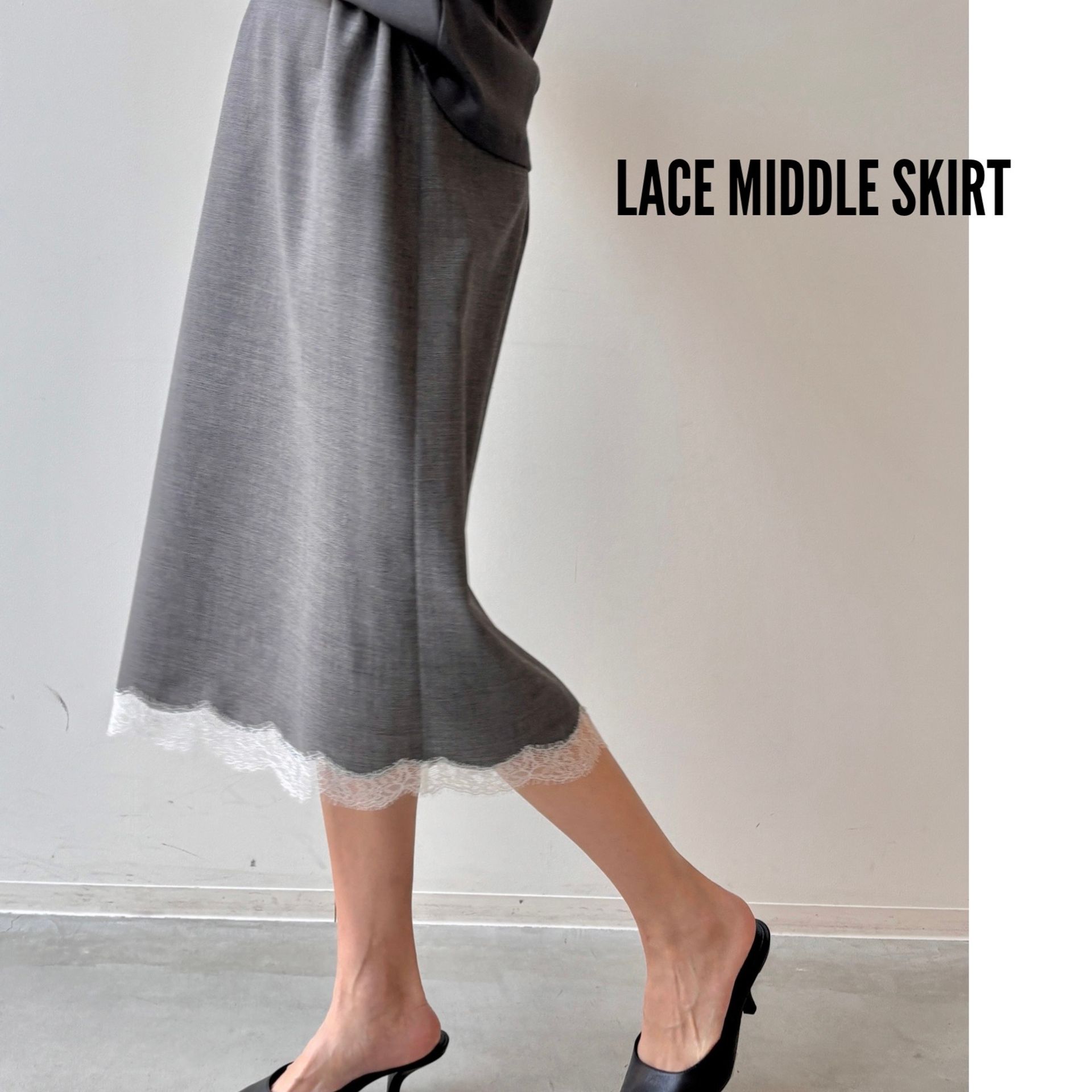 落ち感のある滑らかなフォルム、裾のレースがフェミニンな印象のミドル丈スカート。