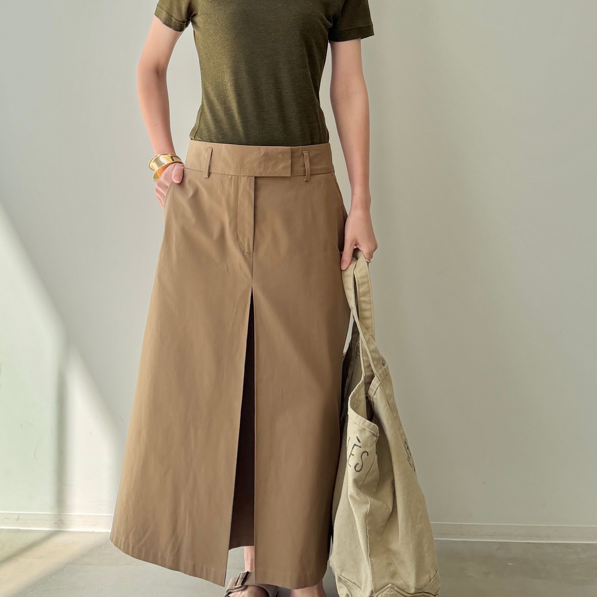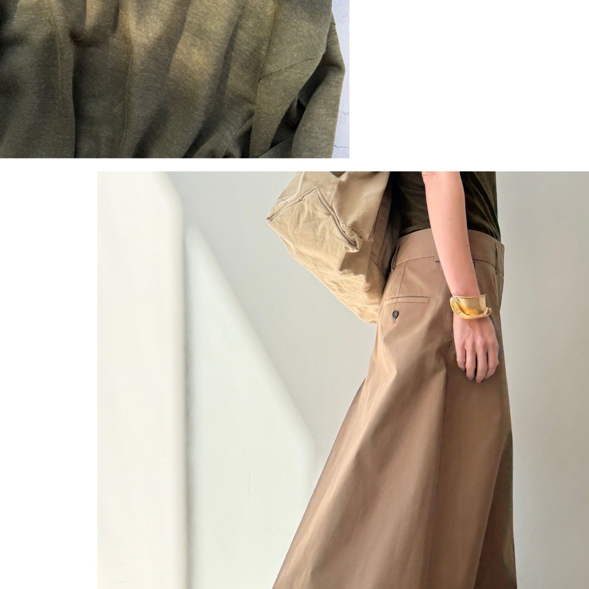 裾に向かってやや細くなるシルエットで程よいゆとりはありつつ腰回りはすっきり、自然なブラウジングができます。