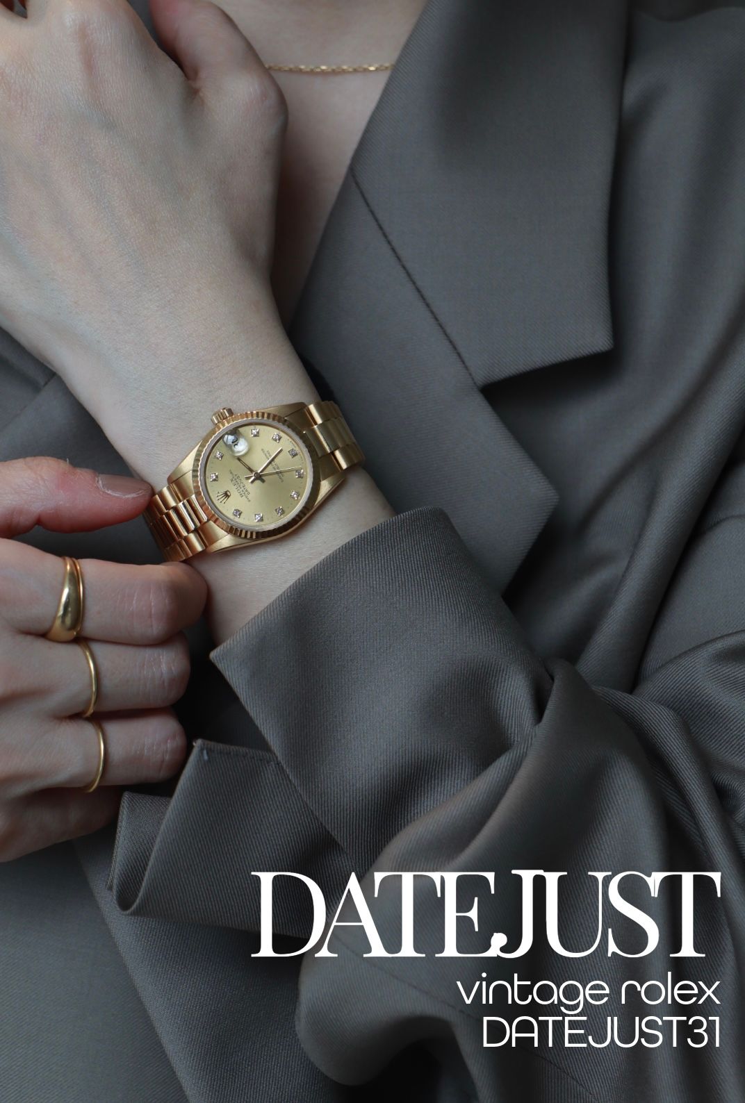 ジャケットスタイルに、凛とした華やぎを。大人の洗練された装いの手元に添えたいのが、オールゴールドのデイトジャスト31。軽やかな季節のジャケットスタイルだからこそ、時計には確かな存在感が欲しい。