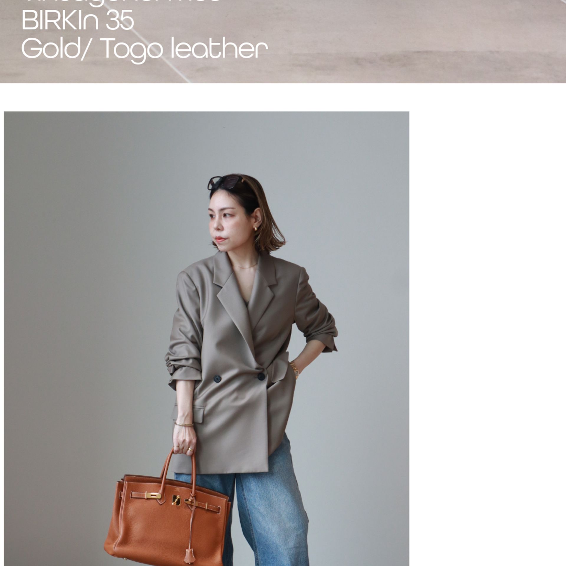 大きめサイズでつくる、余裕のある春のトラッドスタイル。メンズライクなトラッドスタイルには、バーキン40の存在感がよく映える。たっぷりとしたサイズ感がコーディネートにこなれたムードを生み、クラシックなスタイルを今のバランスにアップデート。