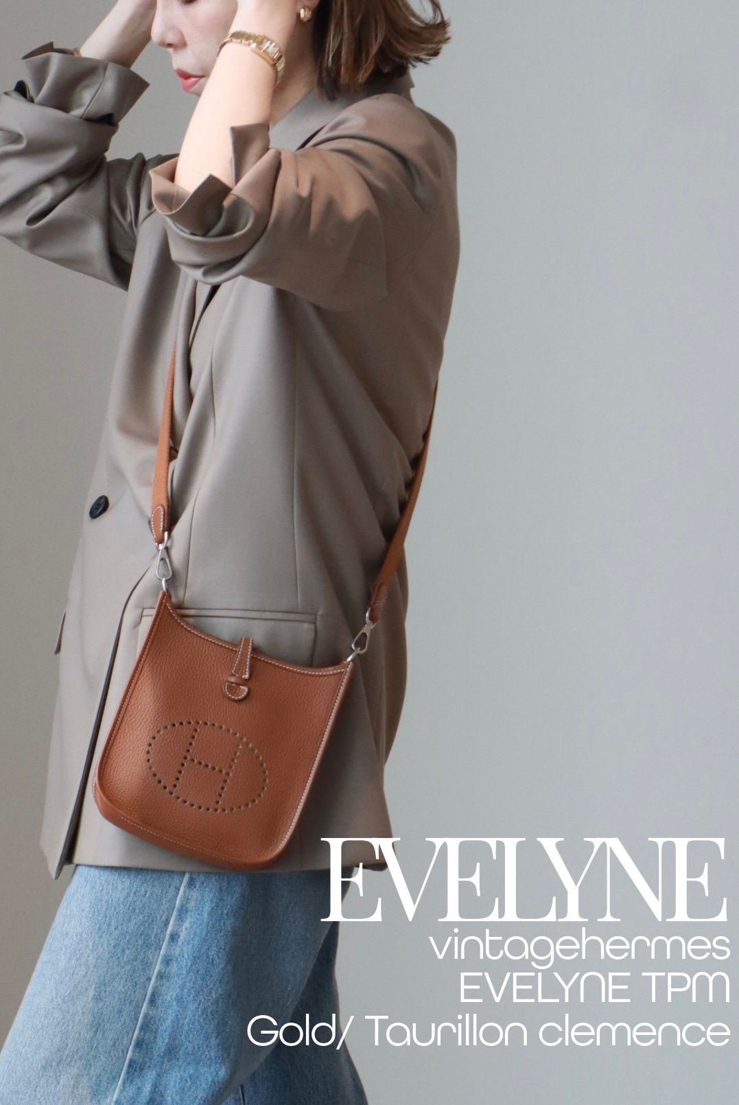 軽やかな春のトラッドに、さりげない抜け感を生むゴールドカラーのエヴリン。TPMのコンパクトなサイズ感は、きちんと感のあるトラッドにほどよいリラックス感をプラスしてくれる。気負わず持てるのに、しっかりと上質。洗練されたカジュアルスタイルに選びたい。