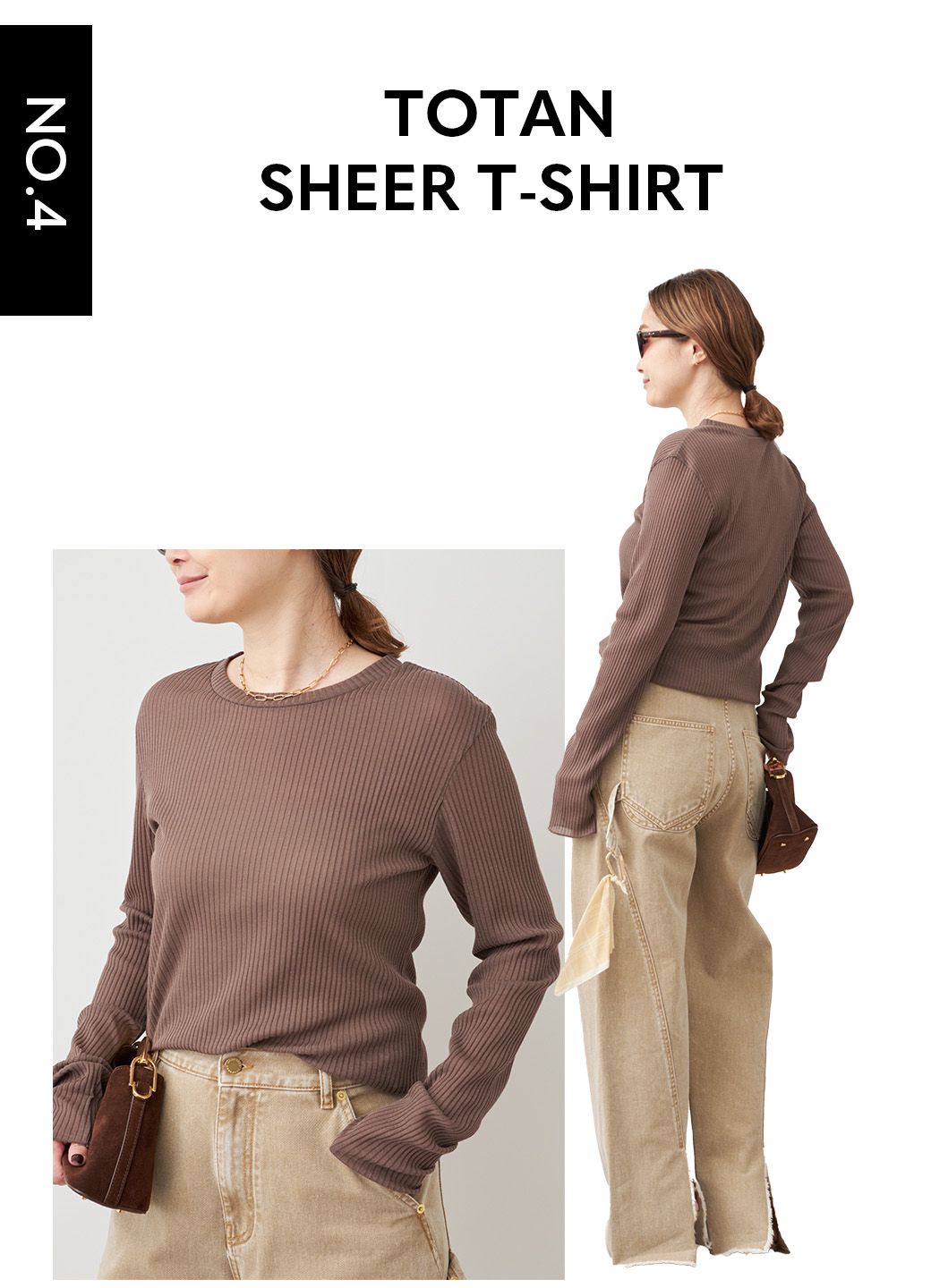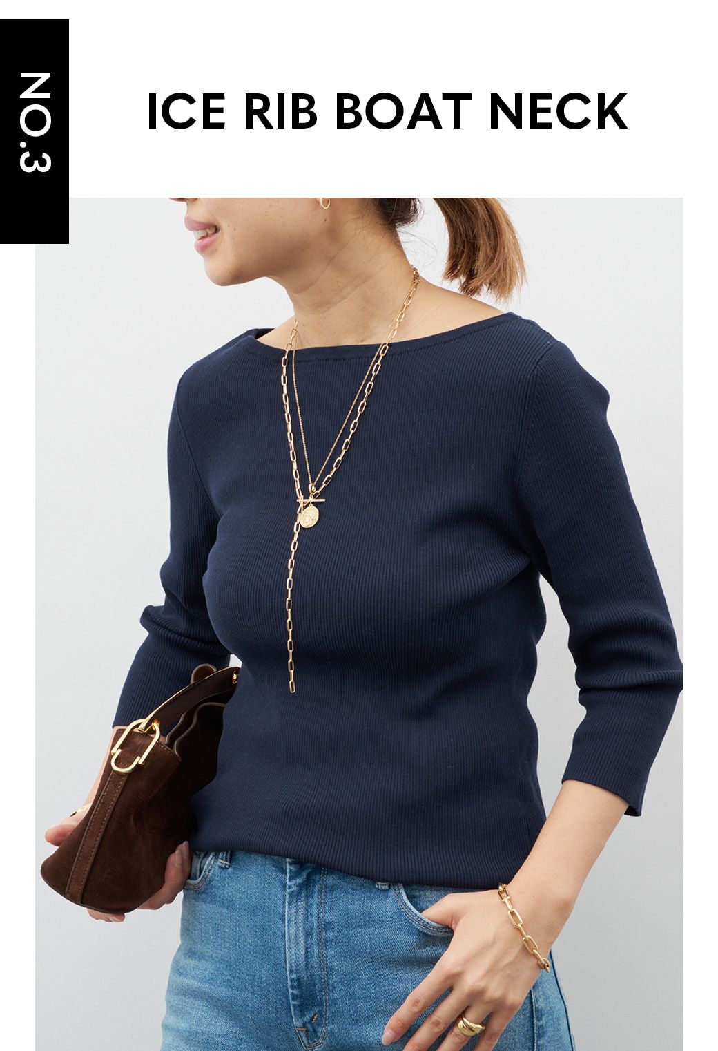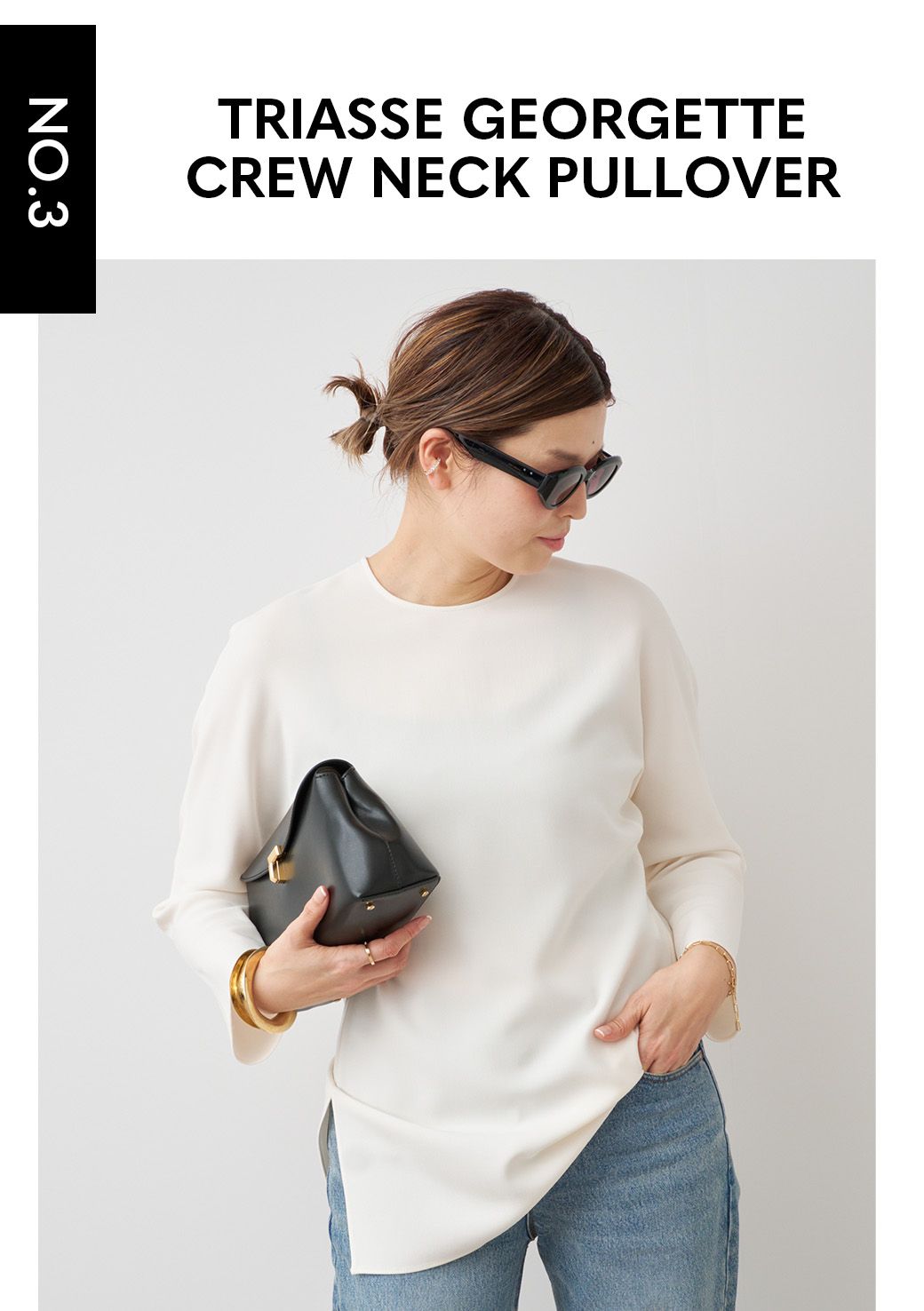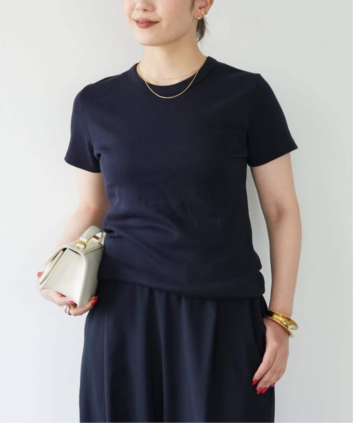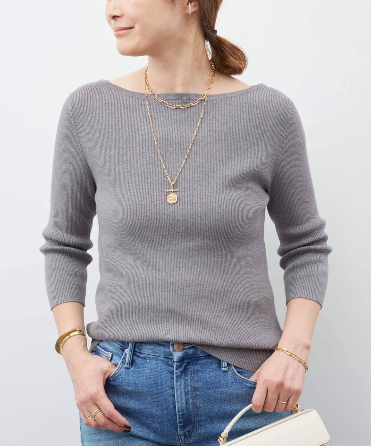 シャープなネックラインはモダンに決まり、合わせるボトムも選ばない万能トップス。