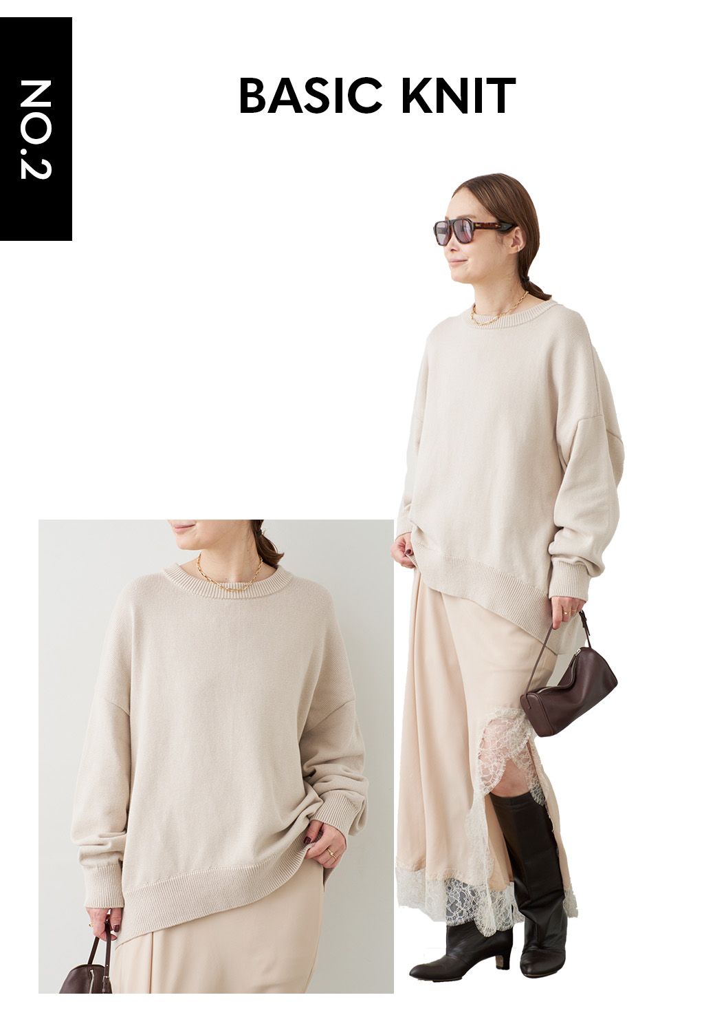 春に1枚で印象的なスタイルに導くニット。