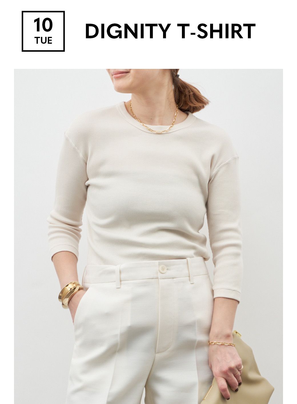 肩の力を抜いてシルクをデイリーに楽しみ、ムードを放つセットアップスタイルに。