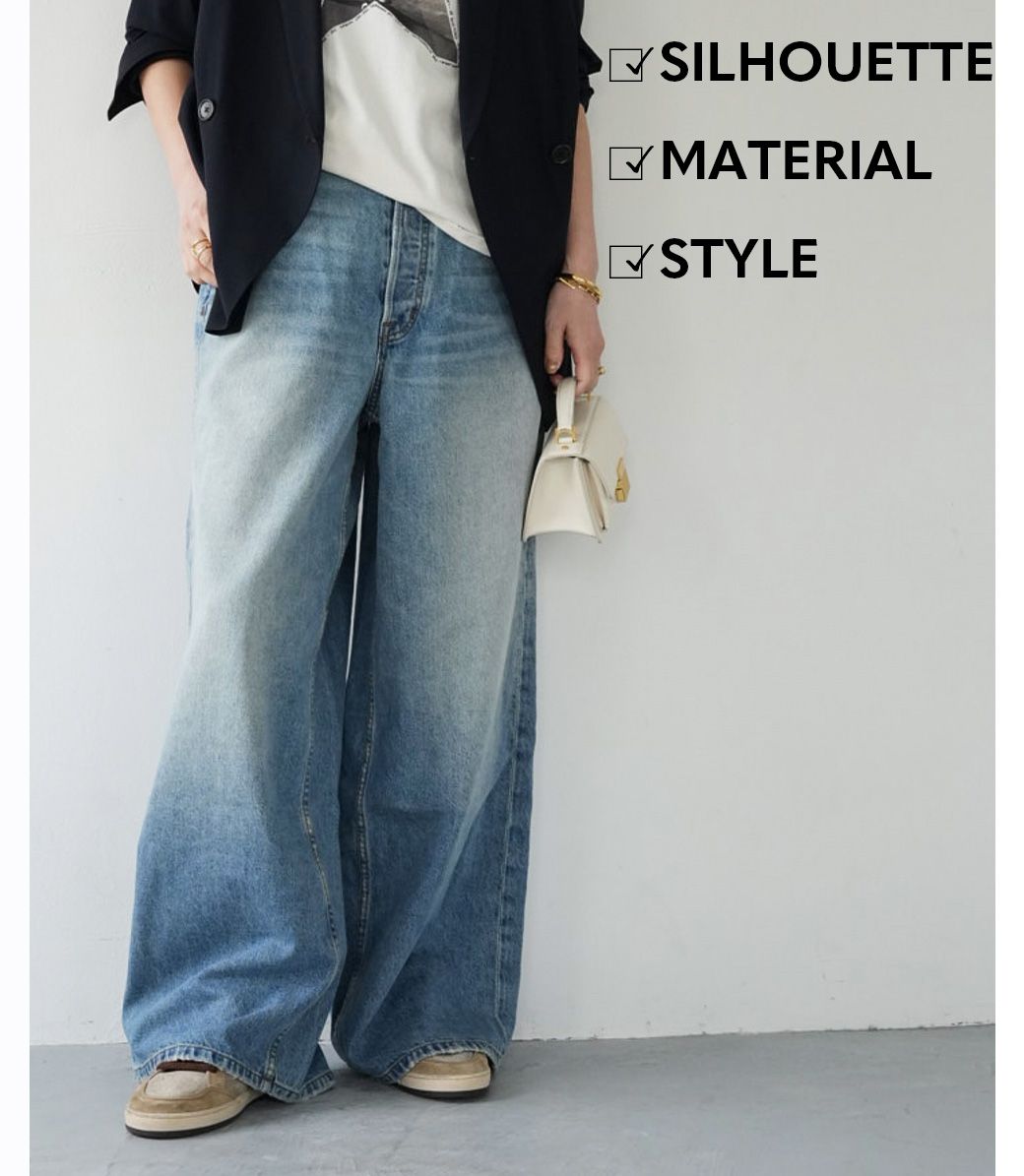 シンプルで美しいTOPSをお持ちの方も多いはず。シンプルに箔をつけて美しさを引き立て、大人の抜けと箔を両立させるデニムは、普段綺麗見えスタイルが多い方にもオススメ。