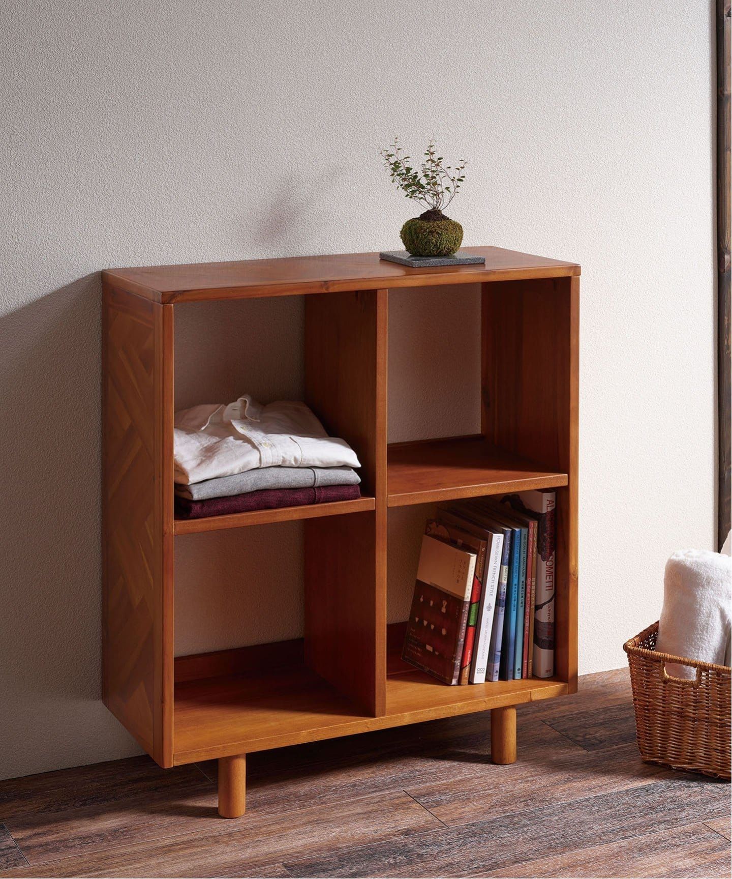 アカシア材特有の濃淡ある木目の個性を活かした、幾何学的な寄木柄のオープンシェルフです。