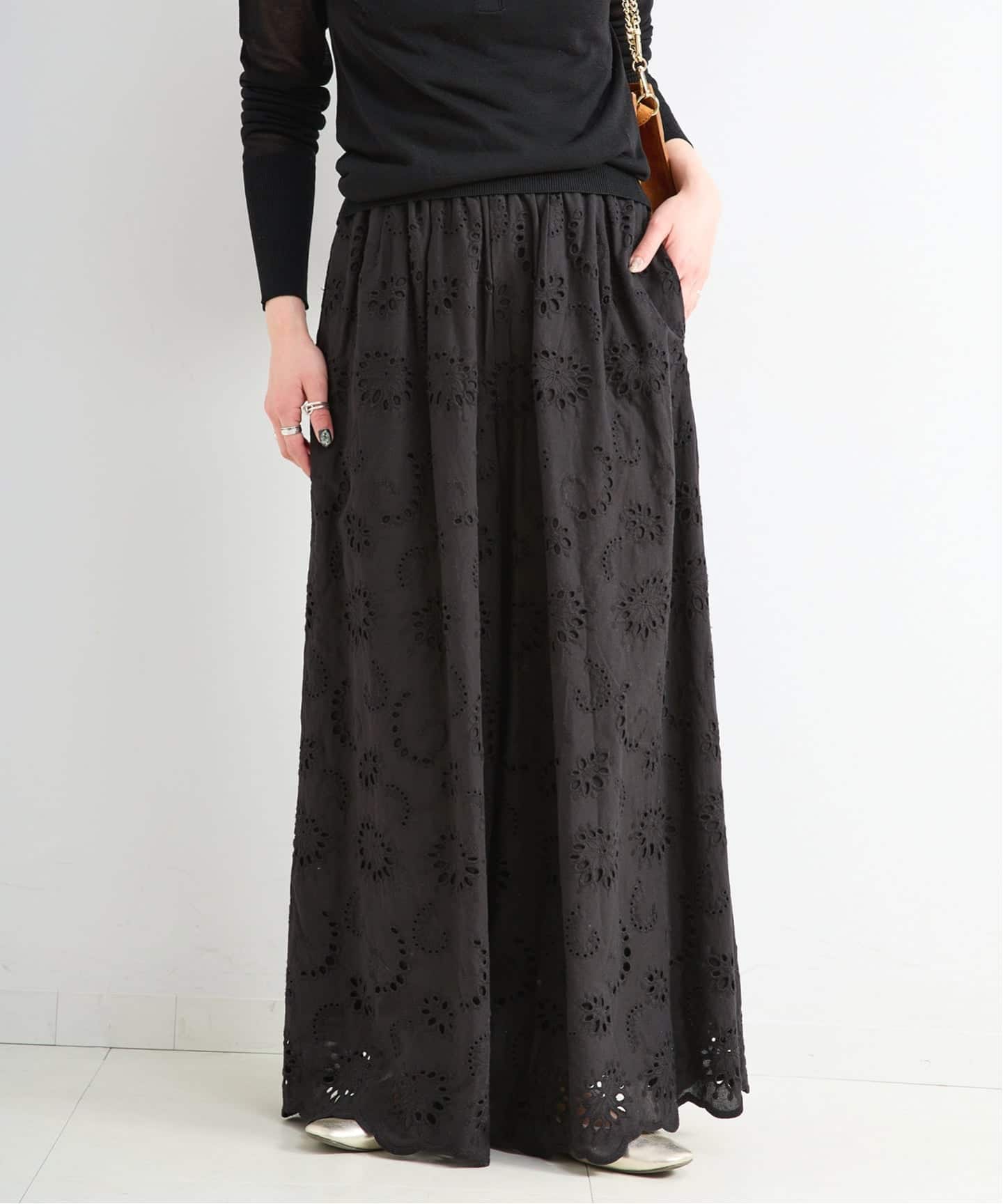 アイレットレース刺繍が華やかな大人レースパンツ。