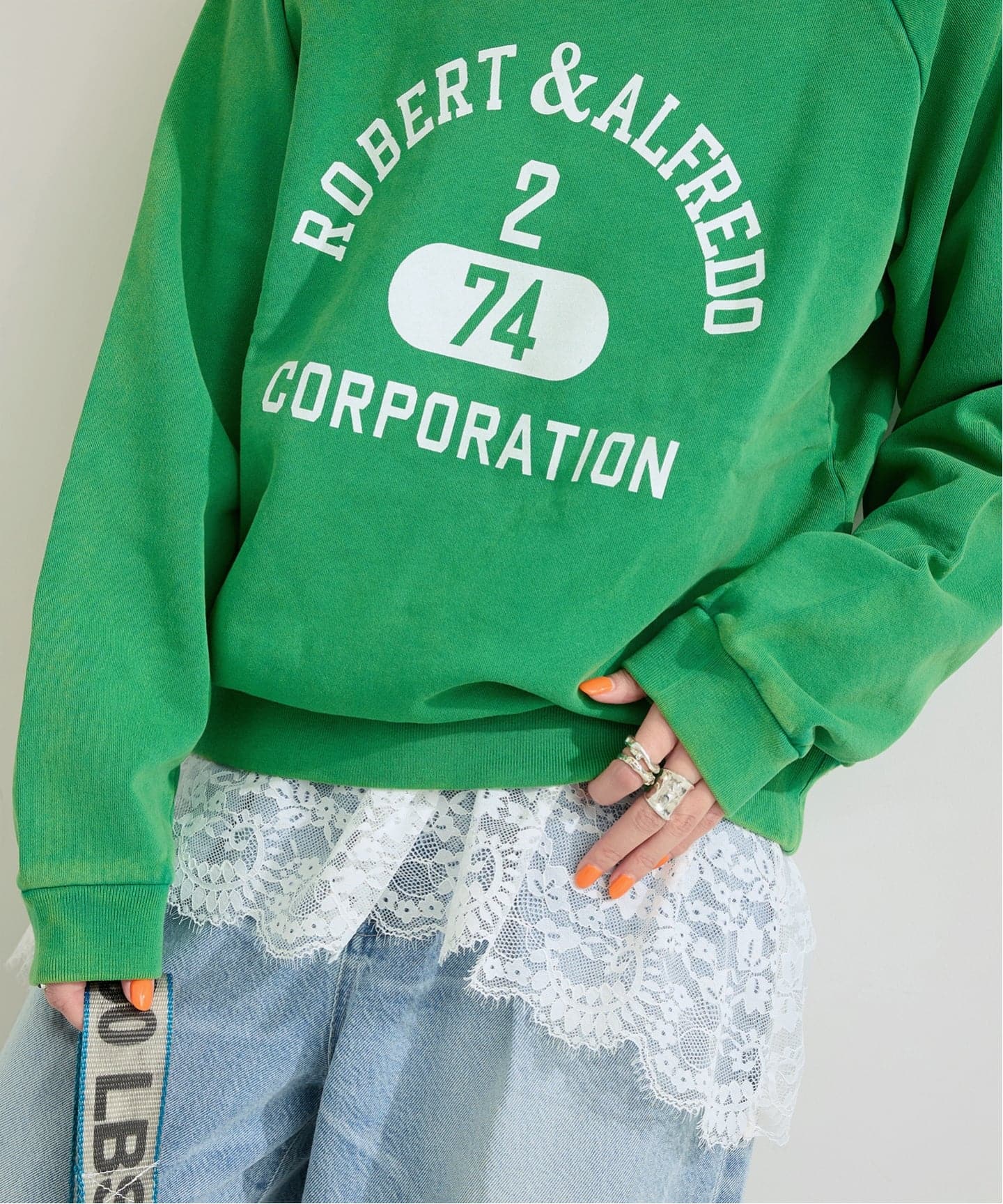 スウェットなどとレイヤードにも合わせやすく、華やかなアイテムです。