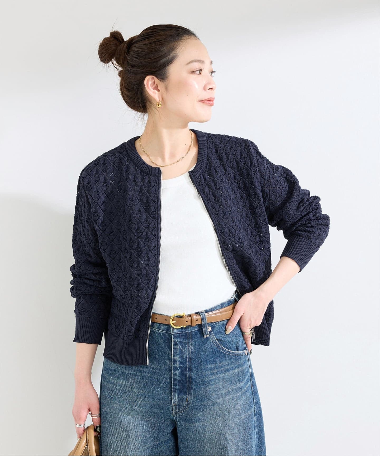 編み柄と素材感が引き立つ柄編みZIPニットカーディガン。