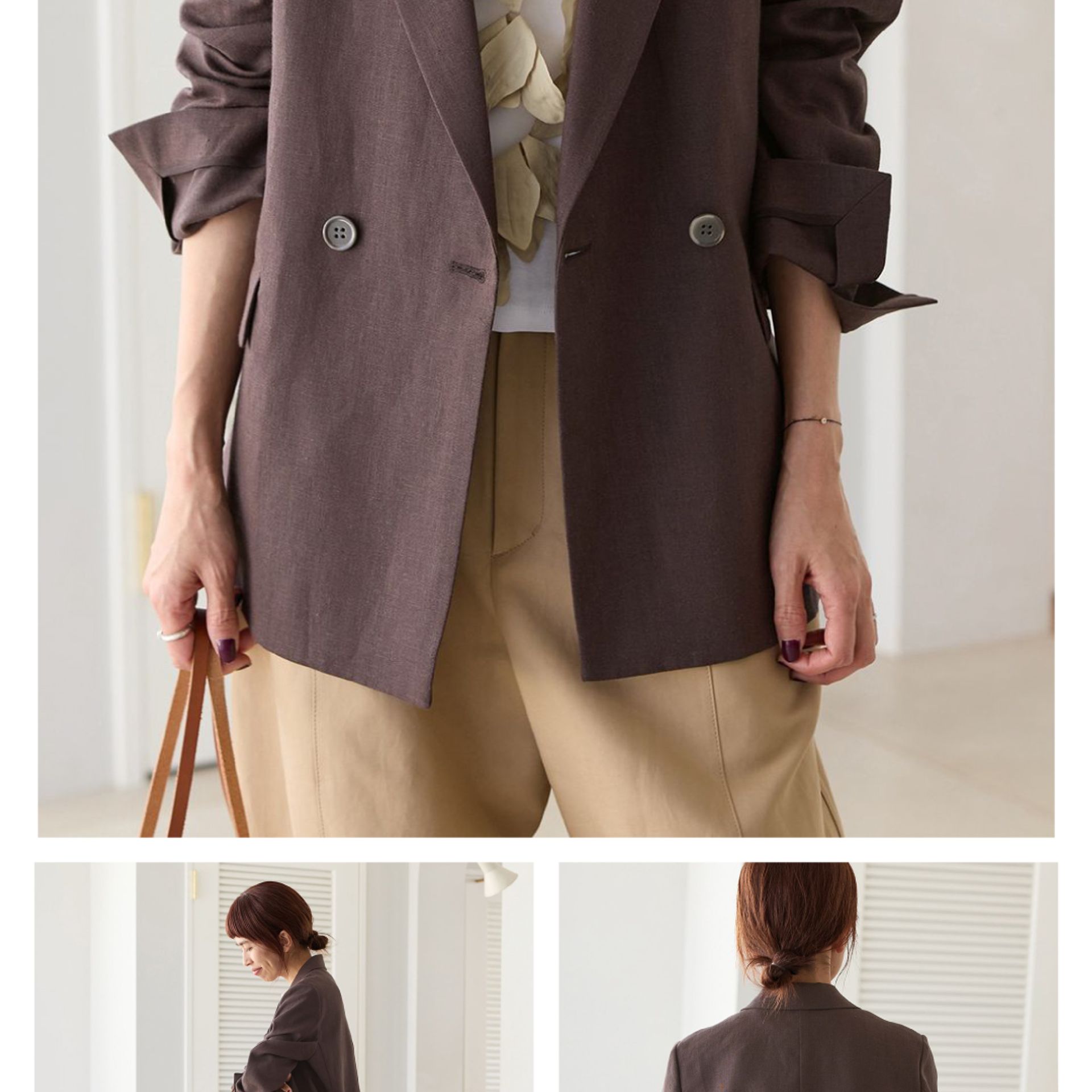 ダブル仕様でも堅くなりすぎず、さっと羽織るだけで自然な抜け感のあるスタイルに。