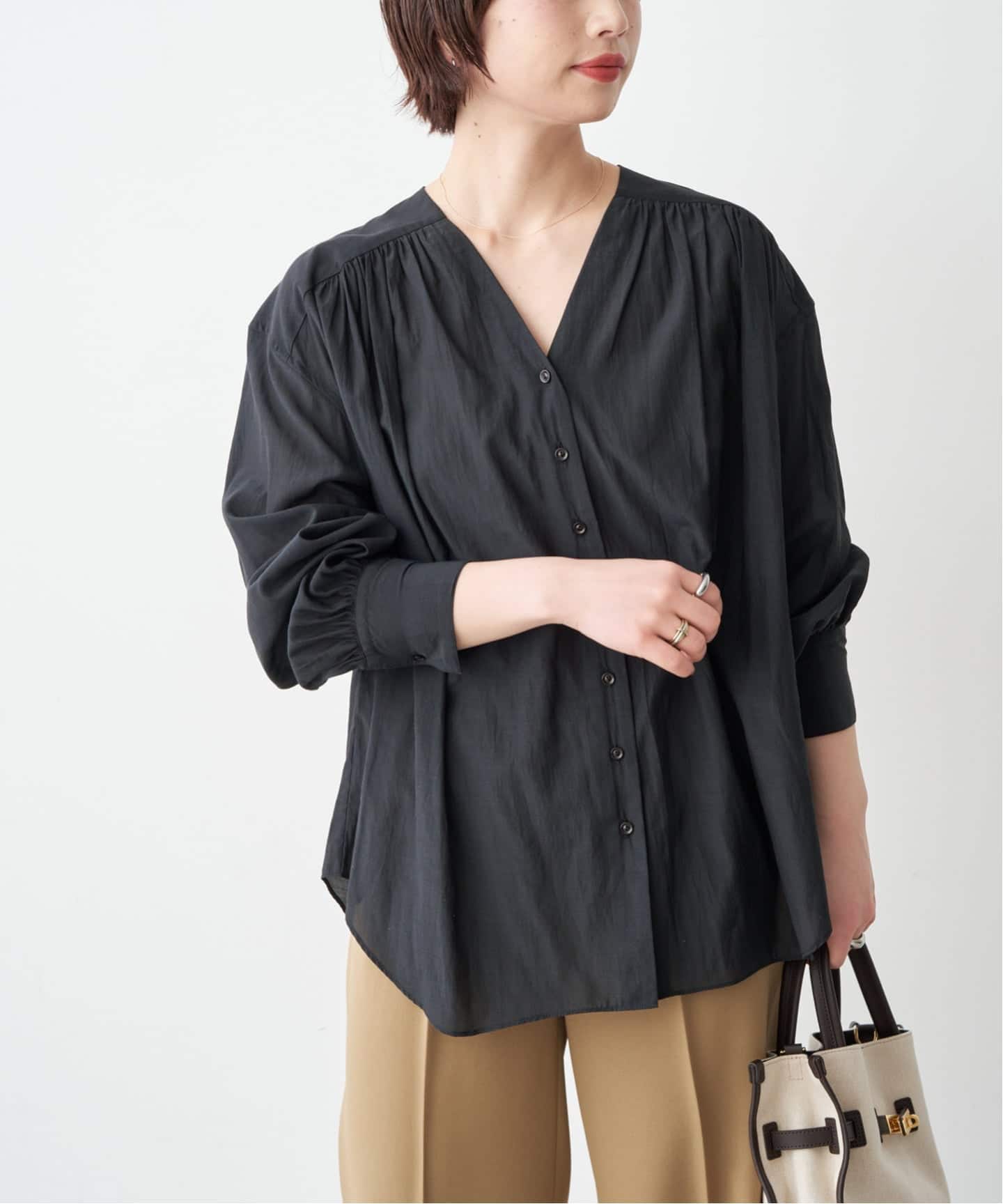 オンオフ問わず活躍してくれる、ワードローブに加えておきたい万能ブラウスです。