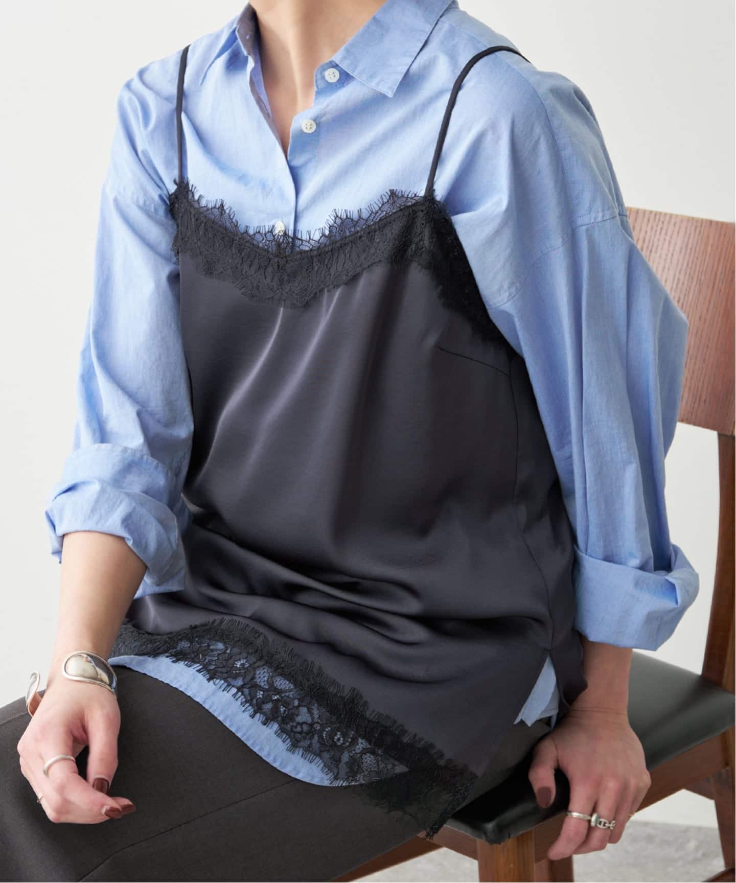 続いて、スタイリングのポイントになるサテンレースキャミソールや、動きのあるシルエットのバックタックブラウスなど、