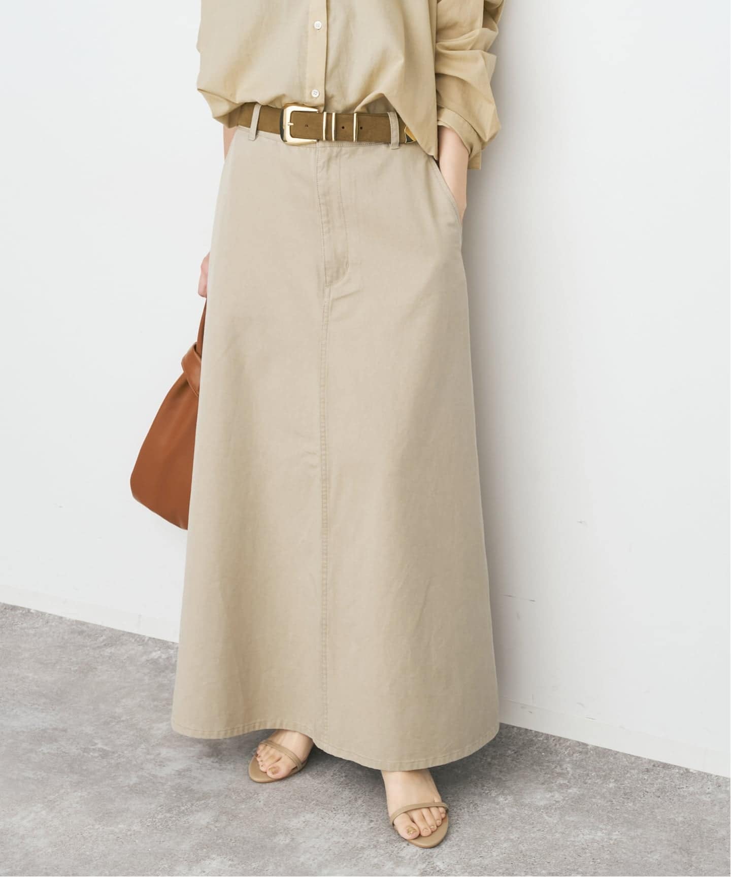 シンプルなトップスに合わせるだけで、今っぽいバランスに。
