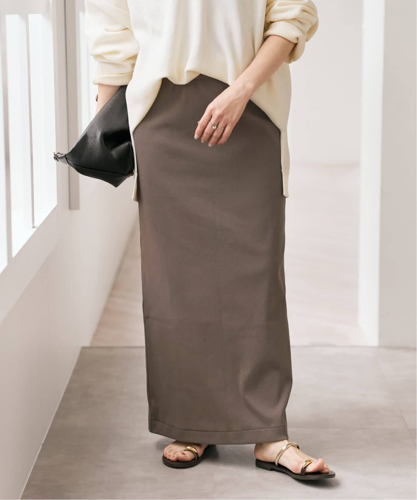 クリーンな白リネンシャツに、ブラウンのIラインスカートを合わせたシンプルなスタイル。