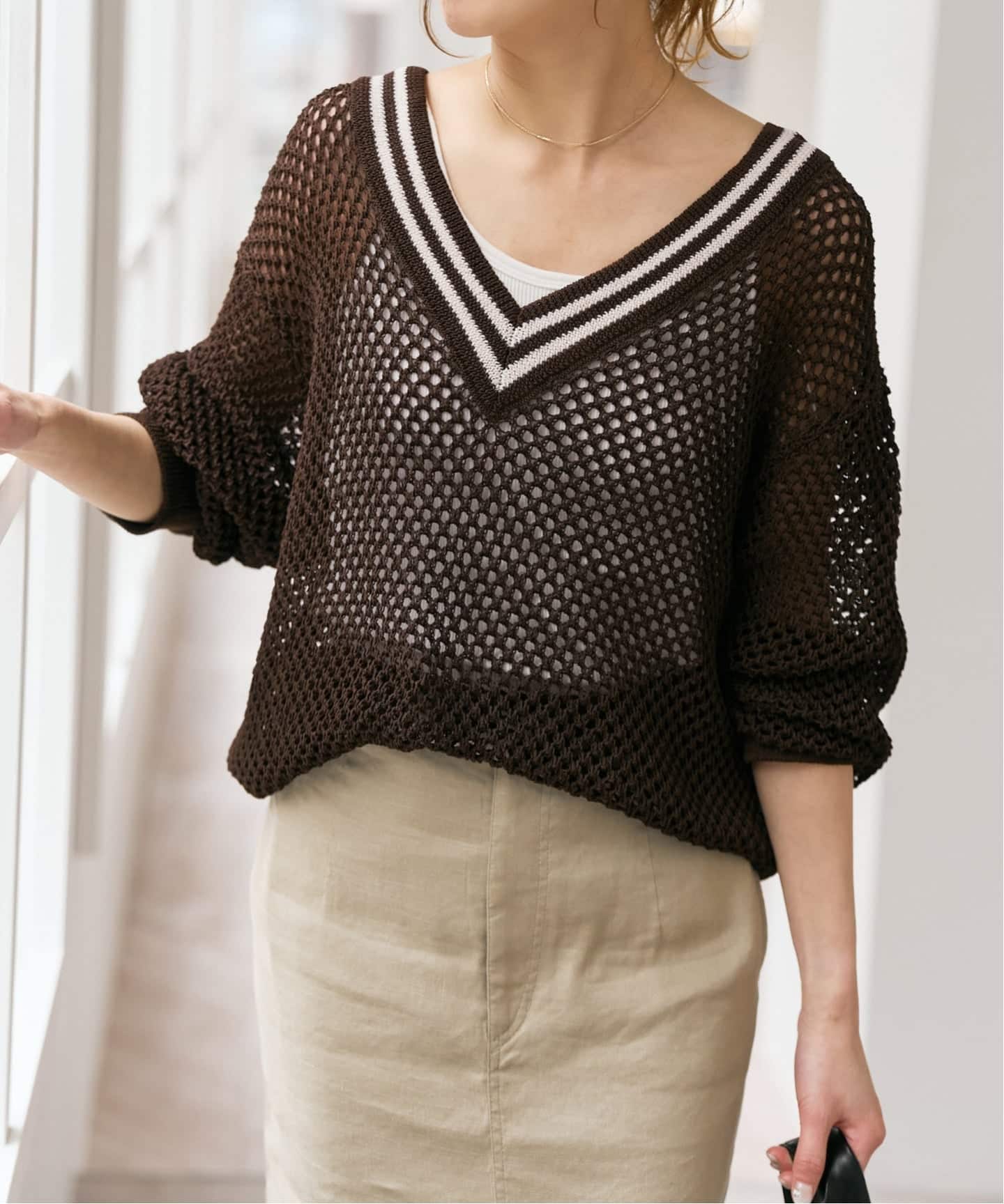 肩掛けしたブラウンニットでアクセントをプラスし、ボトムは今年らしいカーブシルエットのパンツで程よく抜け感のあるバランスに。