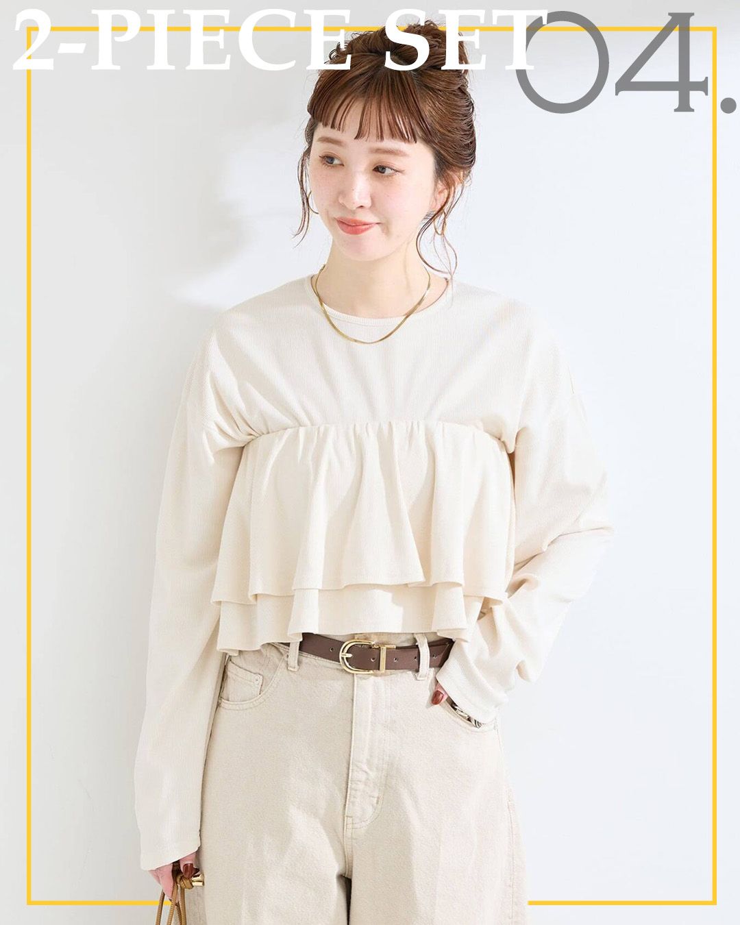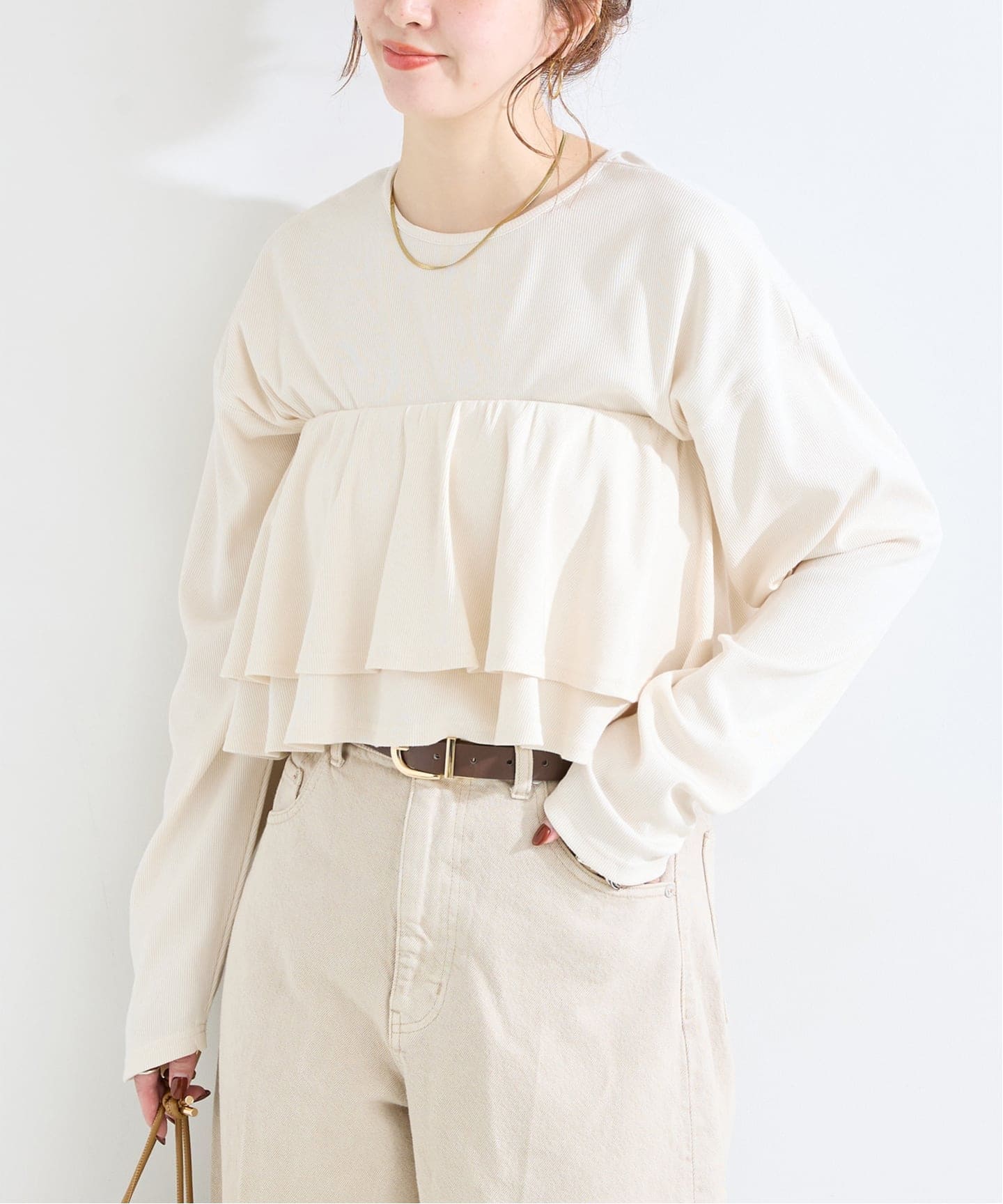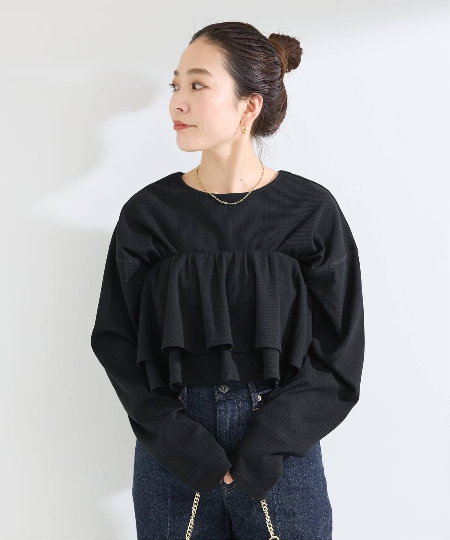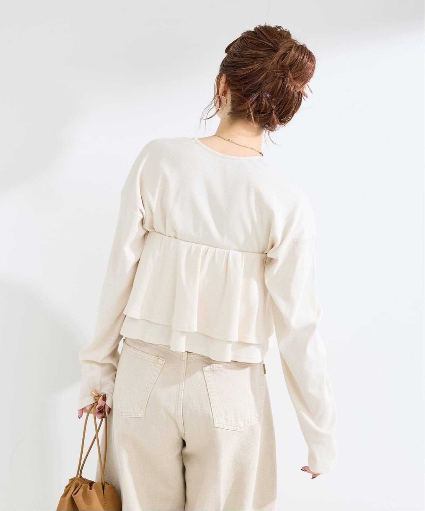 裾ラウンドのカットソーと二段フリルのカットソービスチェがセットになったアイテム。胸元でレイヤードしてビスチェとしてももちろん、ウエストまで下げて切り替え風にも。