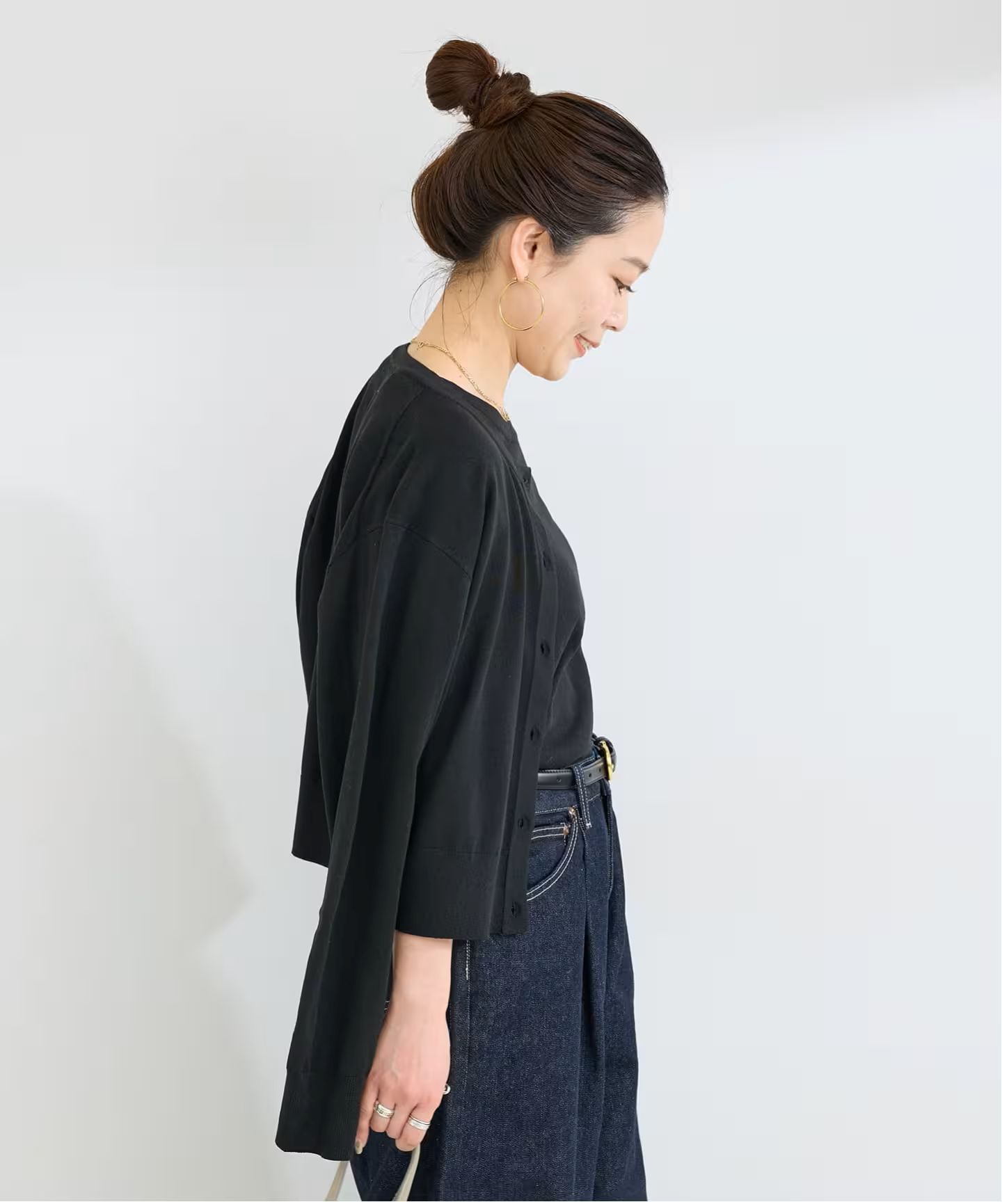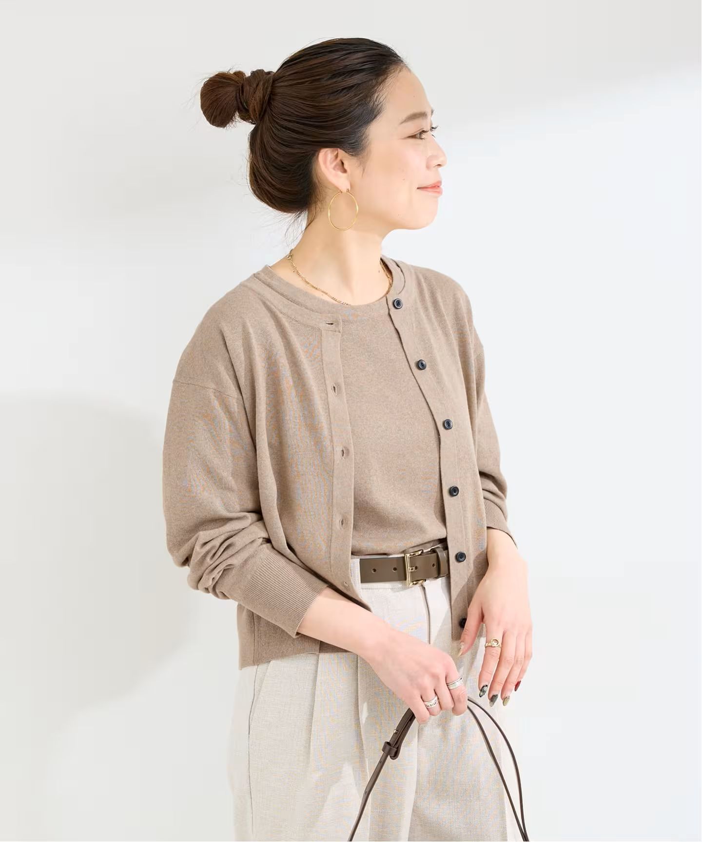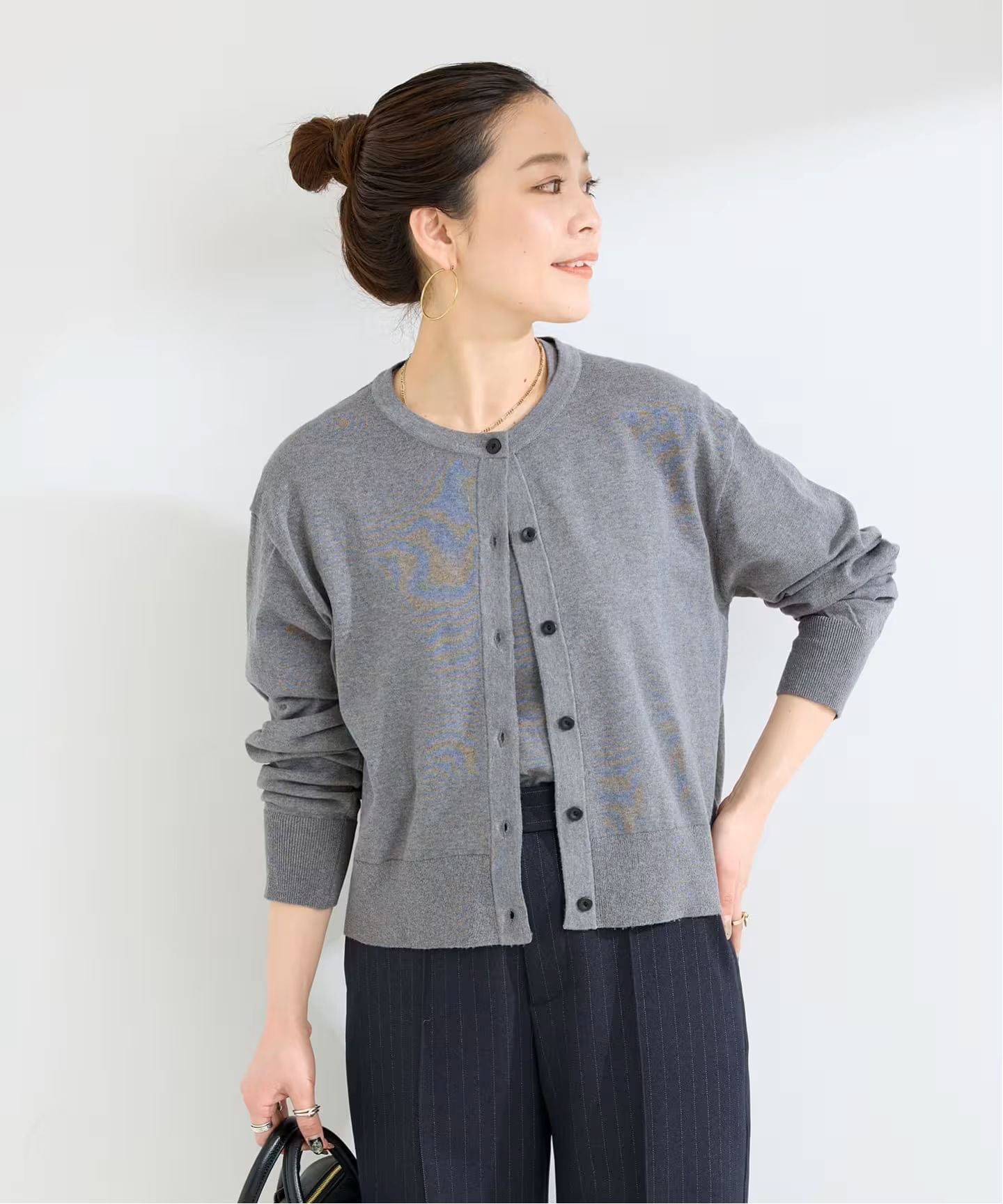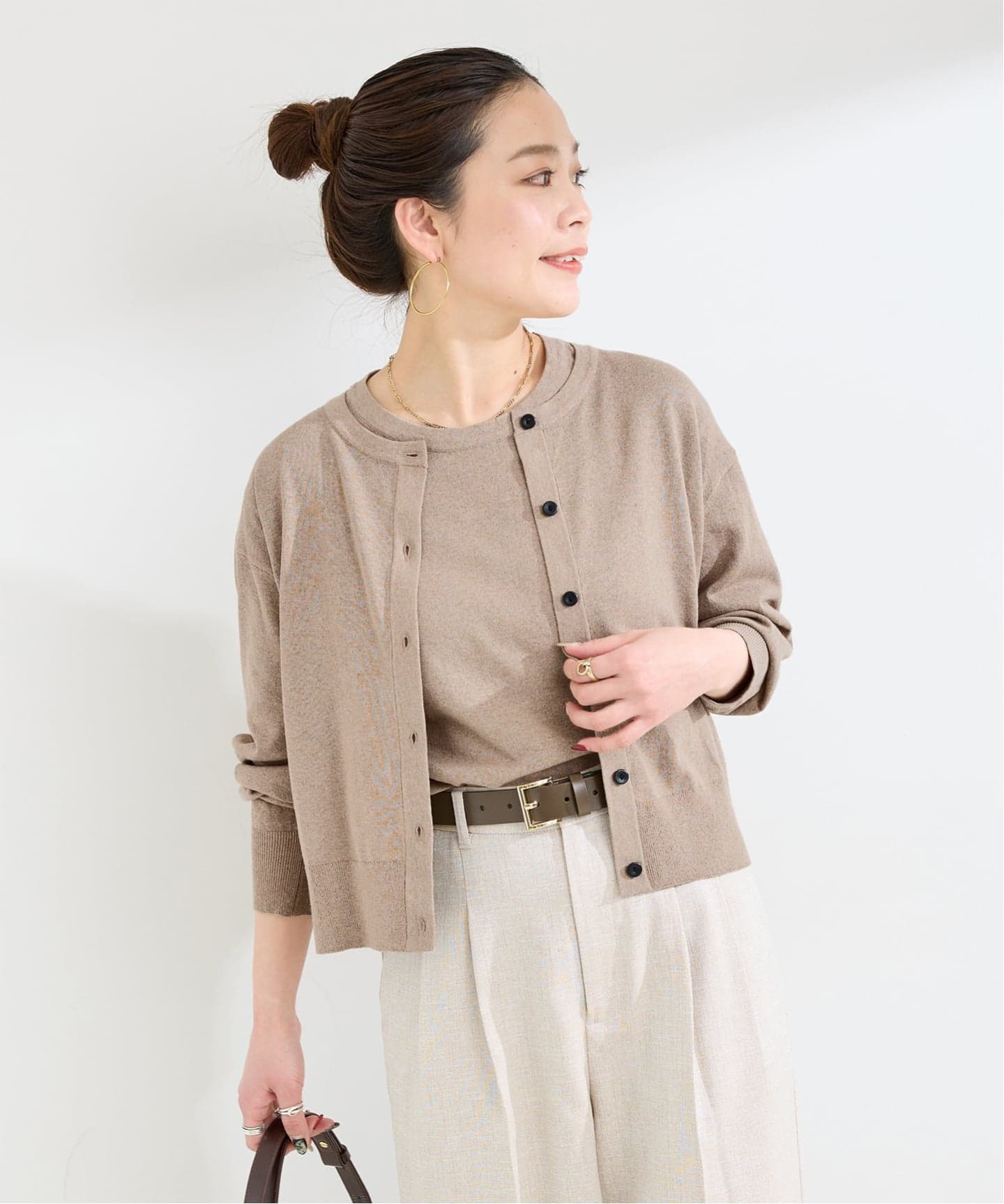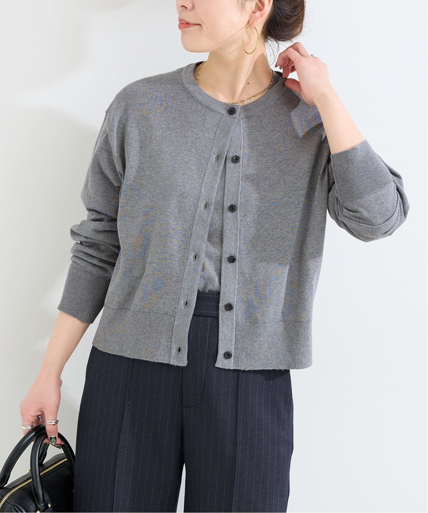 綿混の肌触りよい柔らかめのタッチで、透けにくく目が詰まっている素材感が特徴です。カーディガンは程よいゆとり感と少し今年らしい短めの着丈感にし、半袖プルオーバーは背中心にピンタックが入ったデザイン。単品でも着回しが効き、一枚あると便利なセットアイテムになります。