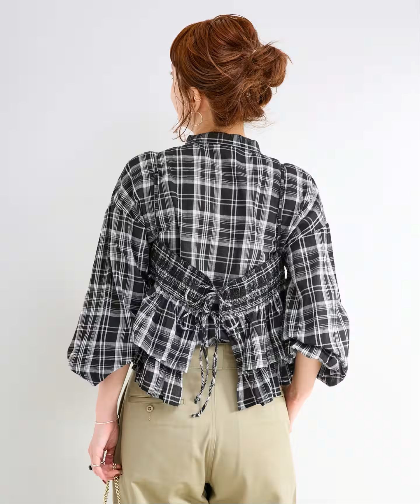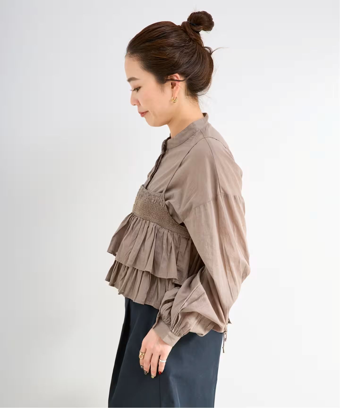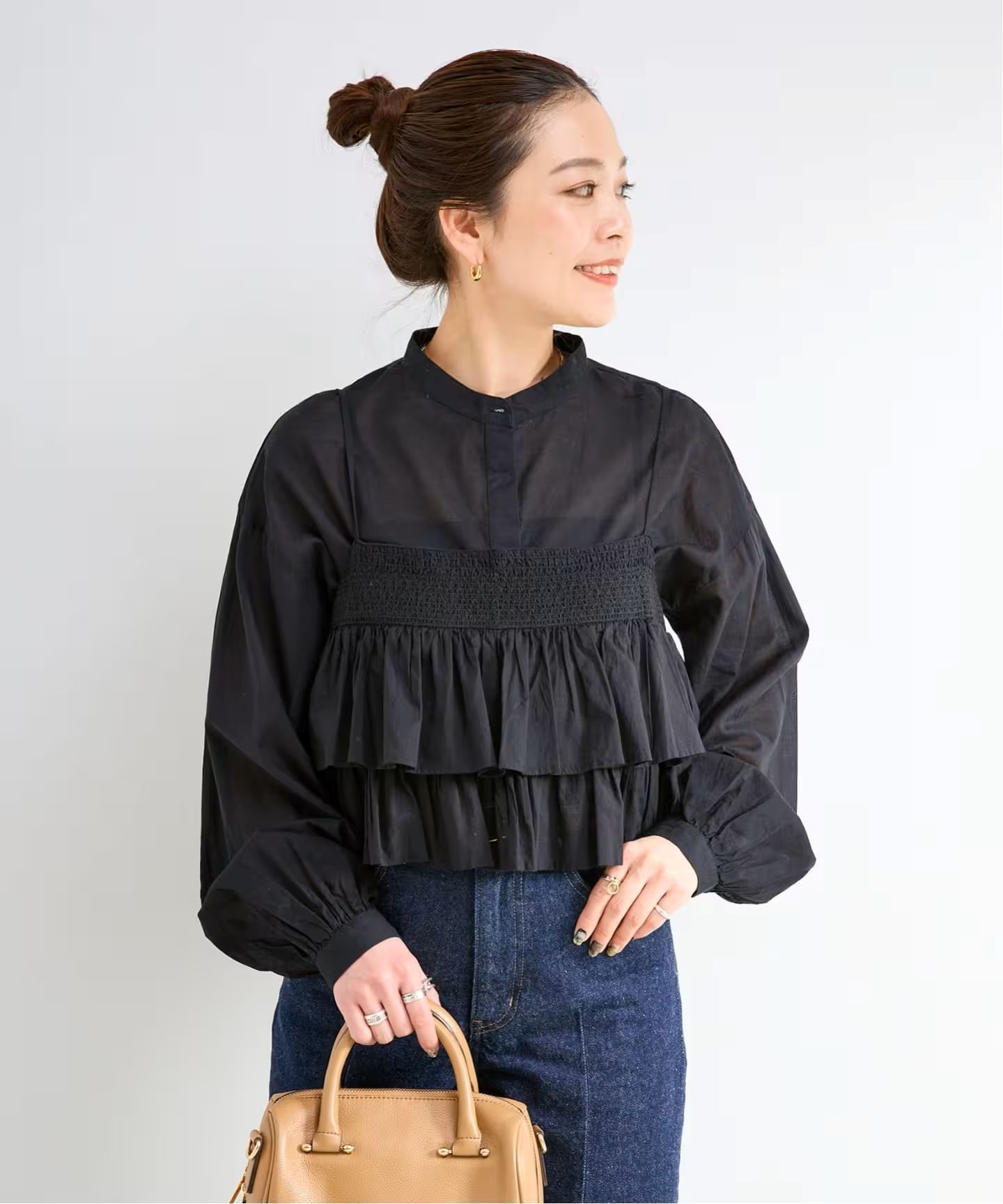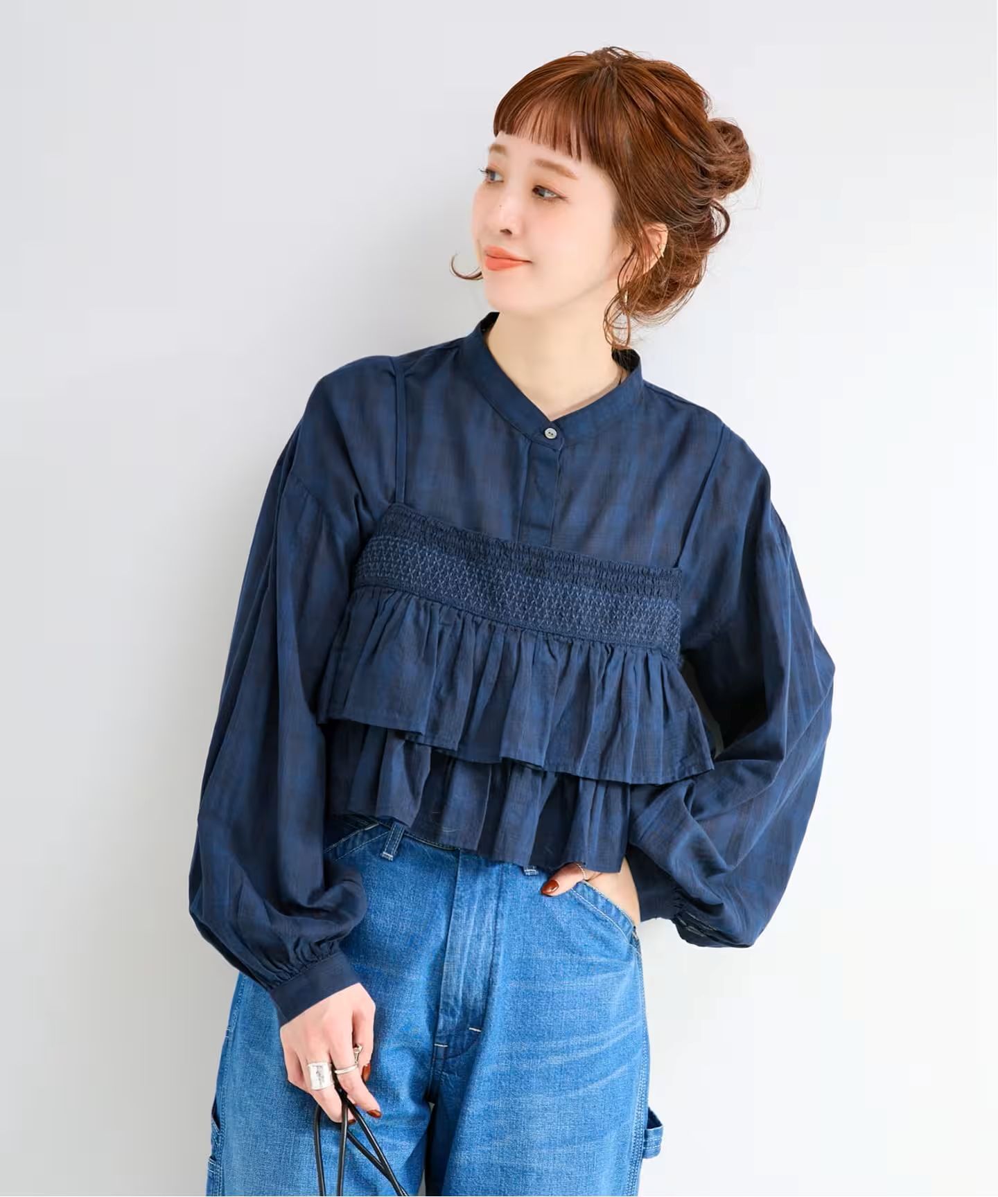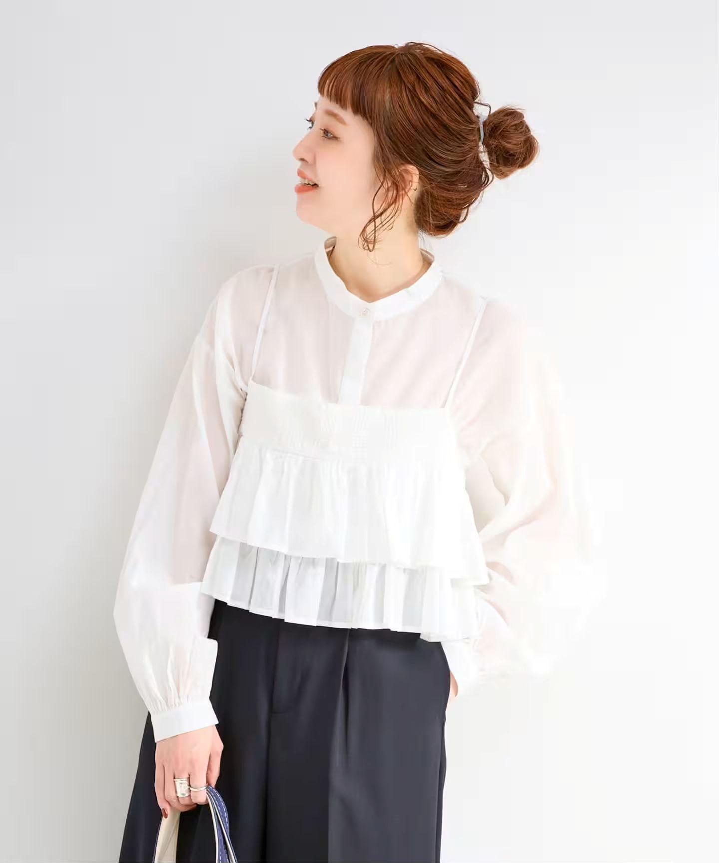 ウエストシェイプしたシルエットのブラウスはスタンドカラーでシンプルなディテールにし、セット着でも甘すぎないテイストにしており単品でも着回しができます。フリルキャミソールはTシャツやカットソーとレイヤードしてもおすすめです。