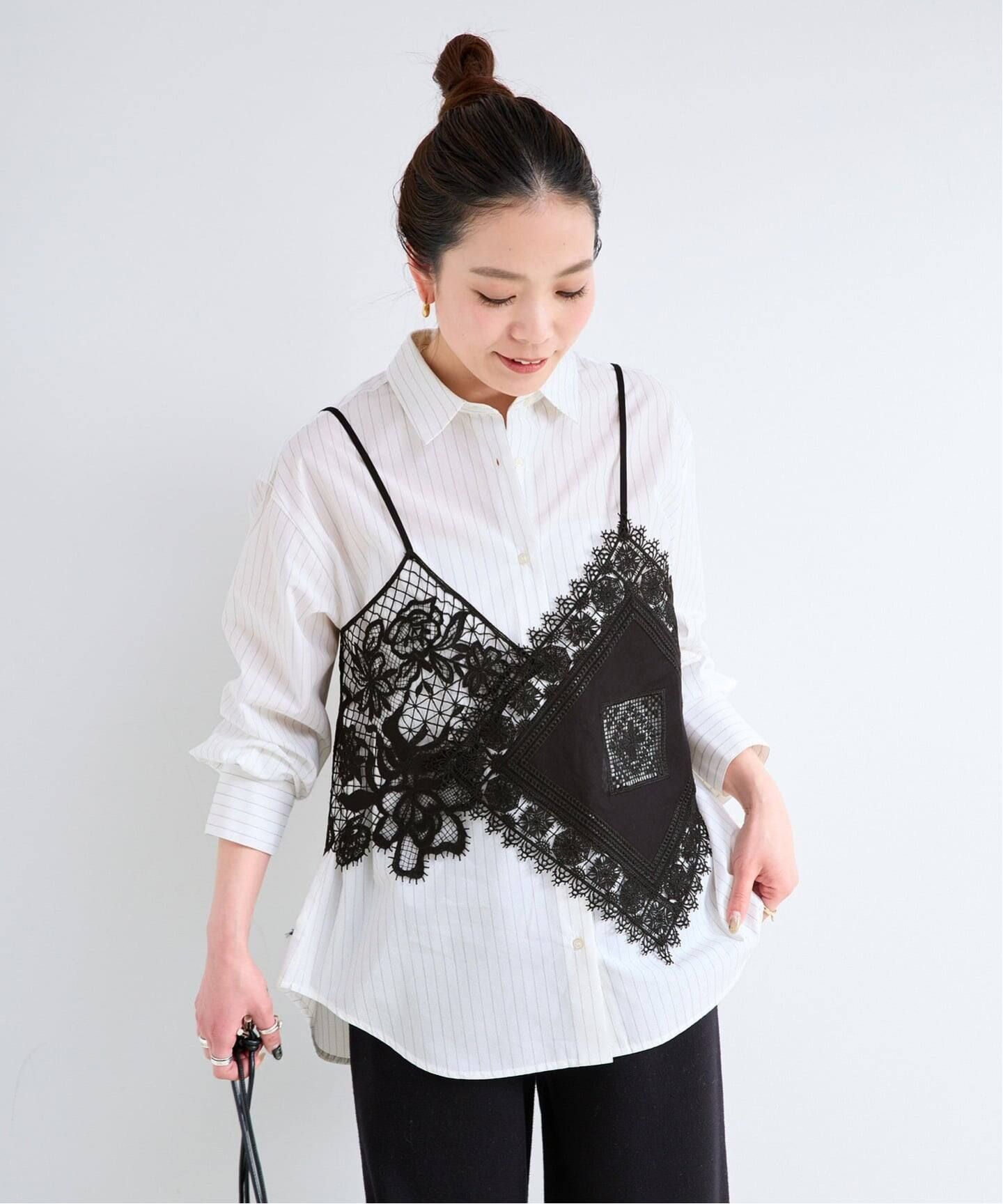 レースキャミソール×コットンシャツのレイヤードセット。
