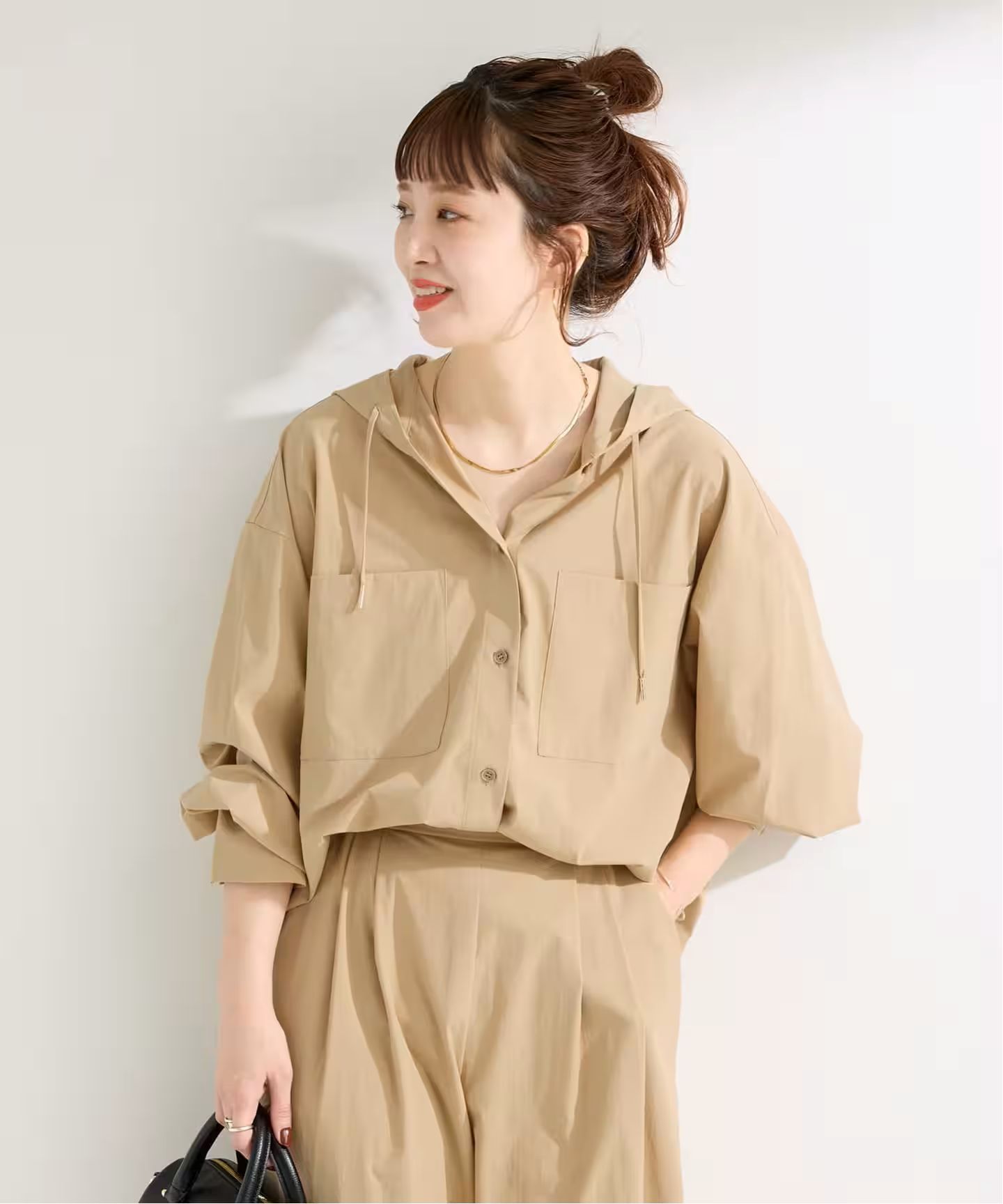 撥水素材のため軽い雨や水はねを気にせず着用でき、日常使いはもちろん、旅行やお出かけ、アクティブなシーンにも活躍。リラックス感ときちんと感を兼ね備えた、大人のための上品カジュアルセットアップです。