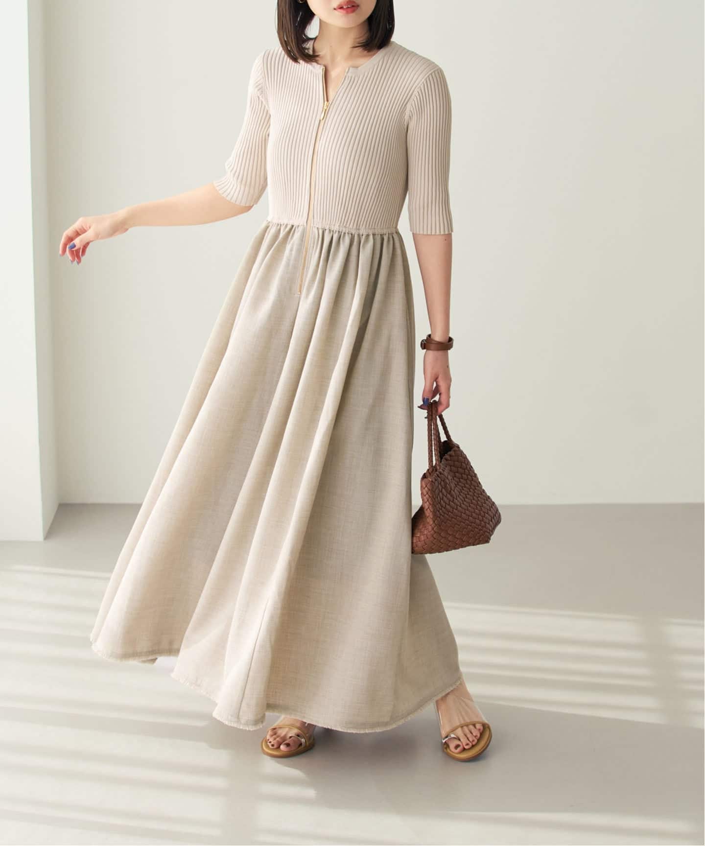 ドライタッチのリブニットとリネン調の布帛をドッキングした、これ1枚で表情のあるスタイリングが完成する異素材MIXワンピース。