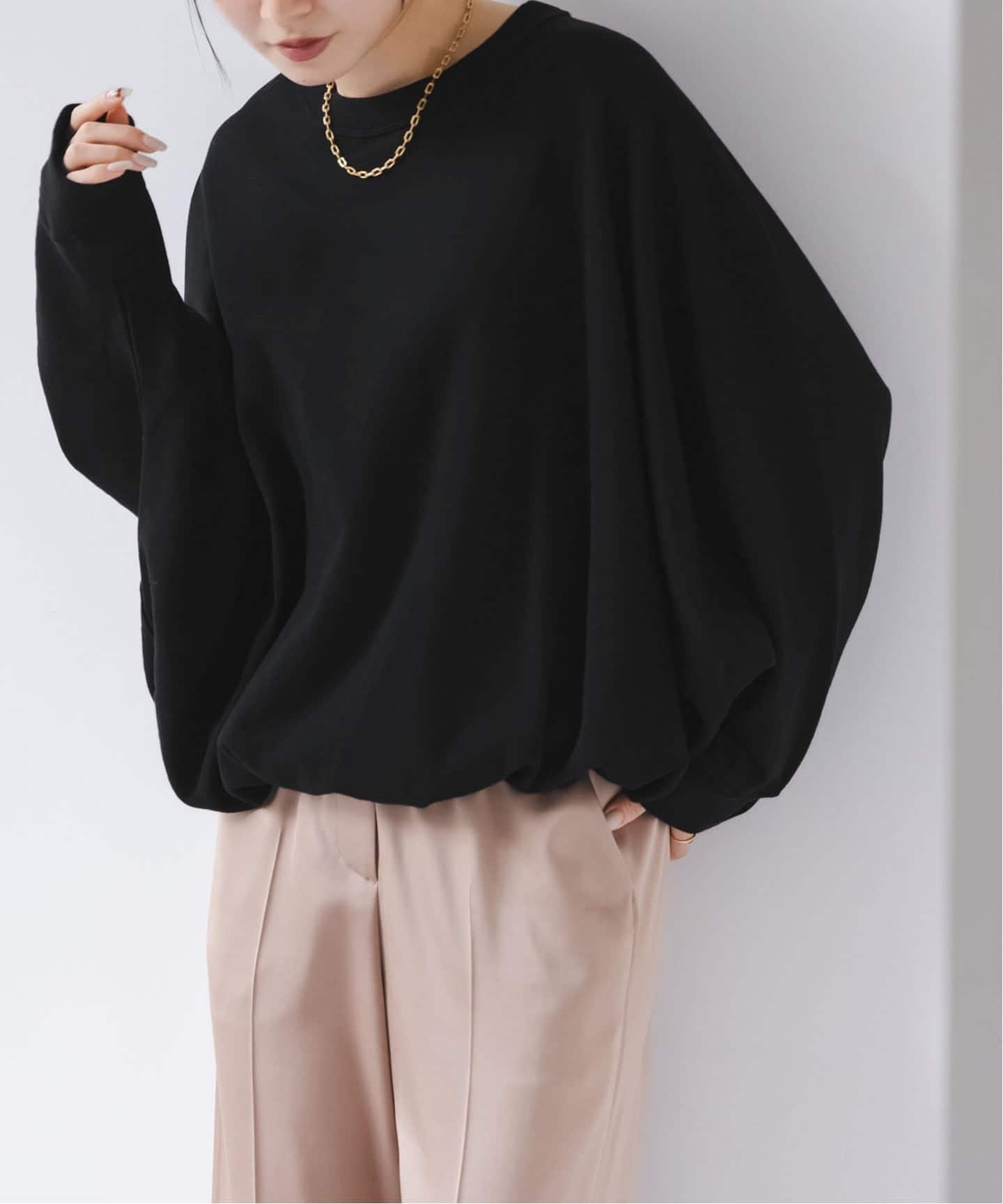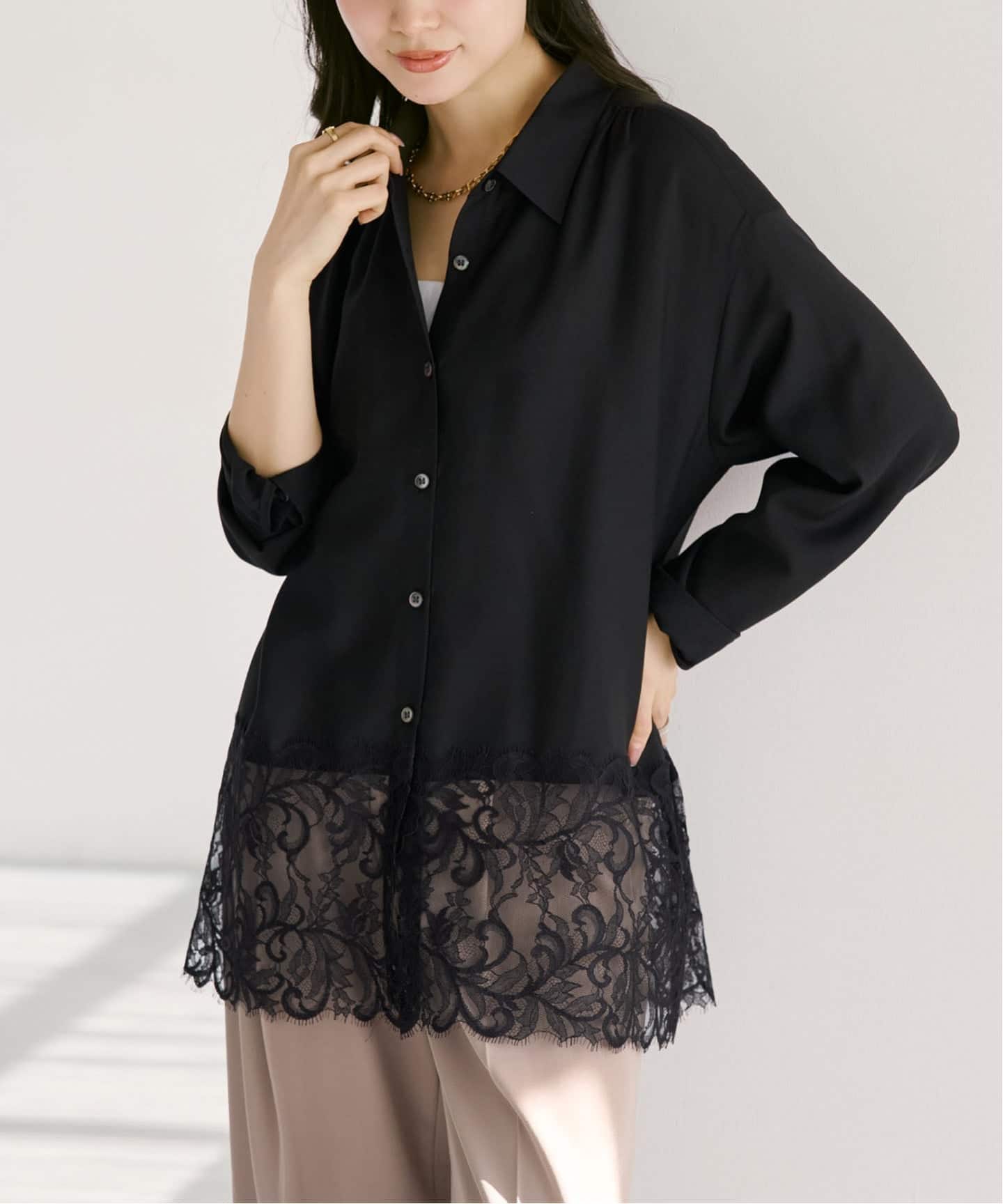 肩の切り替えに寄せたギャザーやカフスに入れたスリットなど、細やかな部分にまでこだわりを感じる大人に似合うブラウス。
