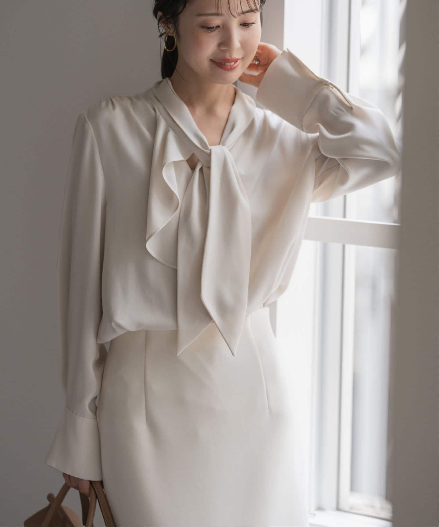 フロントを彩るボウタイ&フリルが視線を集める、上品な華やかさが自慢の1枚。