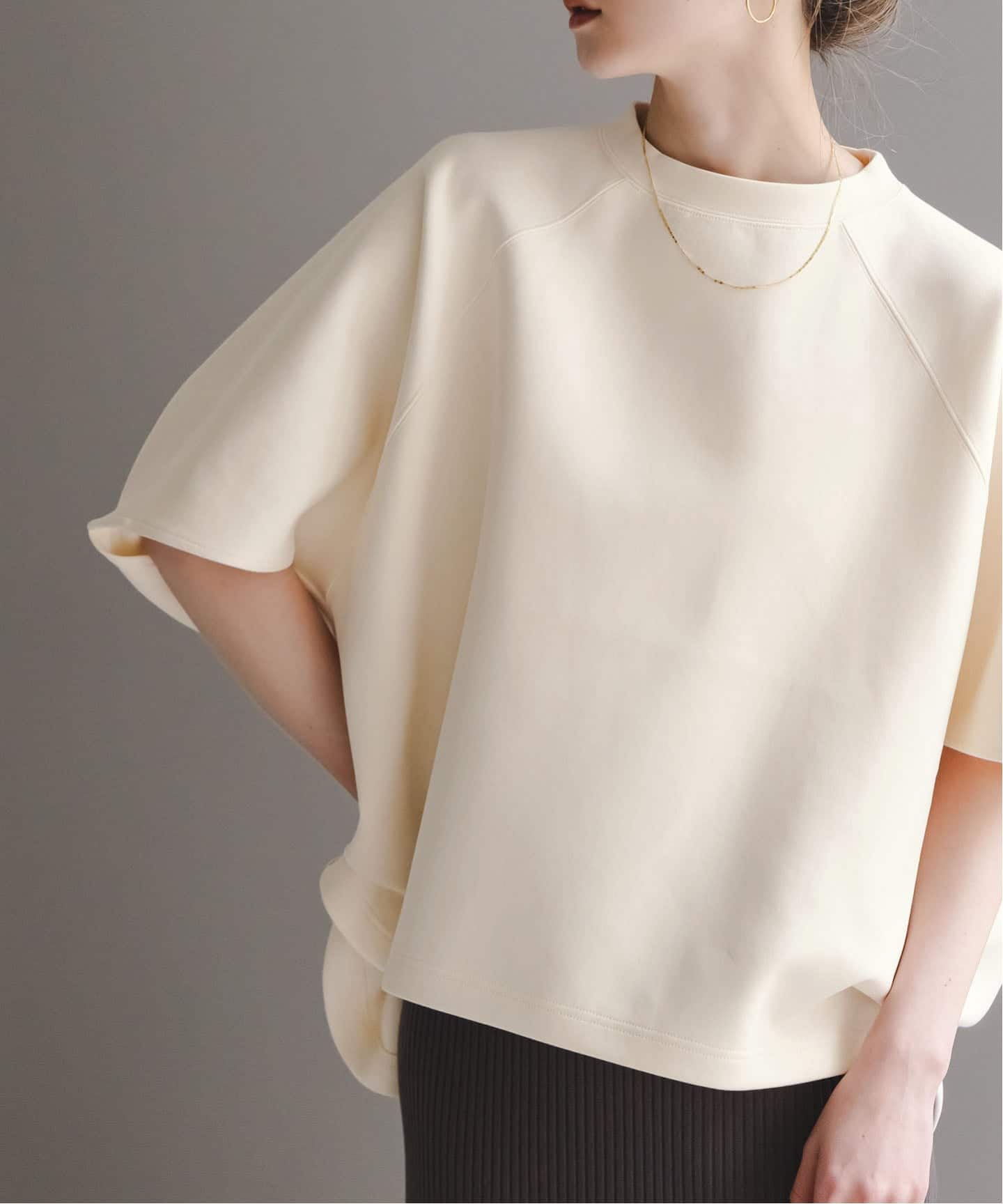 フロントサイドにはスリットを入れ、裾をきゅっと結ぶアレンジも可能。結んだ時にフロントに流れるようなドレープが出て、より一層表情のある着こなしを楽しめます。