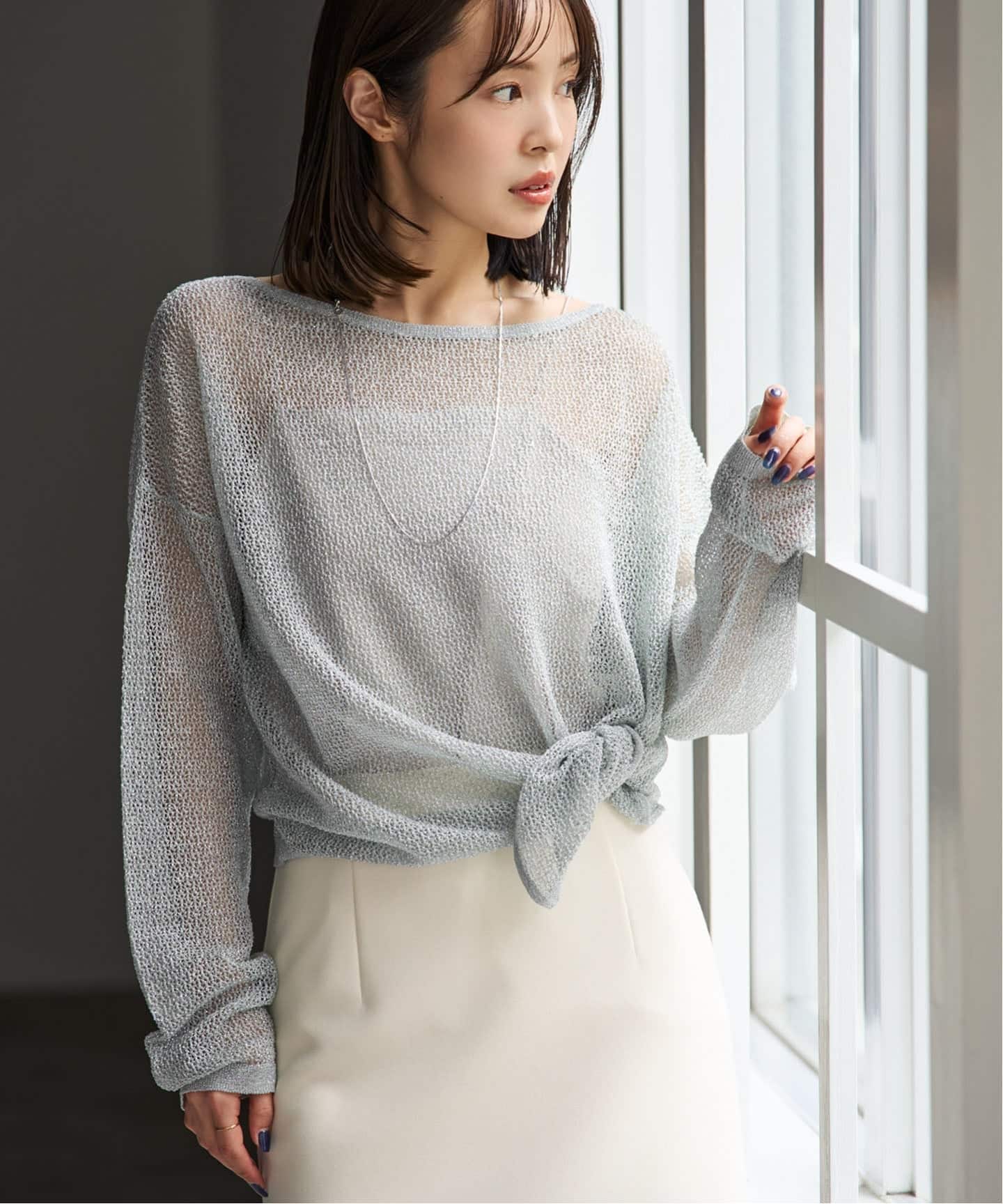 シルバーのラメ糸を全体にミックスした、さり気ない煌めきが可愛いサマーニット。