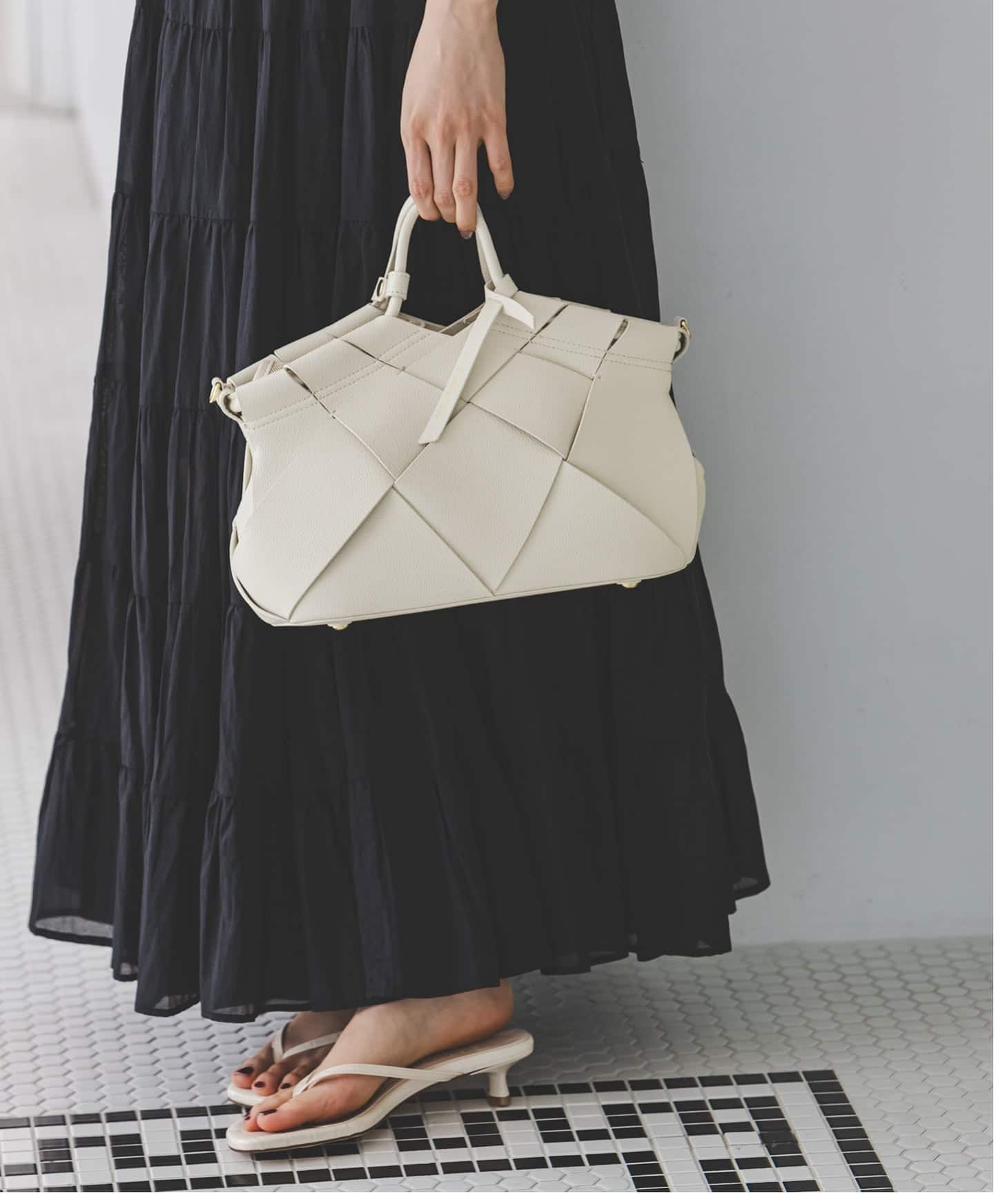 フロント部分に配したゴールドジップや風をはらんで優雅に揺らめくフレアシルエットなど、フェミニニティを盛り上げる要素が盛り沢山。