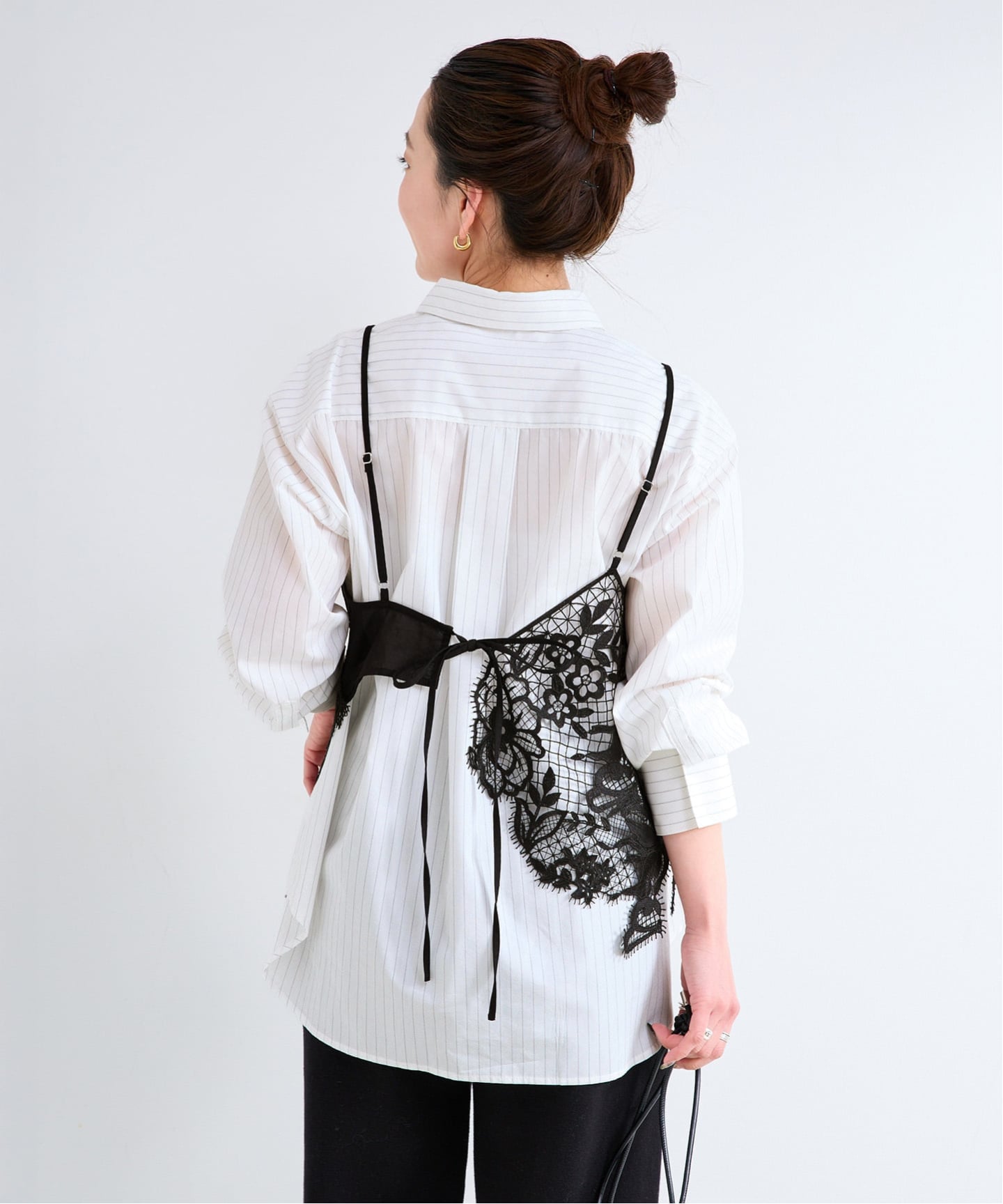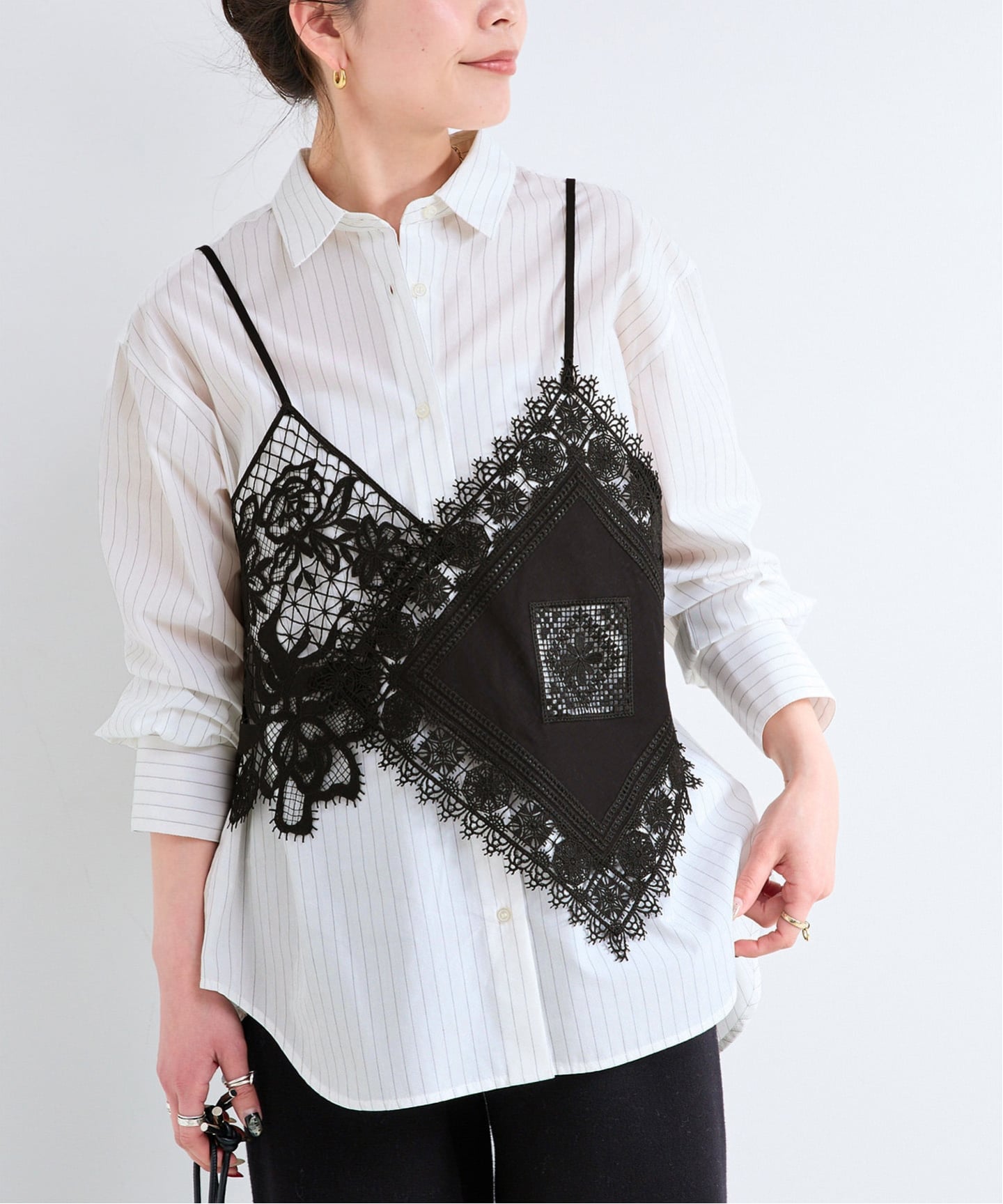シャツブラウスとレースキャミソールがセットになったレイヤードが楽しめるアイテム。