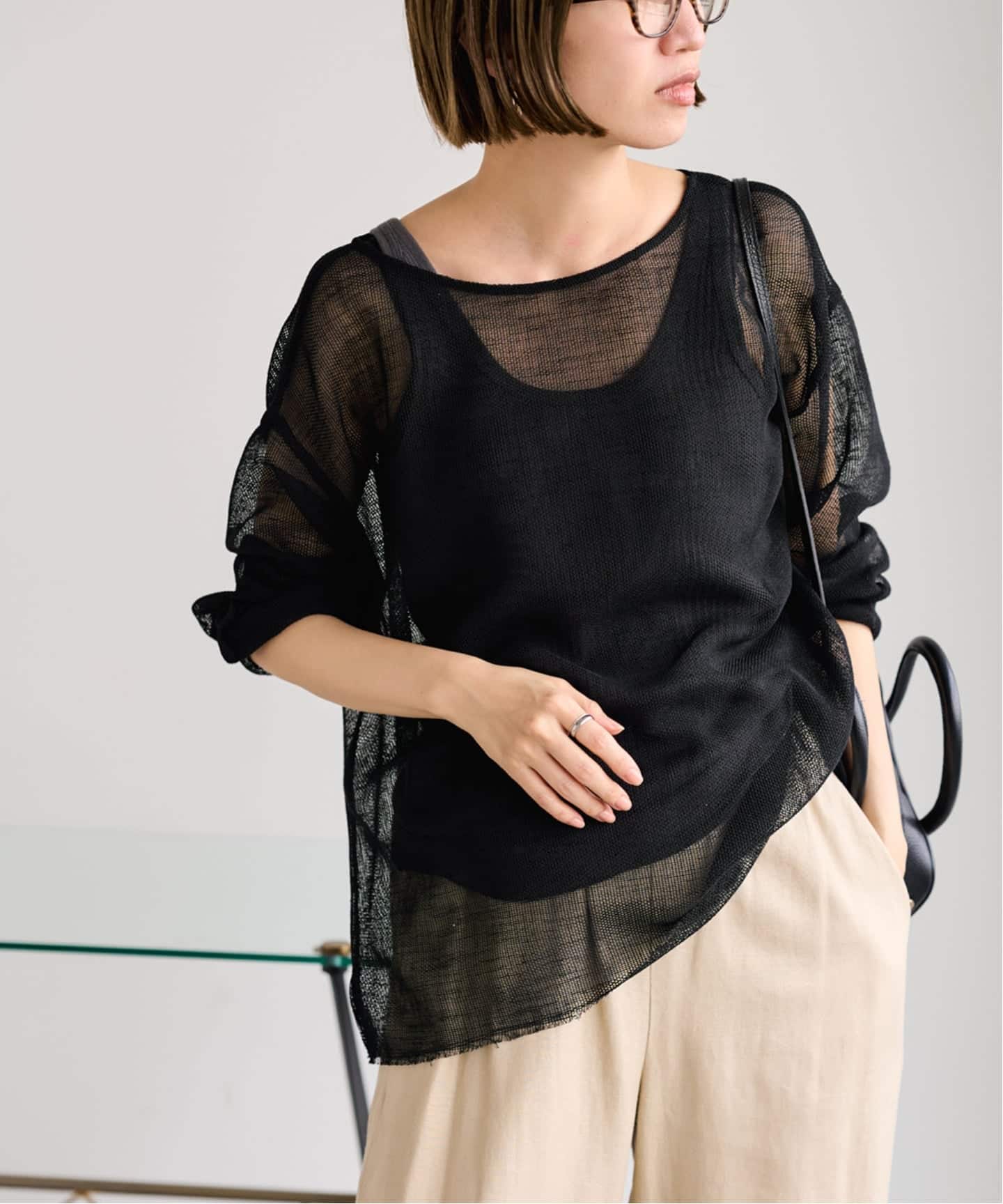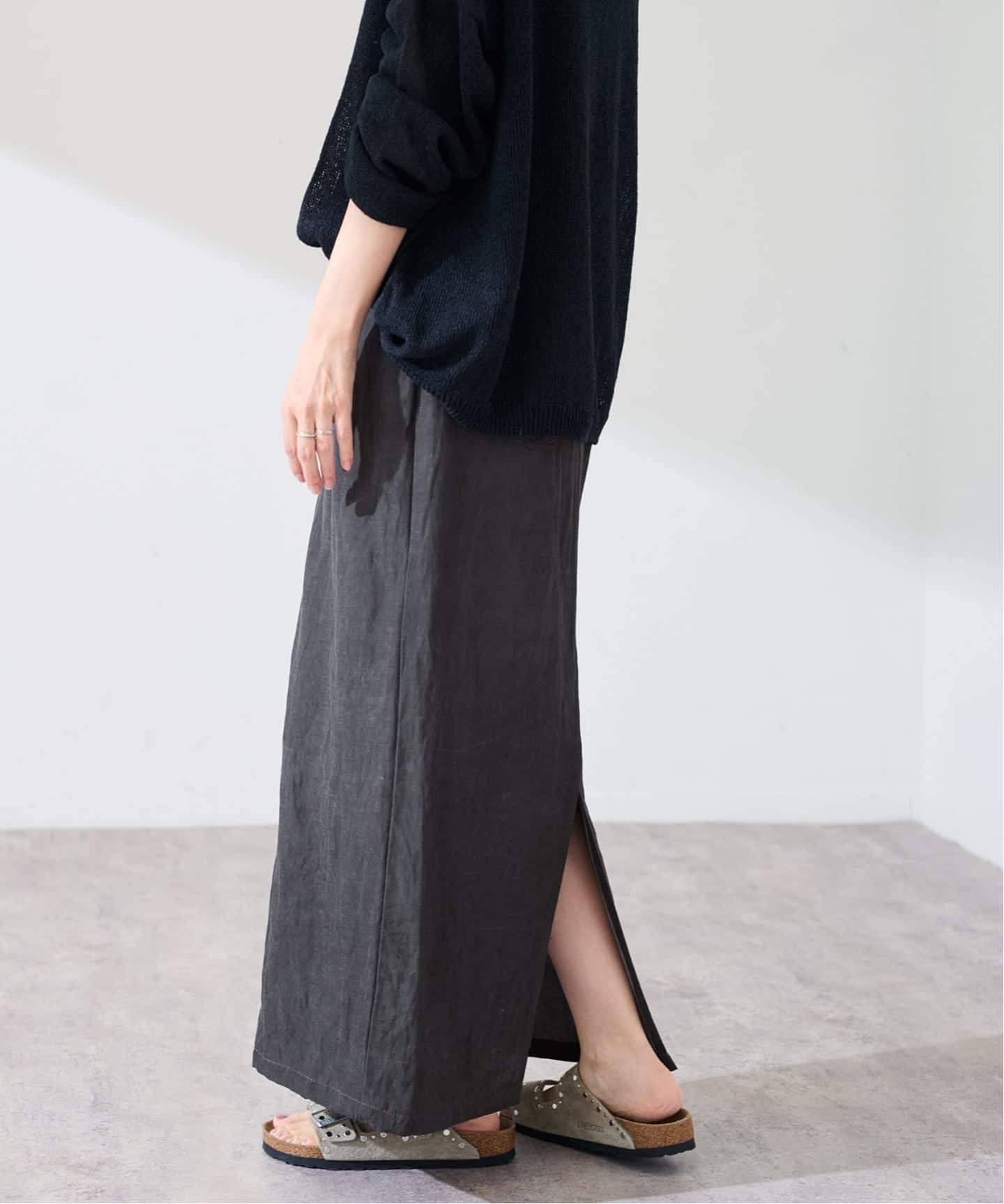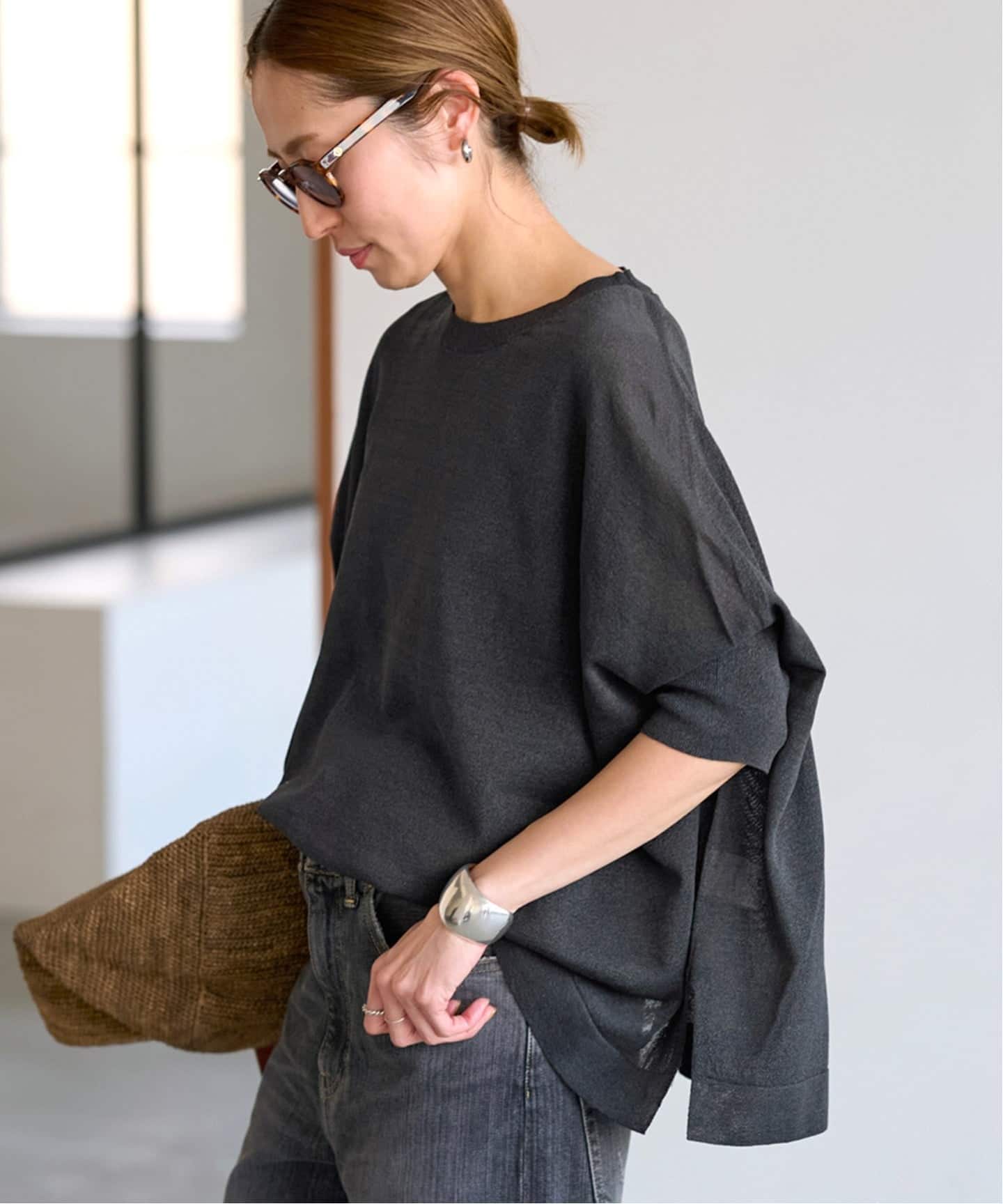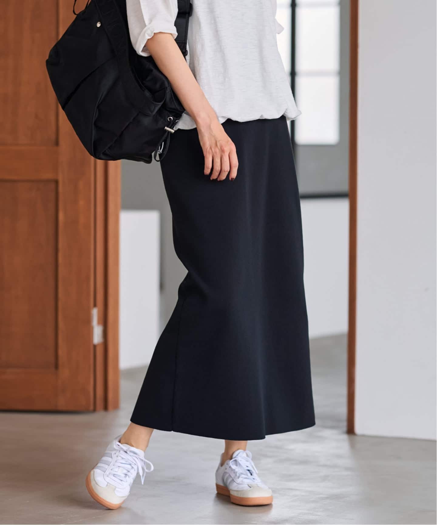 動くたびに表情が出る異素材コンビが、シンプルながらも奥行きのある印象をつくります。
